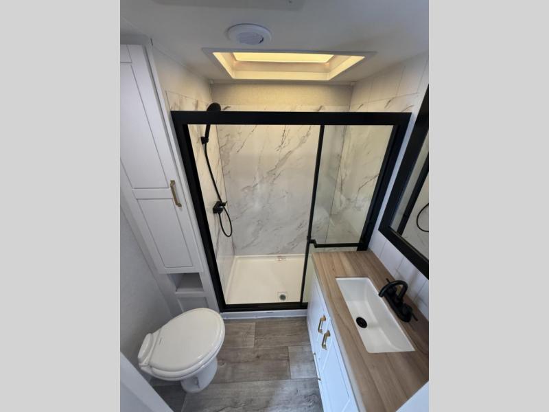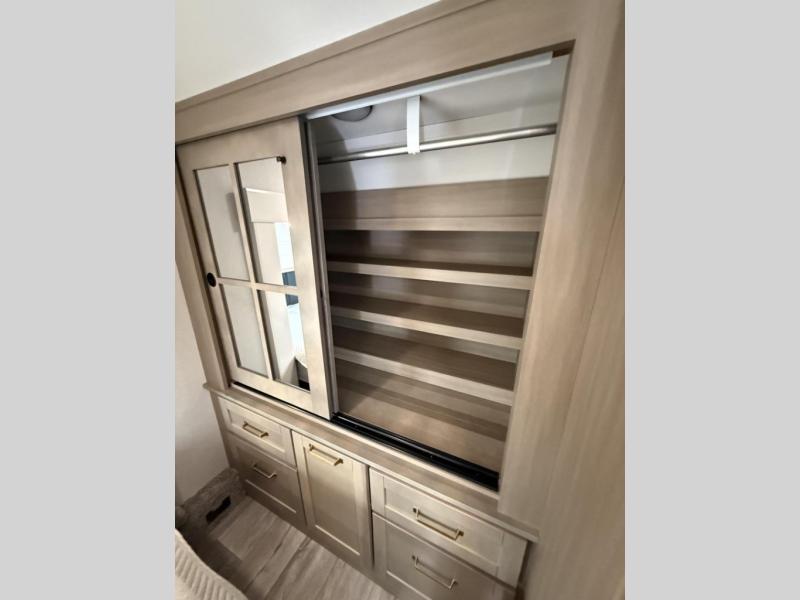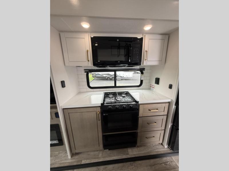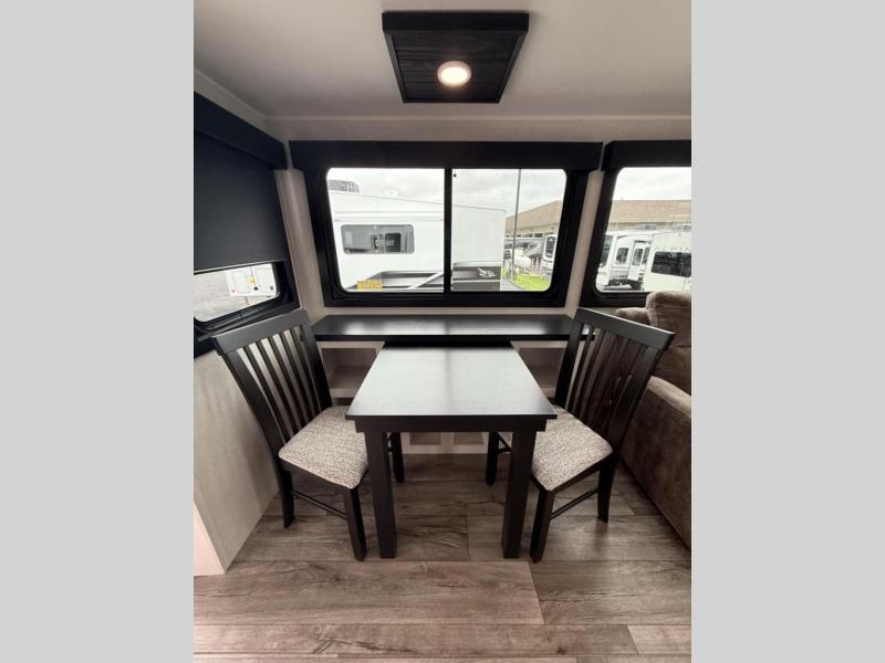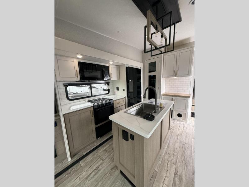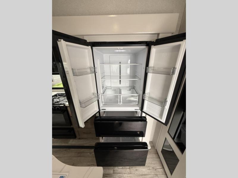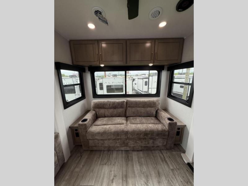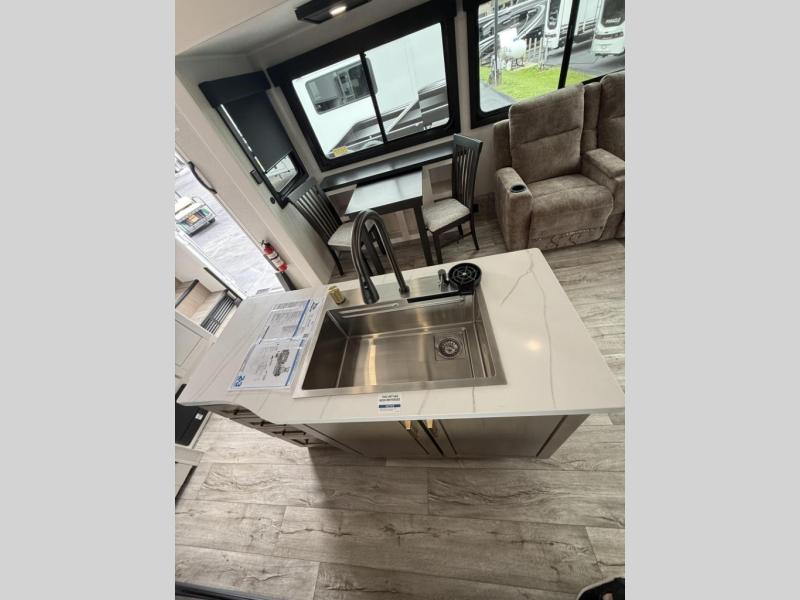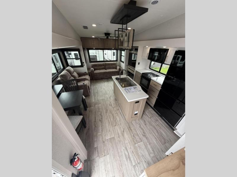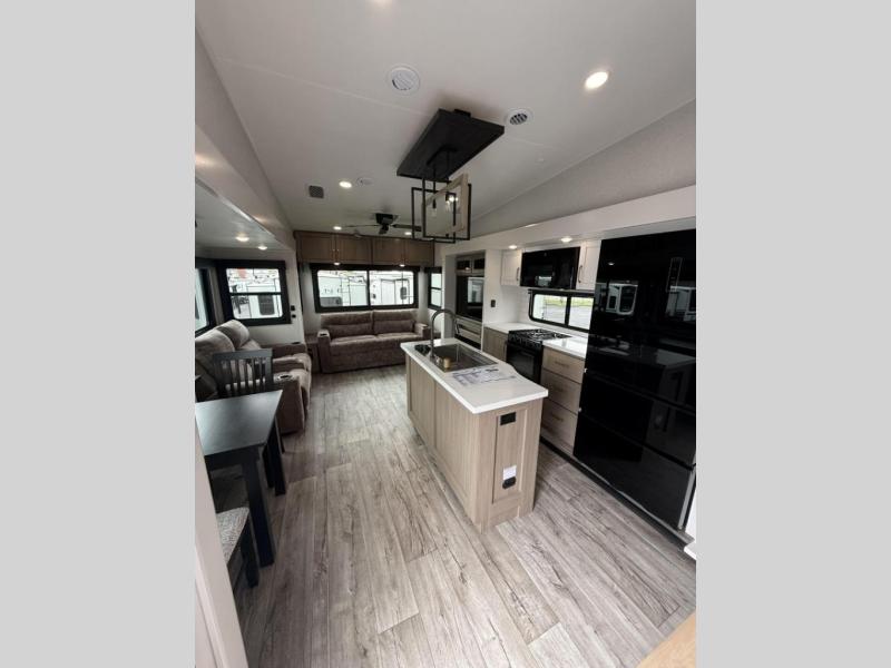 Triple slides for space, plenty of seating spaces, plus a spacious private bedroom make this fifth wheel one you won't want to pass up! You can freshen up each day in the full bath that includes a residential style glass shower door, a bathroom skylight, and a medicine cabinet to keep this space organized. Once you've cut up some fresh fruit at the kitchen island, whip up some eggs and bacon for breakfast, or just grab the cereal from the pantry. There is a spacious 16 cu. ft. 12V refrigerator, plus a hutch where you can store your own coffee machine. Relax on the tri-fold sofa, theater seat, or roll top dinette table with chairs before heading out for the day. The king bed slide out in the front private bedroom will be waiting for you when you return!
