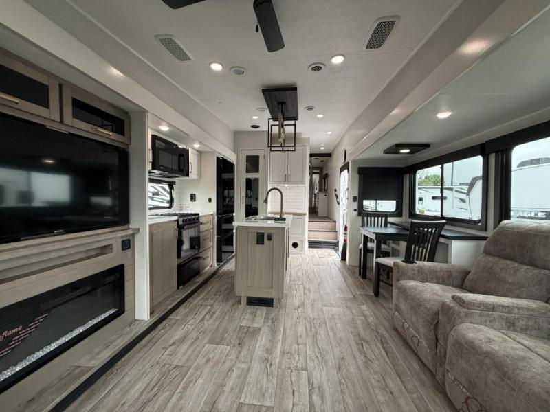 With any Eagle fifth wheel by Jayco you will appreciate durable construction materials, like the Magnum Truss Roof and the Stronghold VBL laminated walls. The JAYCOMMAND Smart RV system puts you in control of your RV's functions, and the 4 Star Handling Package will provide smooth towing from home to camp. Each model features Climate Shield zero-degree tested weather protection and the industry-exclusive HELIX cooling system that features two 15,000 BTU Whisper Quiet A/C's to keep you comfortable during those colder months. Some of the exterior conveniences you are sure to love are the pass-through storage with Slam-Latch baggage doors and an automotive style front cap with max turn radius. The Eagle fifth wheels are designed to make you feel at home with solid surface countertops, residential vinyl flooring throughout, 100% no floor vents, and blackout roller shades with reflective side throughout for added privacy and insulation.