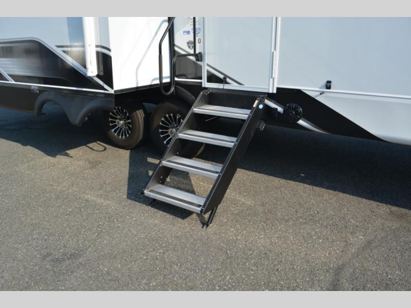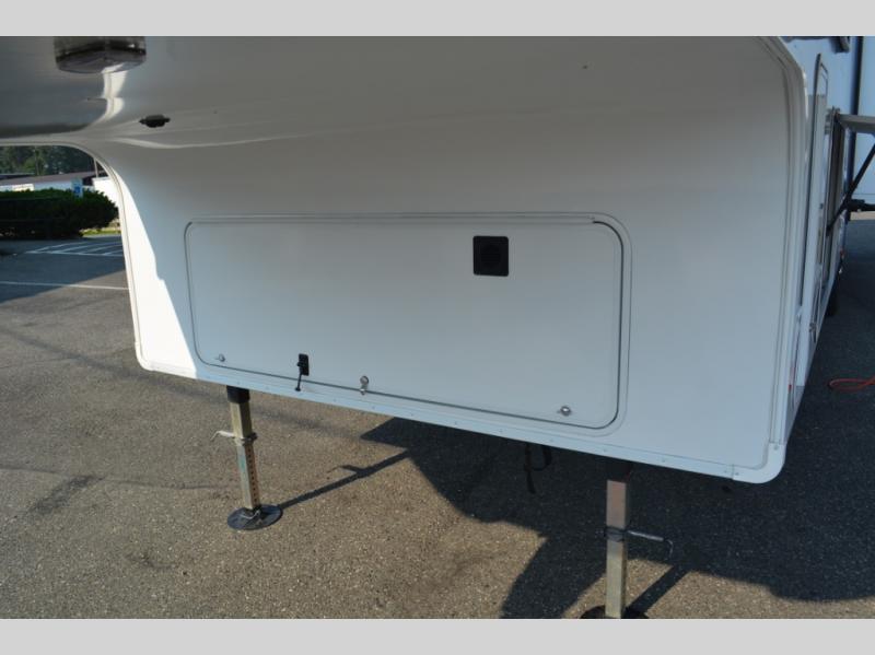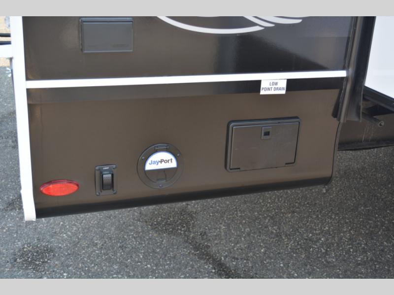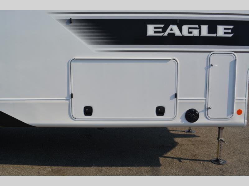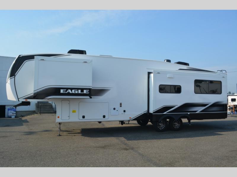 With any Eagle fifth wheel by Jayco you will appreciate durable construction materials, like the Magnum Truss Roof and the Stronghold VBL laminated walls. The JAYCOMMAND Smart RV system puts you in control of your RV's functions, and the 5 Star Handling Package will provide smooth towing from home to camp. Each model features Climate Shield zero-degree tested weather protection and the industry-exclusive HELIX cooling system that features two 15,000 BTU Whisper Quiet A/C's to keep you comfortable year around. Some of the exterior conveniences you are sure to love are the pass-through storage with Slam-Latch baggage doors and an automotive style front cap with max turn radius. The Eagle fifth wheels are designed to make you feel at home with solid hardwood slide fascia, residential vinyl flooring throughout, 100% no floor vents, and blackout roller shades with reflective side throughout for added privacy and insulation.
