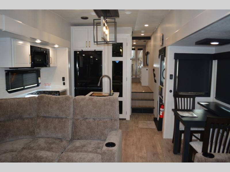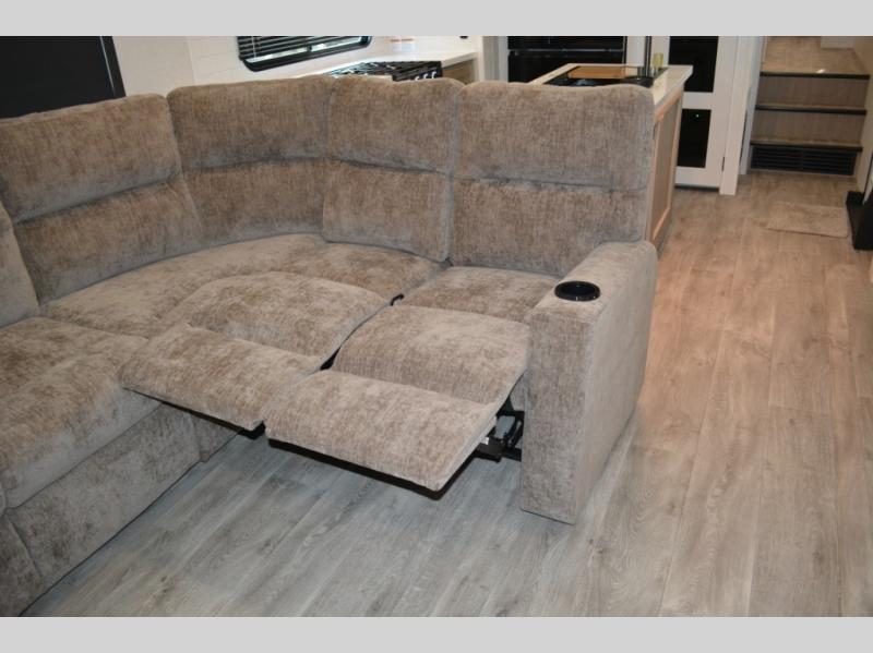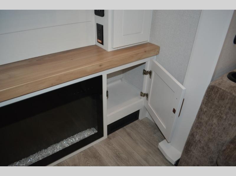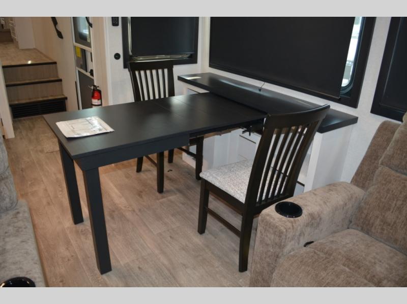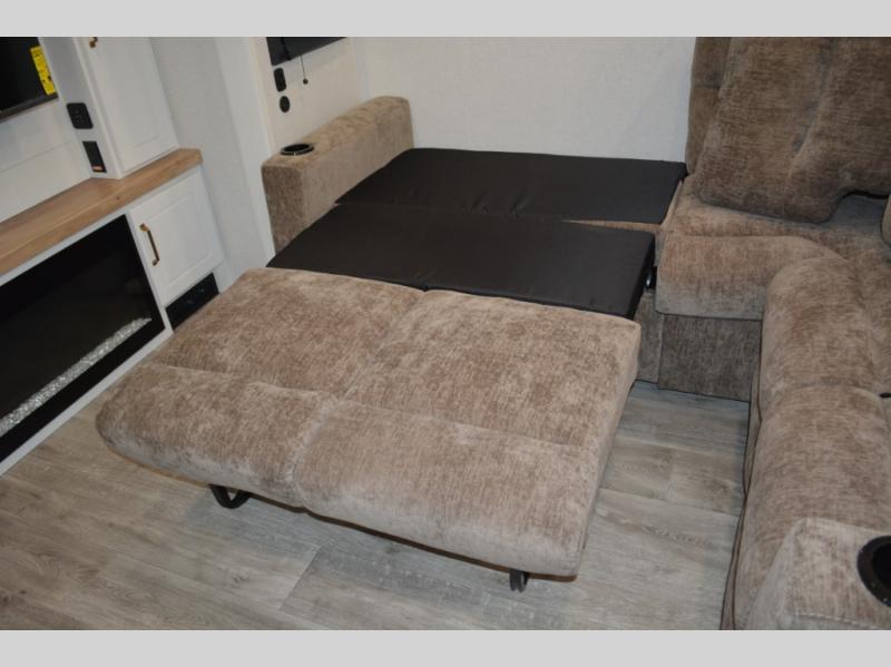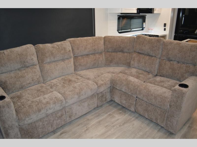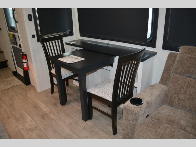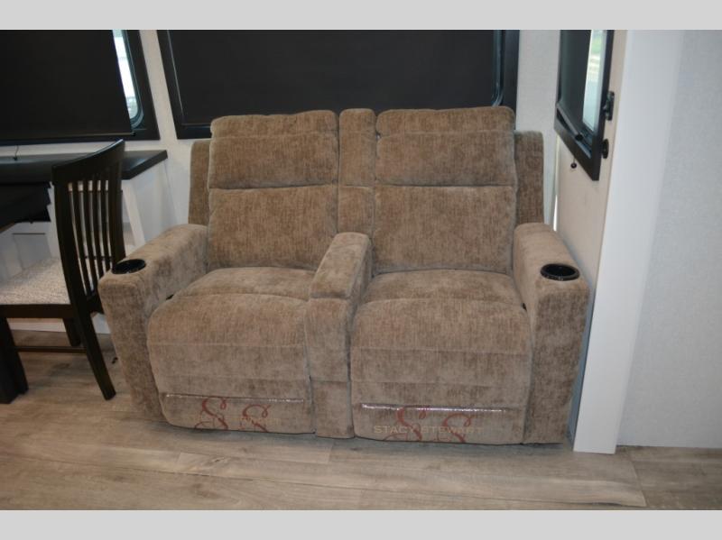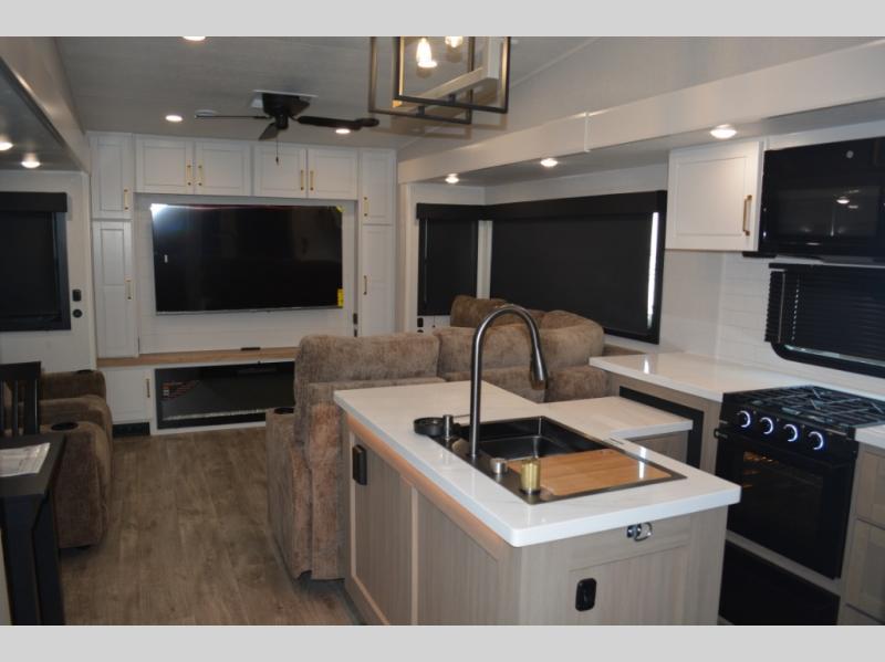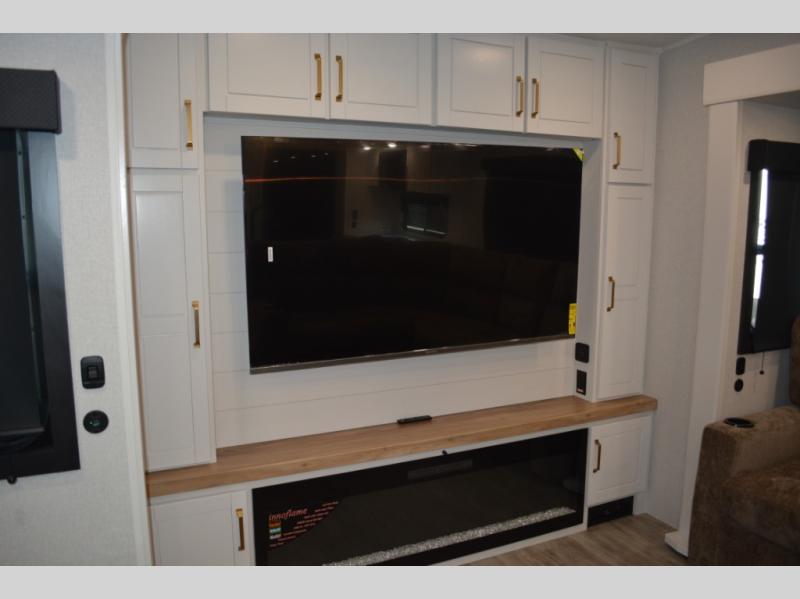 It will be so easy to enjoy time in this spacious fifth wheel! The rear living area includes an entertainment center with a fireplace across from the L-shaped sofa for movie nights. There is also a theater sofa with cup holders plus a roll-top dinette with two chairs to dine at. The chef of your group will love the generous counter space in the middle kitchen, and there is a large pantry to keep food stocked. Heading up front, you'll find the spacious bathroom that includes a shower with a seat, and the front private bedroom with a king bed slide out. There is also a chest with a TV, front shelves with drawers, plus washer and dryer prep!