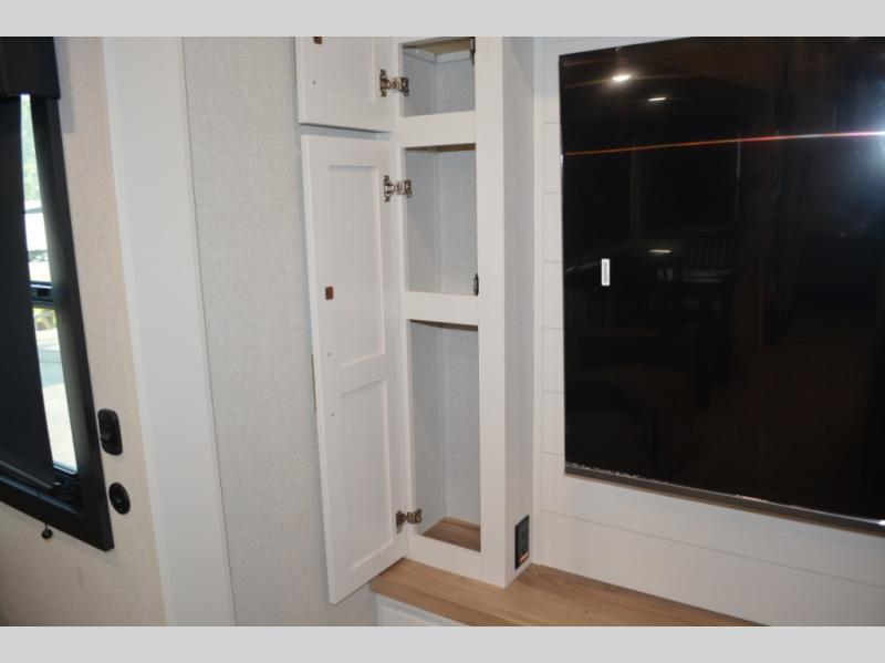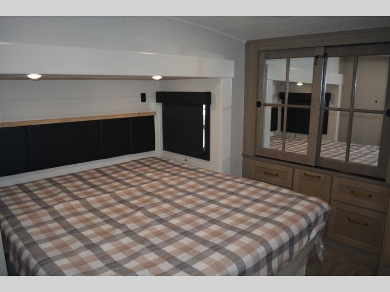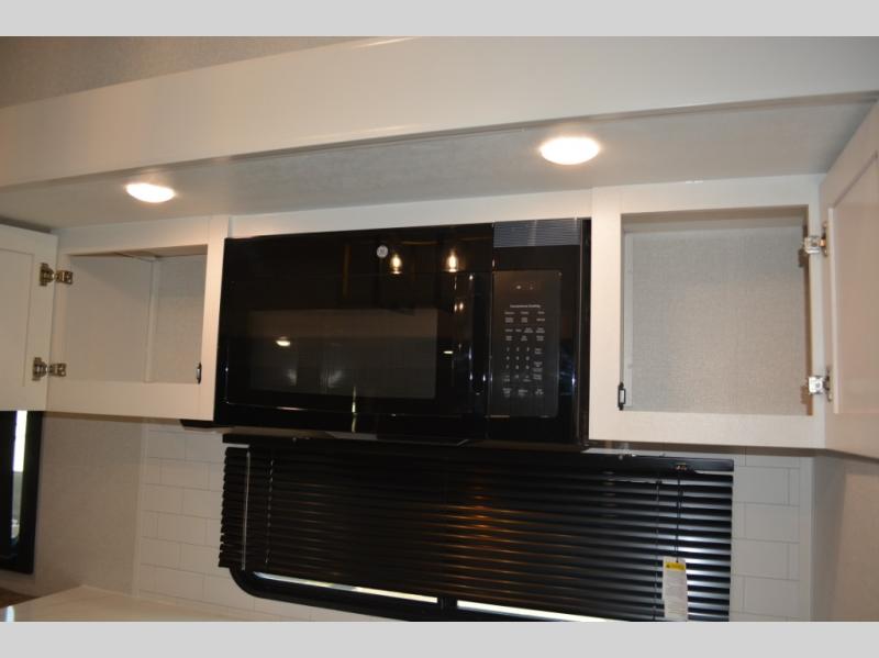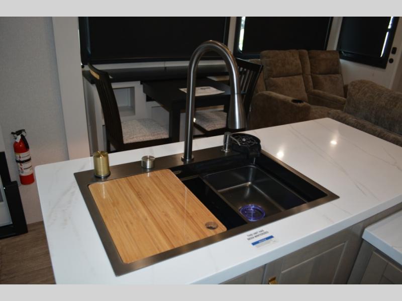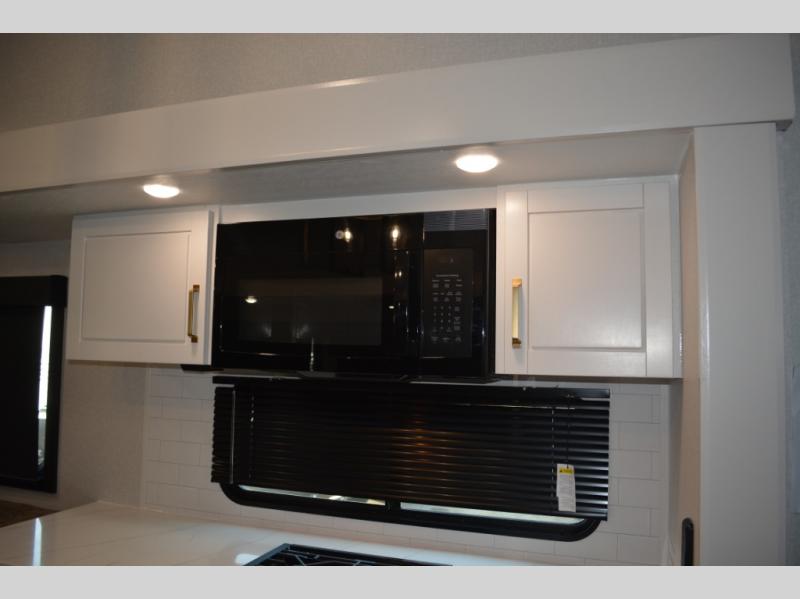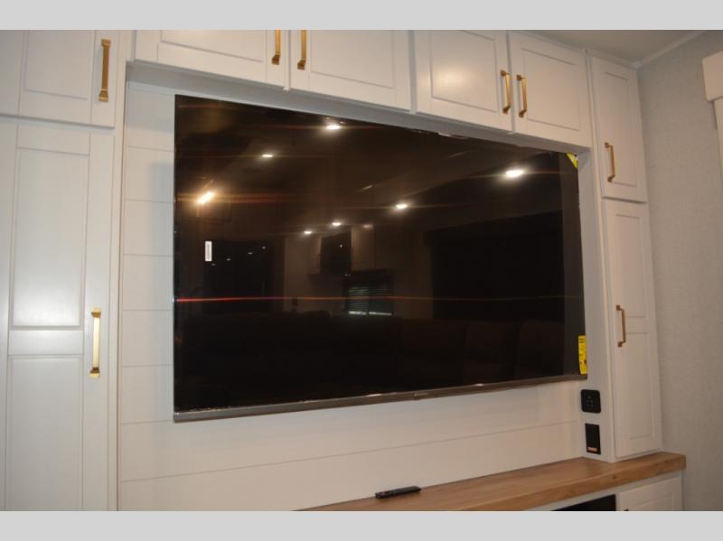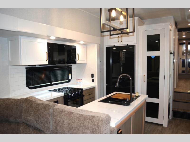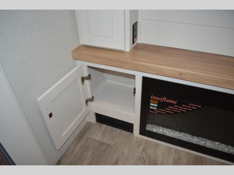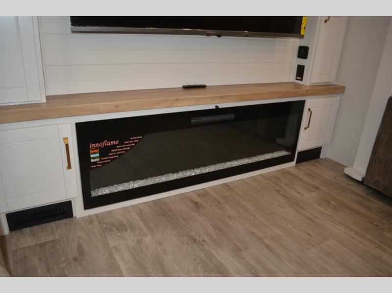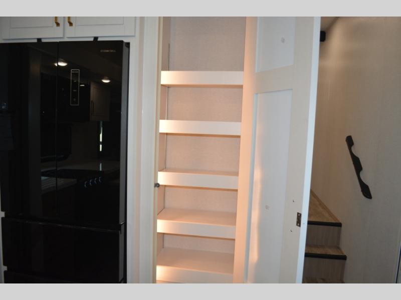 It will be so easy to enjoy time in this spacious fifth wheel! The rear living area includes an entertainment center with a fireplace across from the L-shaped sofa for movie nights. There is also a theater sofa with cup holders plus a roll-top dinette with two chairs to dine at. The chef of your group will love the generous counter space in the middle kitchen, and there is a large pantry to keep food stocked. Heading up front, you'll find the spacious bathroom that includes a shower with a seat, and the front private bedroom with a king bed slide out. There is also a chest with a TV, front shelves with drawers, plus washer and dryer prep!