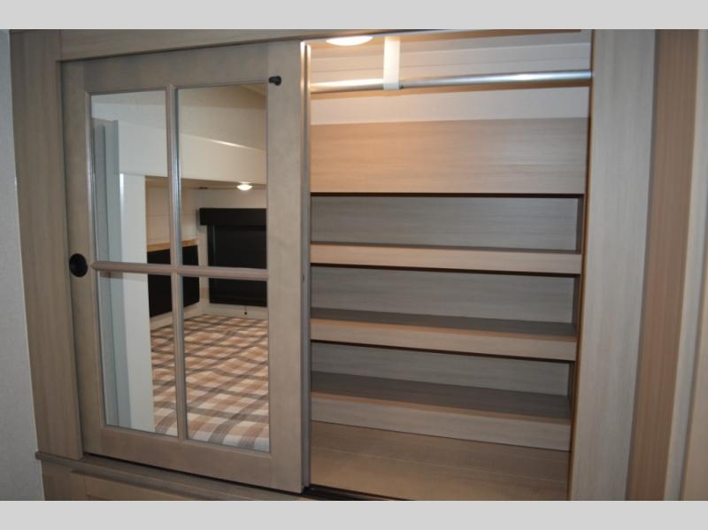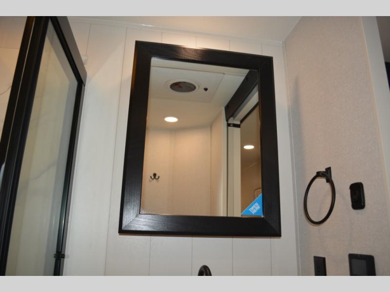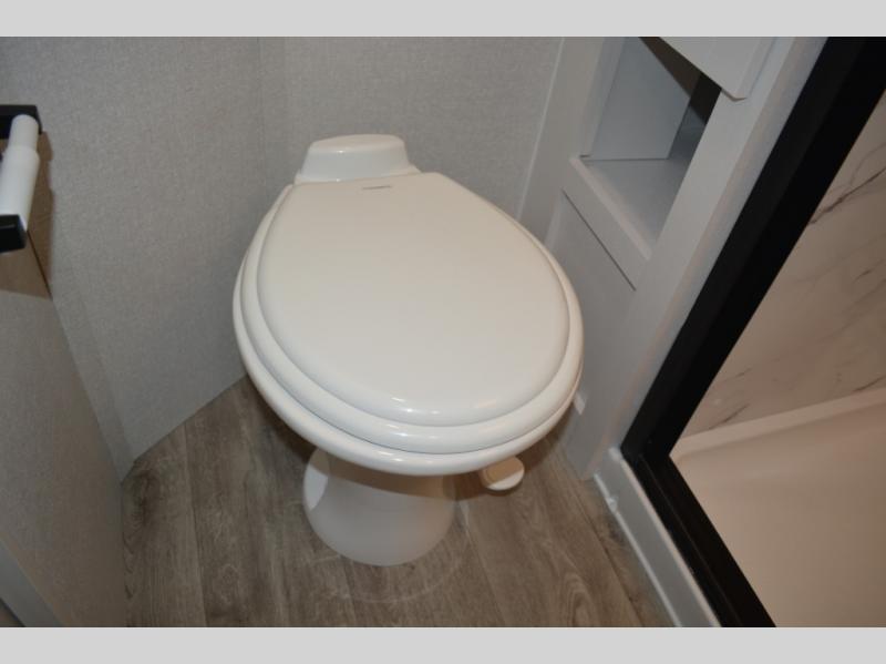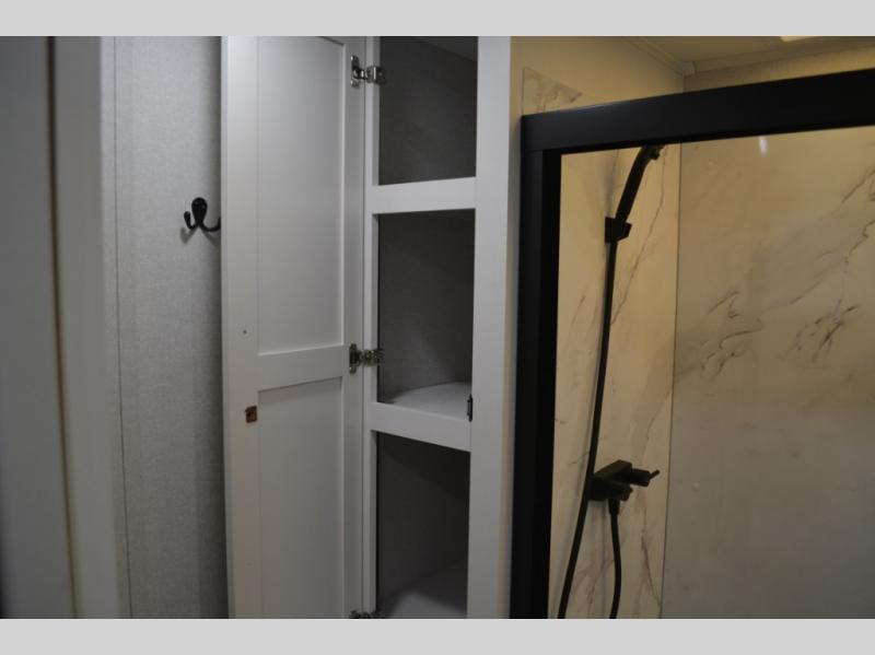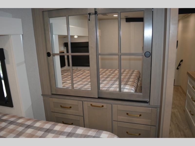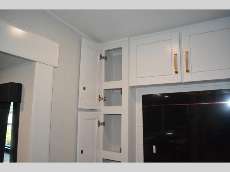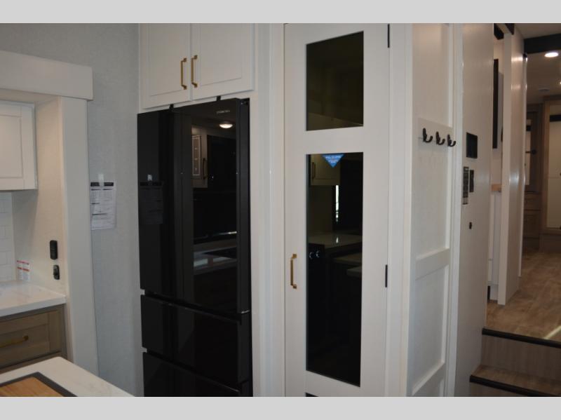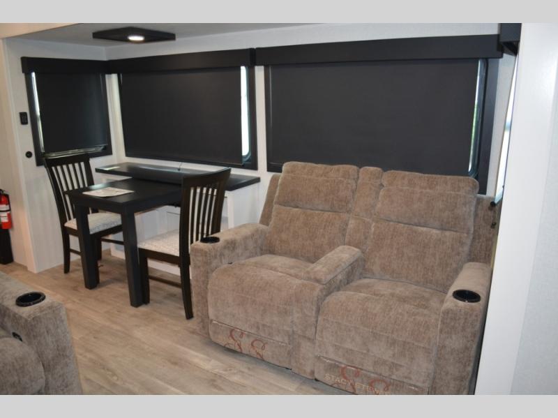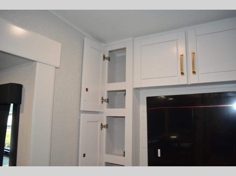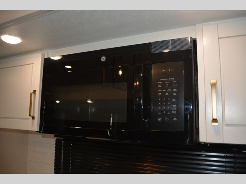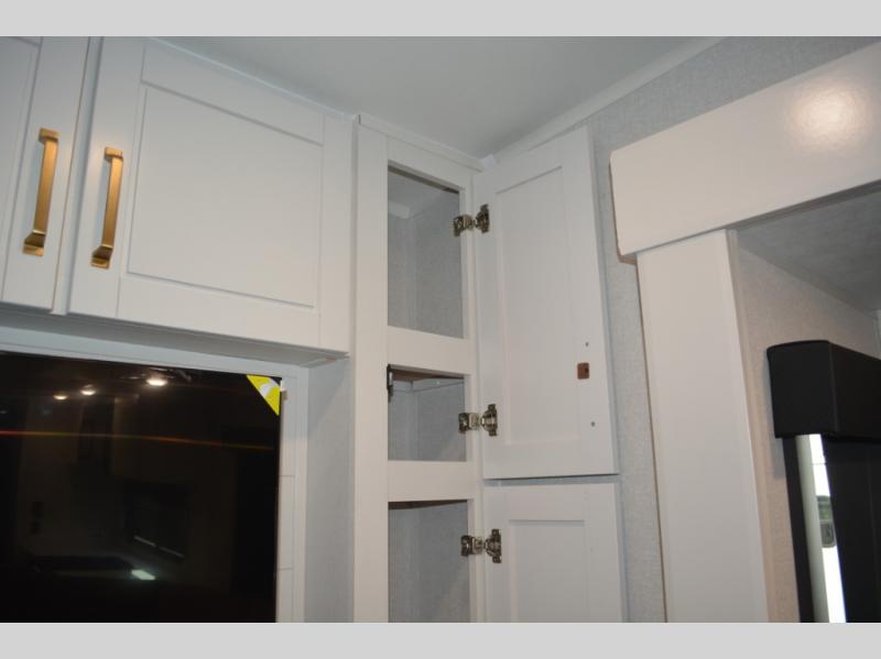 It will be so easy to enjoy time in this spacious fifth wheel! The rear living area includes an entertainment center with a fireplace across from the L-shaped sofa for movie nights. There is also a theater sofa with cup holders plus a roll-top dinette with two chairs to dine at. The chef of your group will love the generous counter space in the middle kitchen, and there is a large pantry to keep food stocked. Heading up front, you'll find the spacious bathroom that includes a shower with a seat, and the front private bedroom with a king bed slide out. There is also a chest with a TV, front shelves with drawers, plus washer and dryer prep!