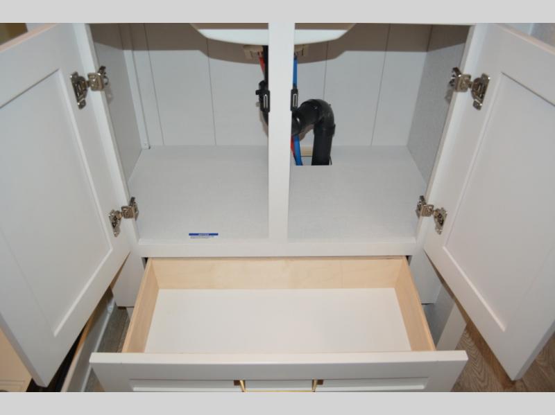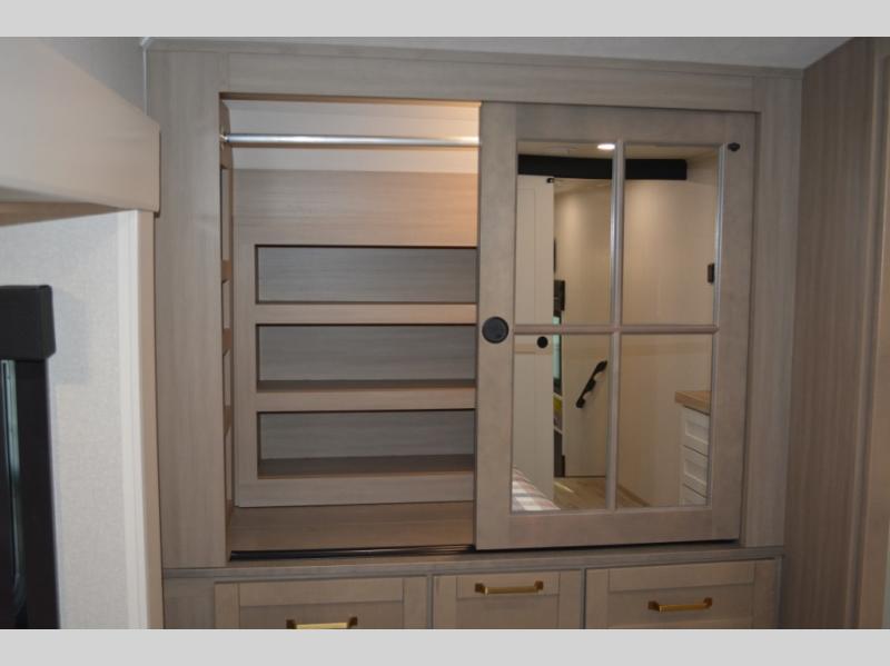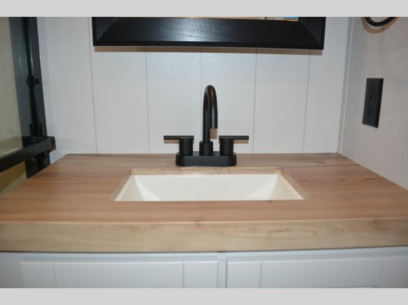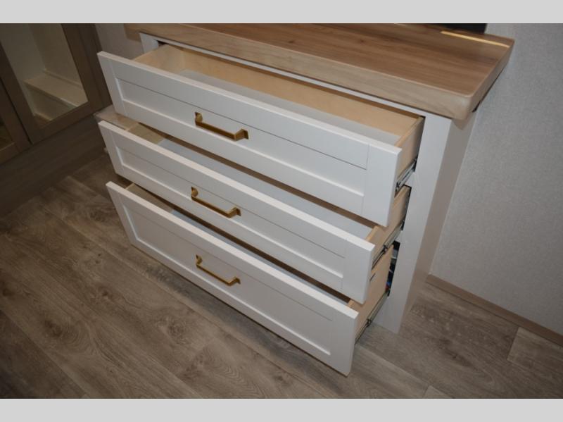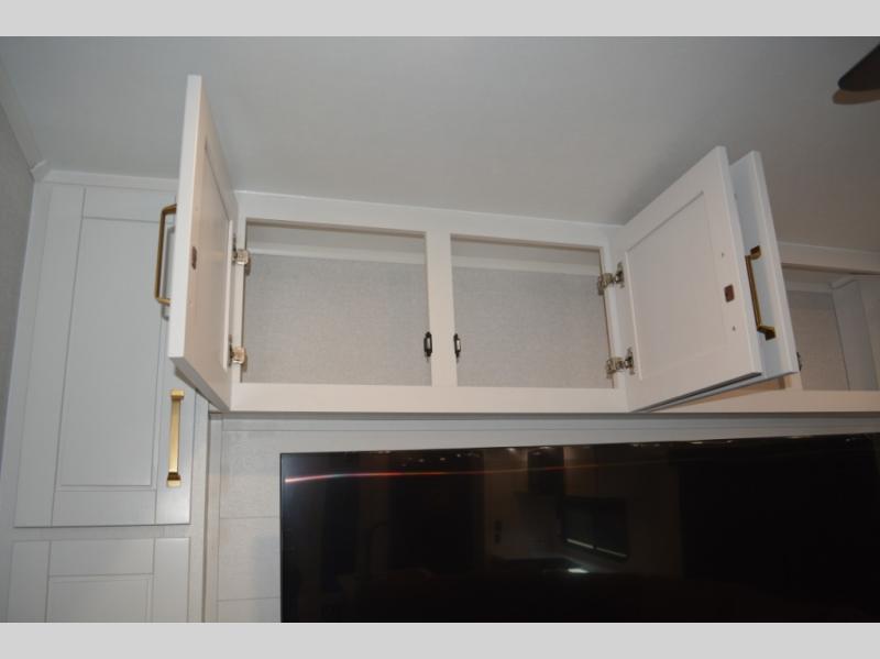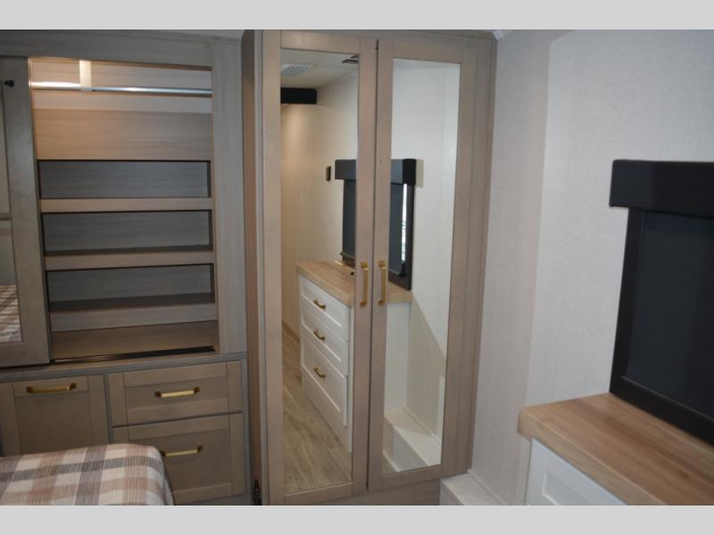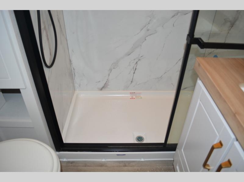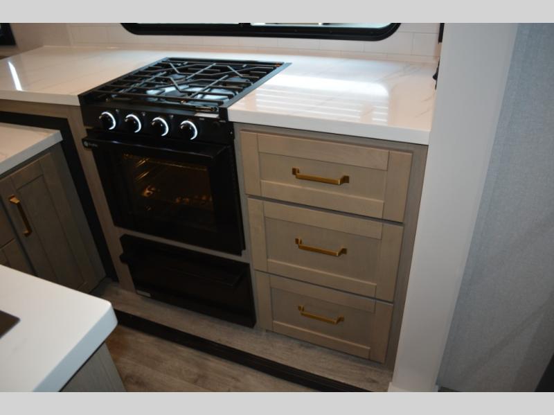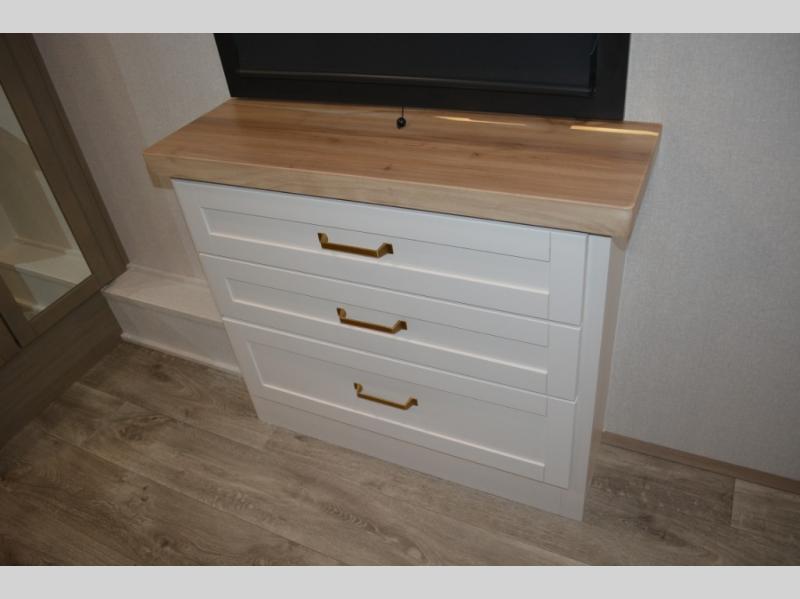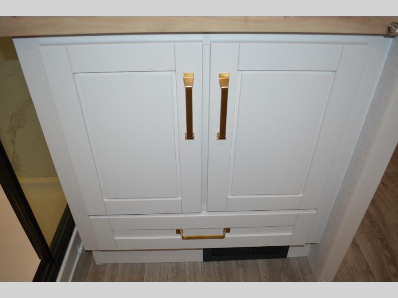 It will be so easy to enjoy time in this spacious fifth wheel! The rear living area includes an entertainment center with a fireplace across from the L-shaped sofa for movie nights. There is also a theater sofa with cup holders plus a roll-top dinette with two chairs to dine at. The chef of your group will love the generous counter space in the middle kitchen, and there is a large pantry to keep food stocked. Heading up front, you'll find the spacious bathroom that includes a shower with a seat, and the front private bedroom with a king bed slide out. There is also a chest with a TV, front shelves with drawers, plus washer and dryer prep!