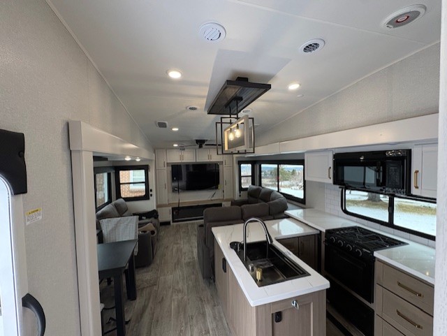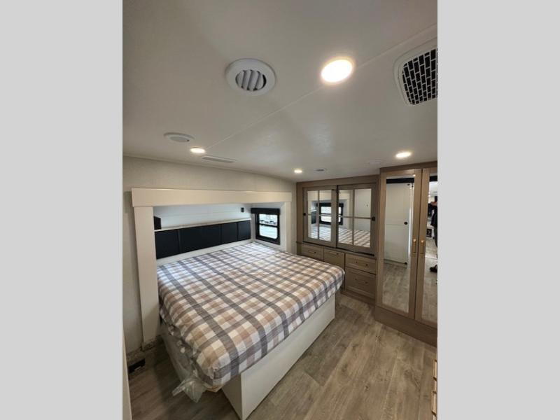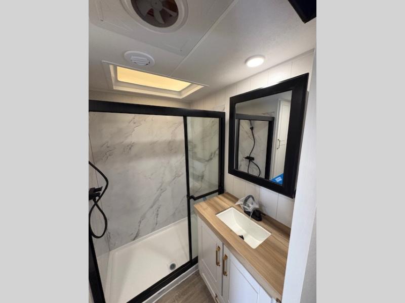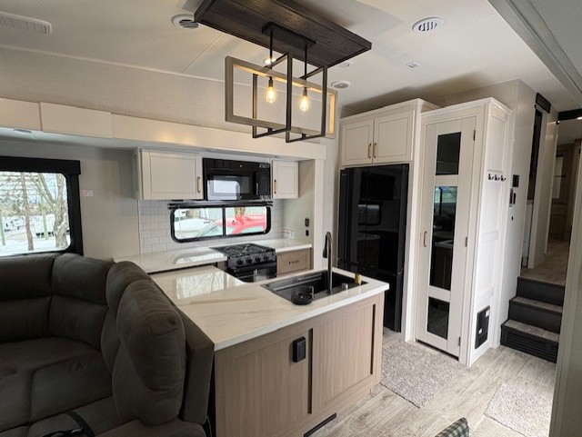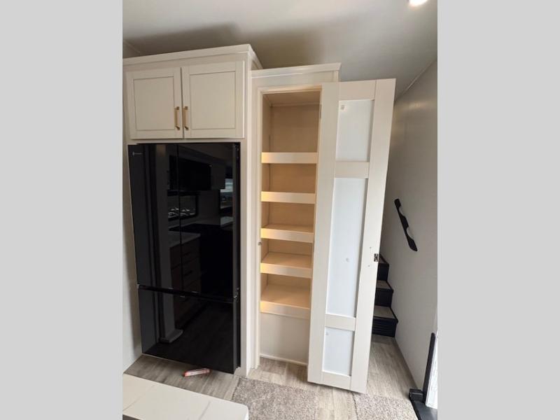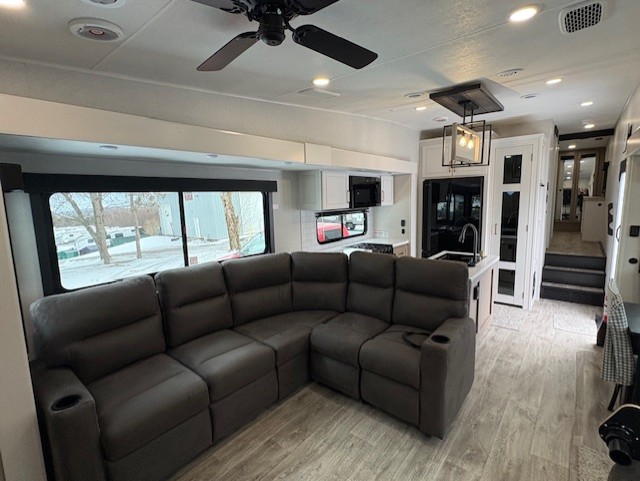 It will be so easy to enjoy time in this spacious fifth wheel! The rear living area includes an entertainment center with a fireplace across from the L-shaped sofa for movie nights. There is also a theater sofa with cup holders plus a roll-top dinette with two chairs to dine at. The chef of your group will love the generous counter space in the middle kitchen, and there is a large pantry to keep food stocked. Heading up front, you'll find the spacious bathroom that includes a shower with a seat, and the front private bedroom with a king bed slide out. There is also a chest with a TV, front shelves with drawers, plus washer and dryer prep!