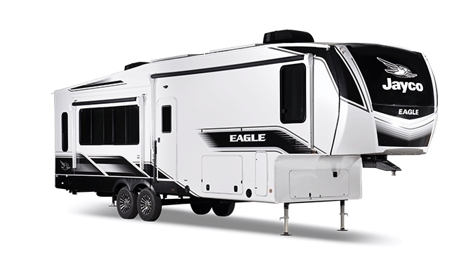 With any Eagle fifth wheel by Jayco you will appreciate durable construction materials, like the Magnum Truss Roof and the Stronghold VBL laminated walls. The JAYCOMMAND Smart RV system puts you in control of your RV's functions, and the 5 Star Handling Package will provide smooth towing from home to camp. Each model features Climate Shield zero-degree tested weather protection and the industry-exclusive HELIX cooling system that features two 15,000 BTU Whisper Quiet A/C's to keep you comfortable year around. Some of the exterior conveniences you are sure to love are the pass-through storage with Slam-Latch baggage doors and an automotive style front cap with max turn radius. The Eagle fifth wheels are designed to make you feel at home with solid hardwood slide fascia, residential vinyl flooring throughout, 100% no floor vents, and blackout roller shades with reflective side throughout for added privacy and insulation.