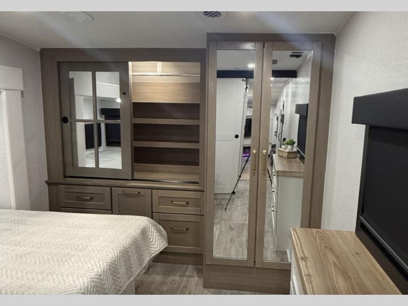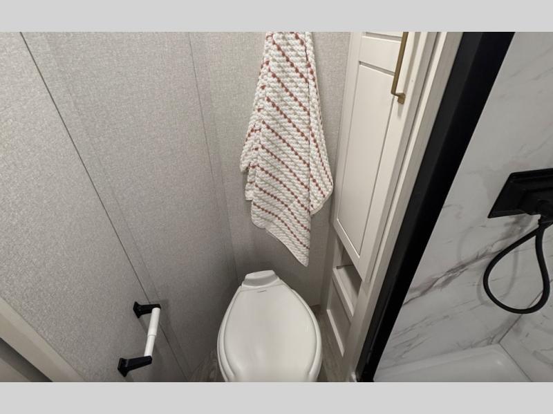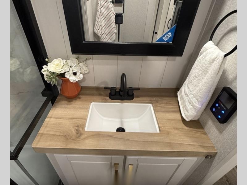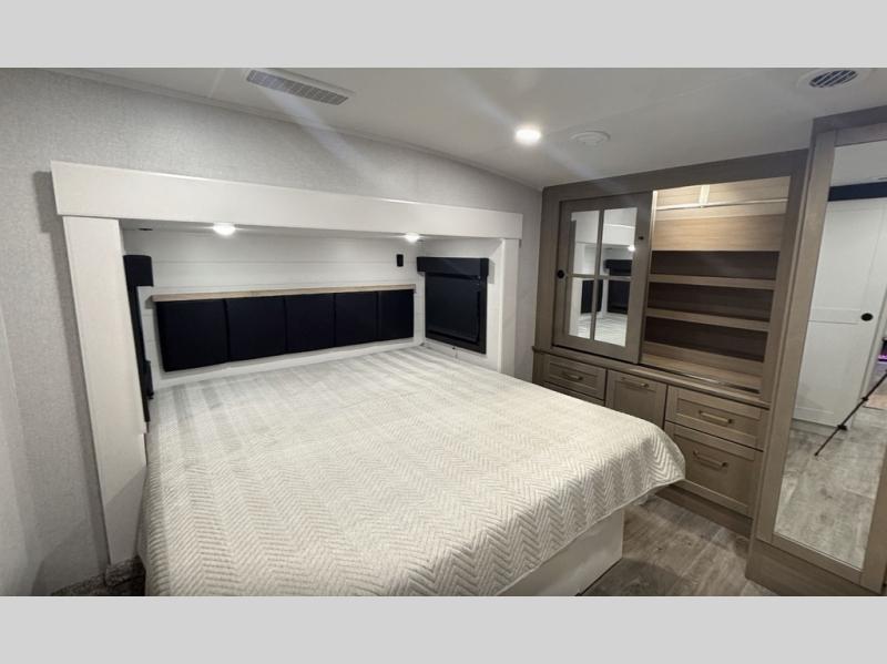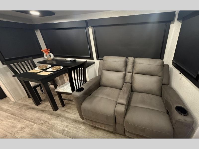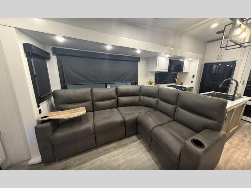 It will be so easy to enjoy time in this spacious fifth wheel! The rear living area includes an entertainment center with a fireplace across from the L-shaped sofa for movie nights. There is also a theater sofa with cup holders plus a roll-top dinette with two chairs to dine at. The chef of your group will love the generous counter space in the middle kitchen, and there is a large pantry to keep food stocked. Heading up front, you'll find the spacious bathroom that includes a shower with a seat, and the front private bedroom with a king bed slide out. There is also a chest with a TV, front shelves with drawers, plus washer and dryer prep!