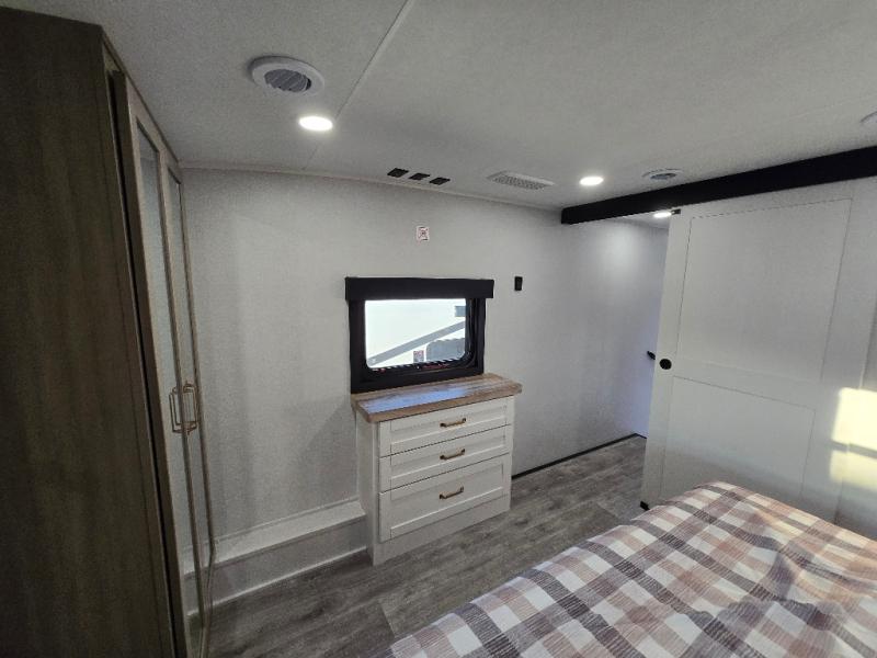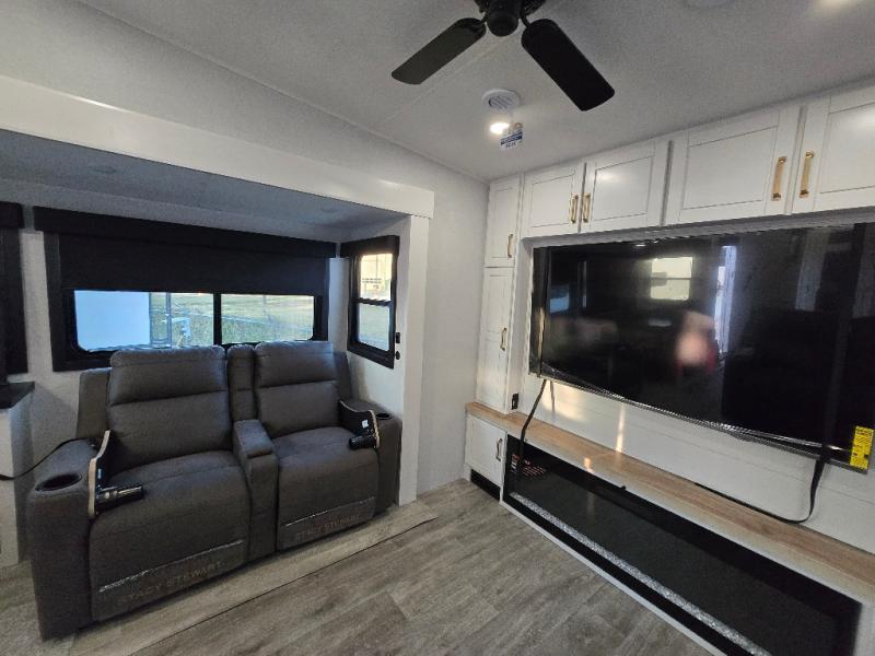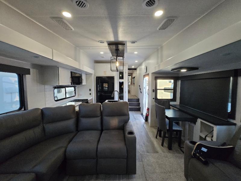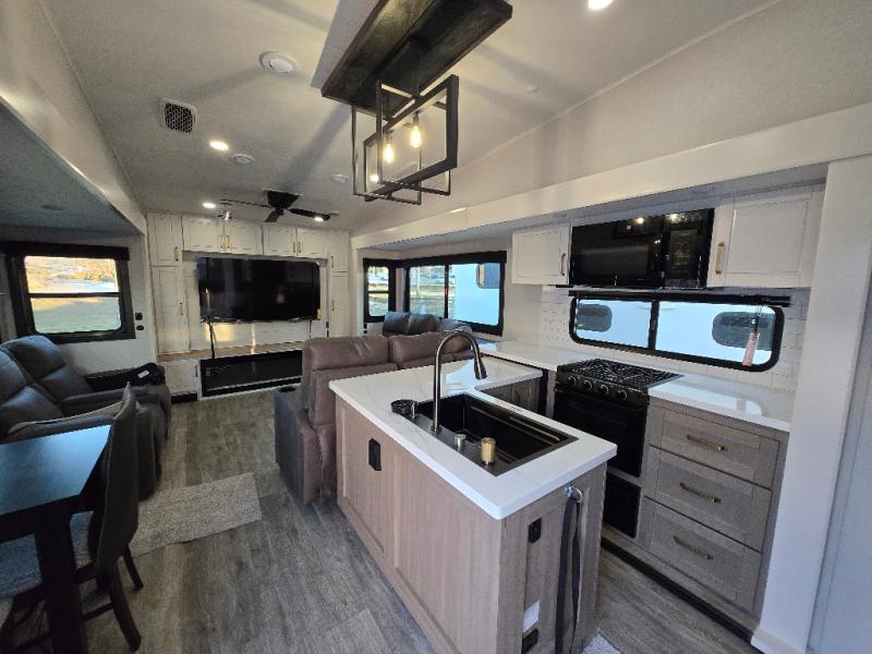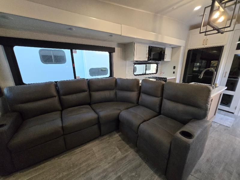 It will be so easy to enjoy time in this spacious fifth wheel! The rear living area includes an entertainment center with a fireplace across from the L-shaped sofa for movie nights. There is also a theater sofa with cup holders plus a roll-top dinette with two chairs to dine at. The chef of your group will love the generous counter space in the middle kitchen, and there is a large pantry to keep food stocked. Heading up front, you'll find the spacious bathroom that includes a shower with a seat, and the front private bedroom with a king bed slide out. There is also a chest with a TV, front shelves with drawers, plus washer and dryer prep!