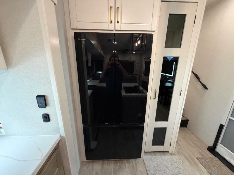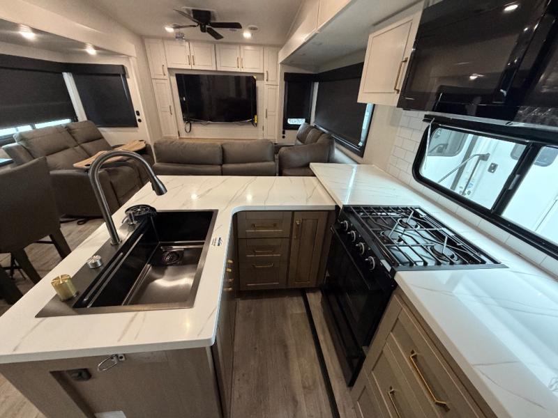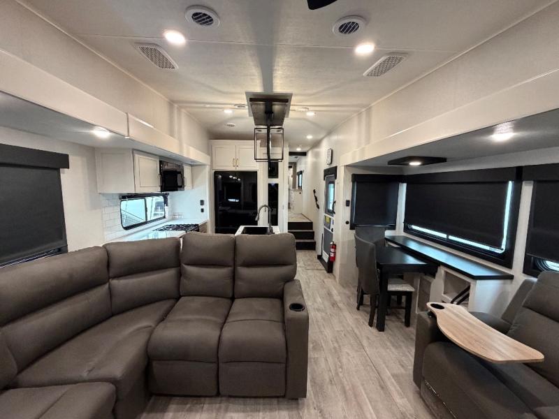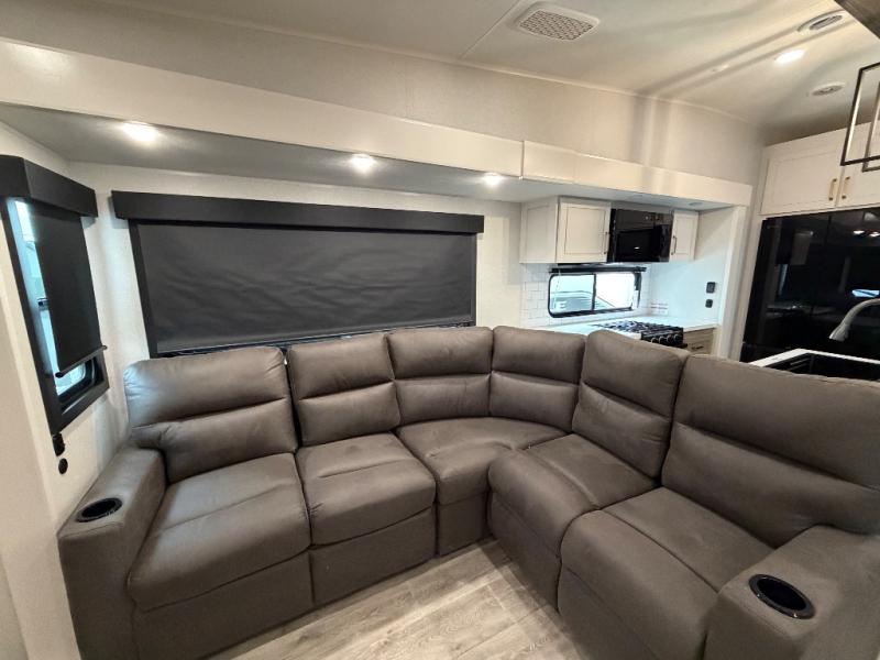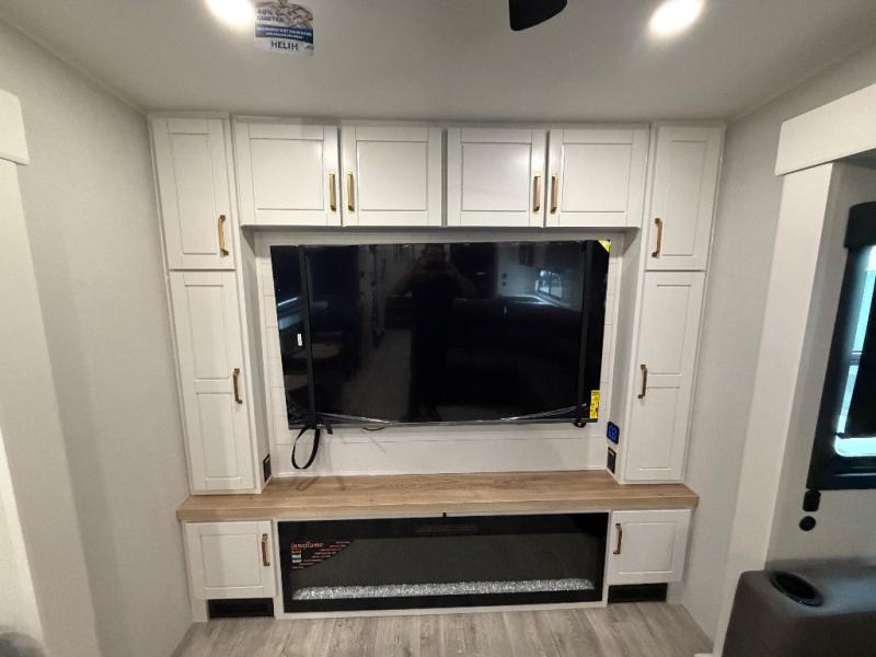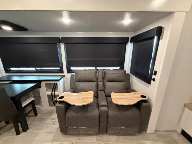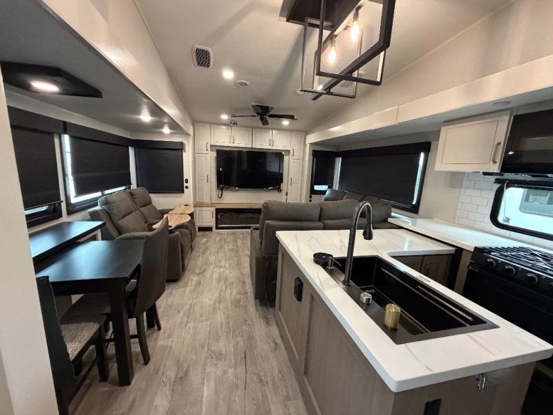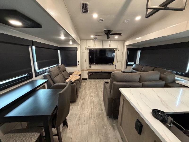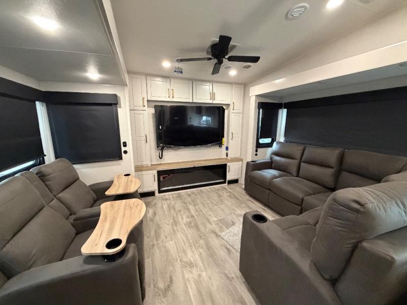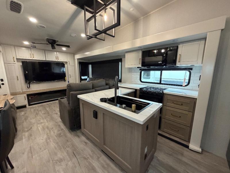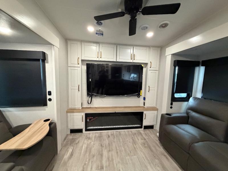 It will be so easy to enjoy time in this spacious fifth wheel! The rear living area includes an entertainment center with a fireplace across from the L-shaped sofa for movie nights. There is also a theater sofa with cup holders plus a roll-top dinette with two chairs to dine at. The chef of your group will love the generous counter space in the middle kitchen, and there is a large pantry to keep food stocked. Heading up front, you'll find the spacious bathroom that includes a shower with a seat, and the front private bedroom with a king bed slide out. There is also a chest with a TV, front shelves with drawers, plus washer and dryer prep!