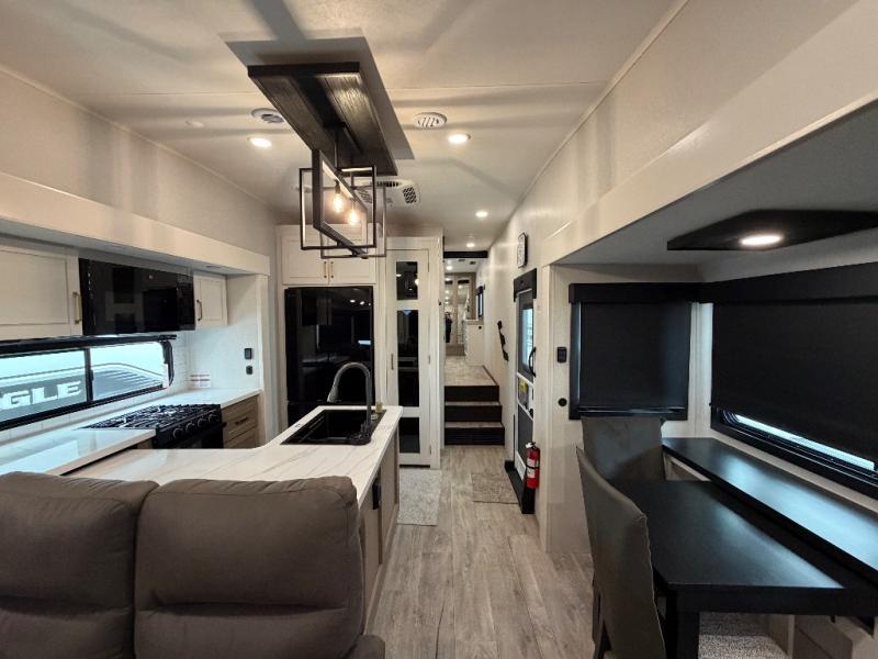 With any Eagle fifth wheel by Jayco you will appreciate durable construction materials, like the Magnum Truss Roof and the Stronghold VBL laminated walls. The JAYCOMMAND Smart RV system puts you in control of your RV's functions, and the 5 Star Handling Package will provide smooth towing from home to camp. Each model features Climate Shield zero-degree tested weather protection and the industry-exclusive HELIX cooling system that features two 15,000 BTU Whisper Quiet A/C's to keep you comfortable year around. Some of the exterior conveniences you are sure to love are the pass-through storage with Slam-Latch baggage doors and an automotive style front cap with max turn radius. The Eagle fifth wheels are designed to make you feel at home with solid hardwood slide fascia, residential vinyl flooring throughout, 100% no floor vents, and blackout roller shades with reflective side throughout for added privacy and insulation.