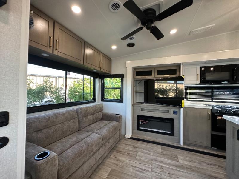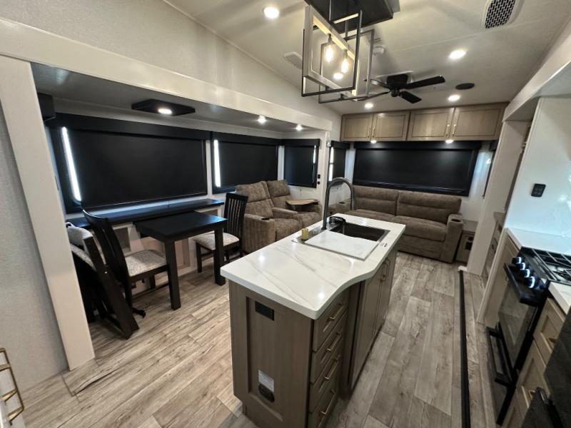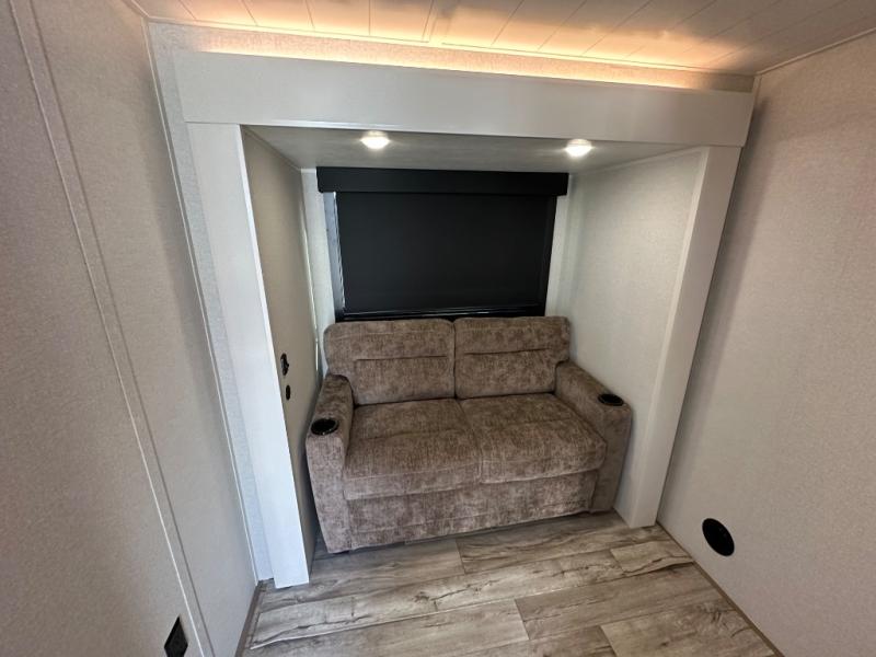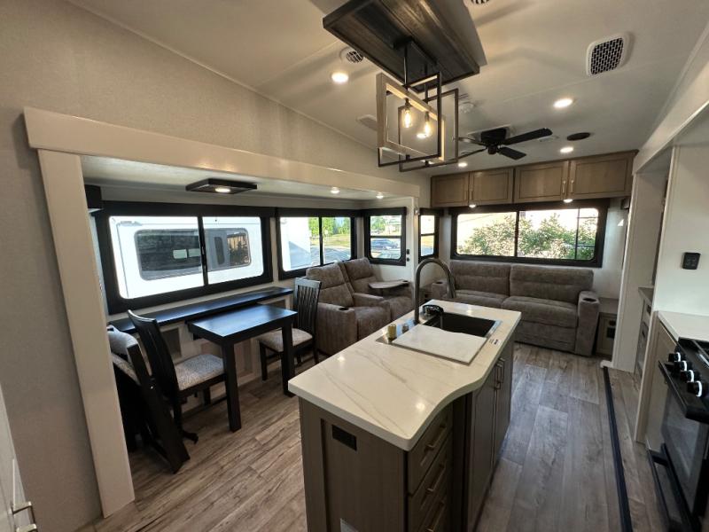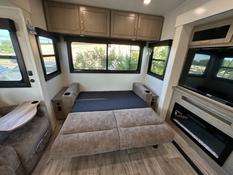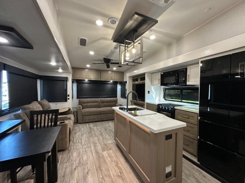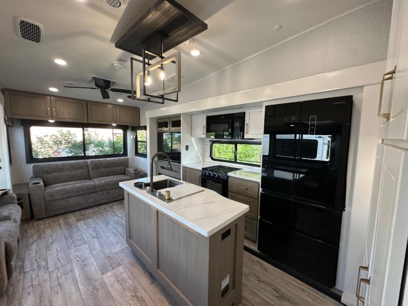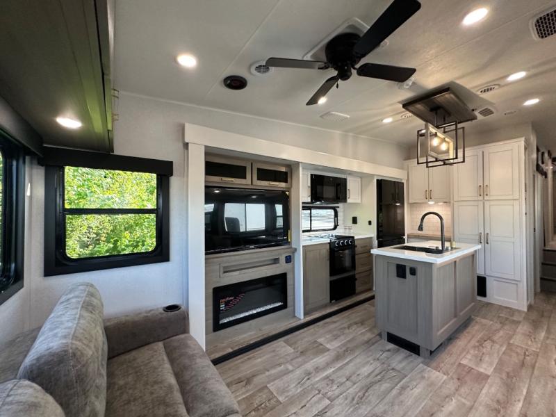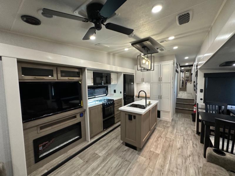 This fifth wheel with four slides is one your whole crew will love! There is a middle bedroom/den with a tri-fold sofa and a desk, allowing this room to become an office if you need it. The loft above this room will be a big hit with the little ones, and the full bath is centrally located so everyone can use it easily. You will have the front private bedroom all to yourselves with a king bed slide out, a chest with TV prep, plus washer and dryer prep in the walk-in closet. The main living area includes everything you need to relax in comfort, like the theater seats, tri-fold sofa, and entertainment center with a fireplace. The chef will enjoy the extra counter space provided by the kitchen island, and there is plenty of storage with the pantry, hutch, and 16 cu. ft. 12V refrigerator. This model even has an outside kitchen, two power awnings, and outside storage for all your gear!