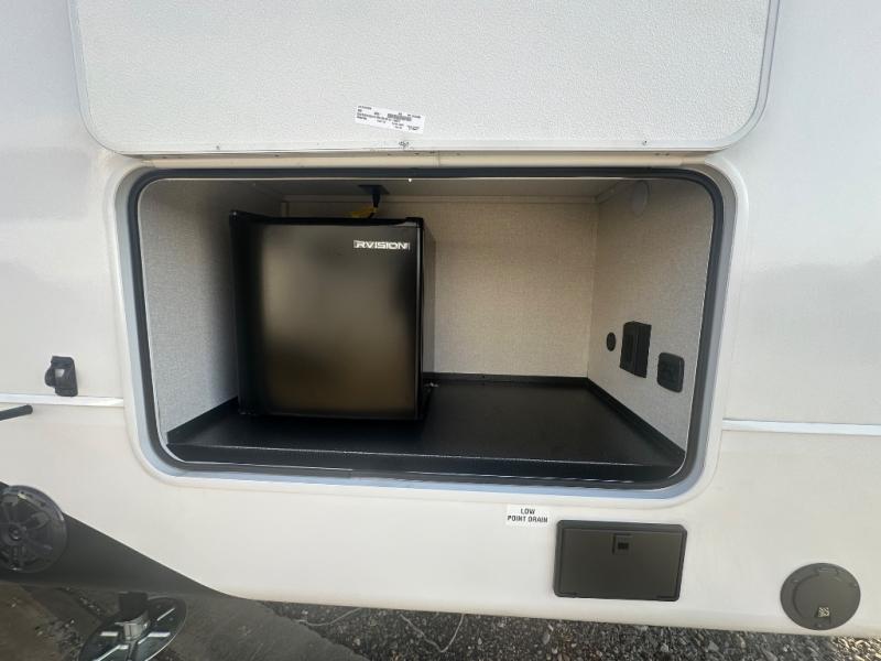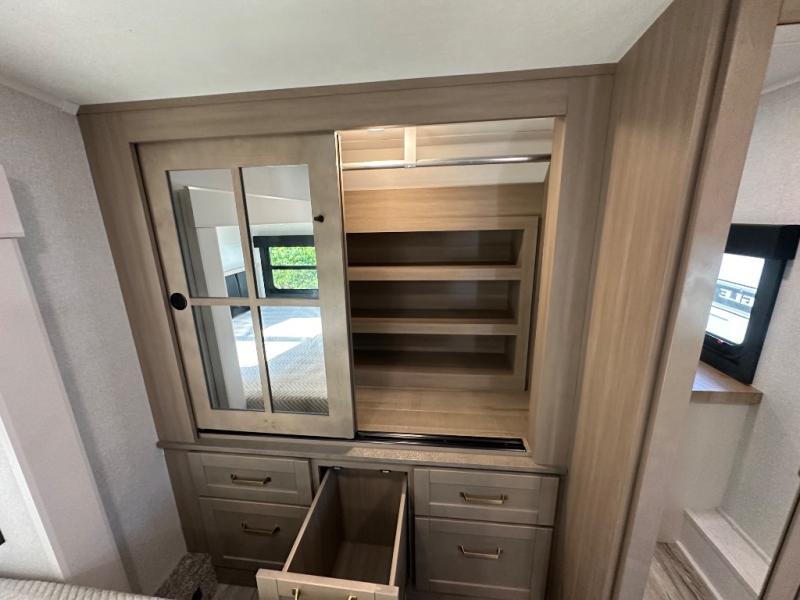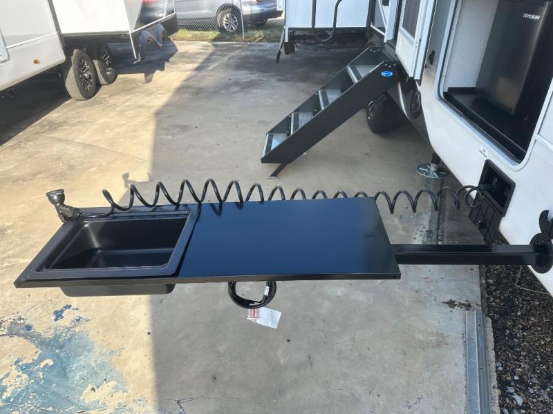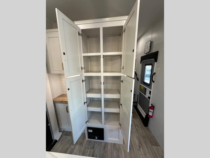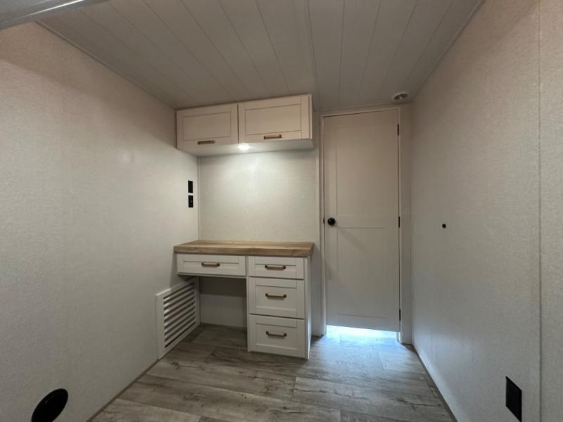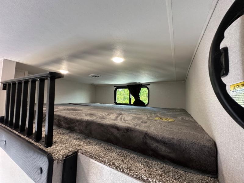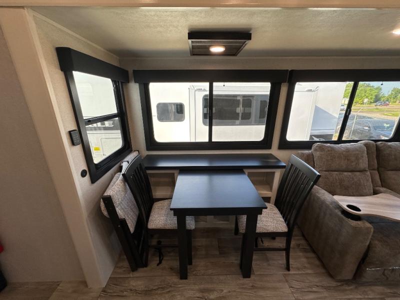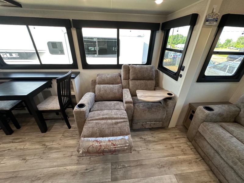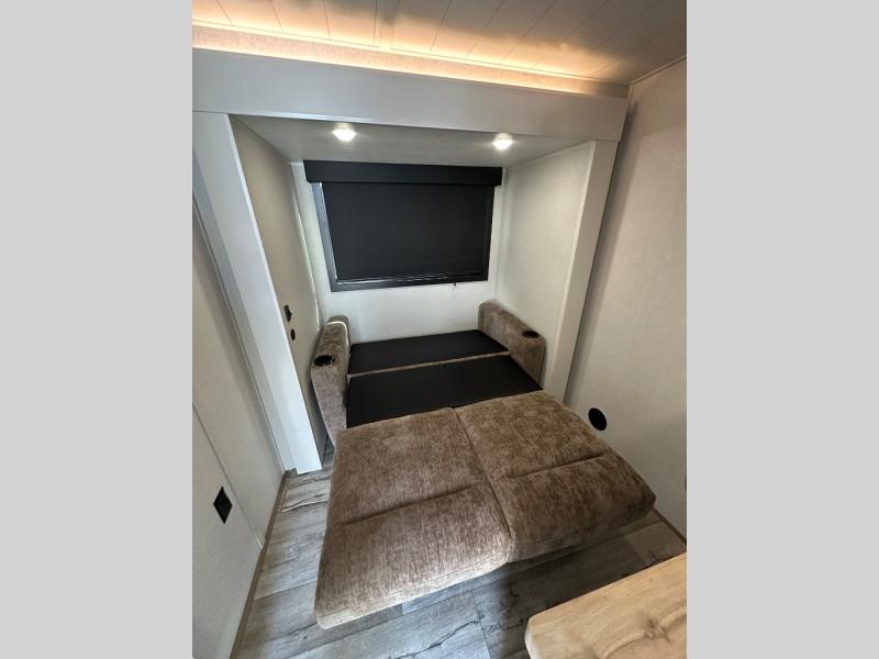This fifth wheel with four slides is one your whole crew will love! There is a middle bedroom/den with a tri-fold sofa and a desk, allowing this room to become an office if you need it. The loft above this room will be a big hit with the little ones, and the full bath is centrally located so everyone can use it easily. You will have the front private bedroom all to yourselves with a king bed slide out, a chest with TV prep, plus washer and dryer prep in the walk-in closet. The main living area includes everything you need to relax in comfort, like the theater seats, tri-fold sofa, and entertainment center with a fireplace. The chef will enjoy the extra counter space provided by the kitchen island, and there is plenty of storage with the pantry, hutch, and 16 cu. ft. 12V refrigerator. This model even has an outside kitchen, two power awnings, and outside storage for all your gear!