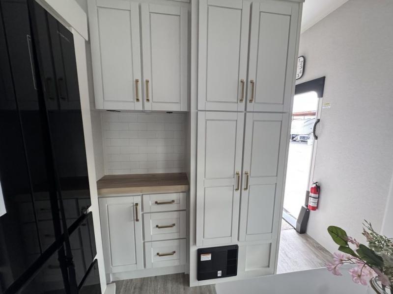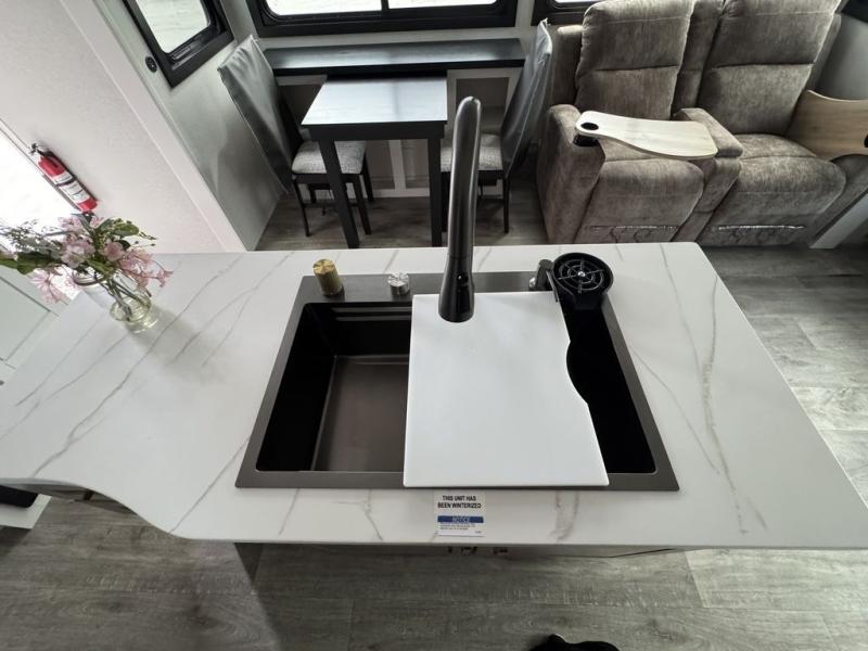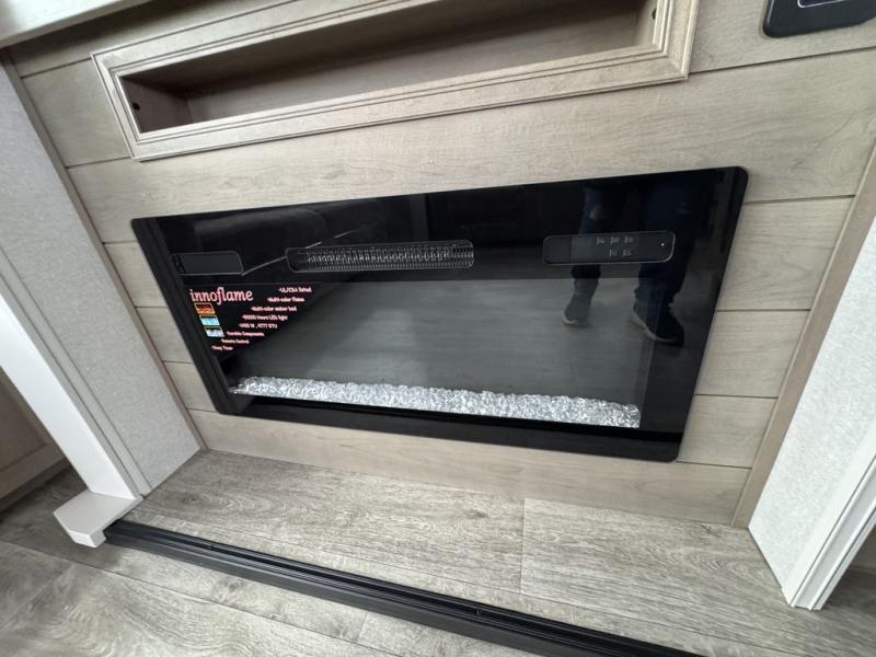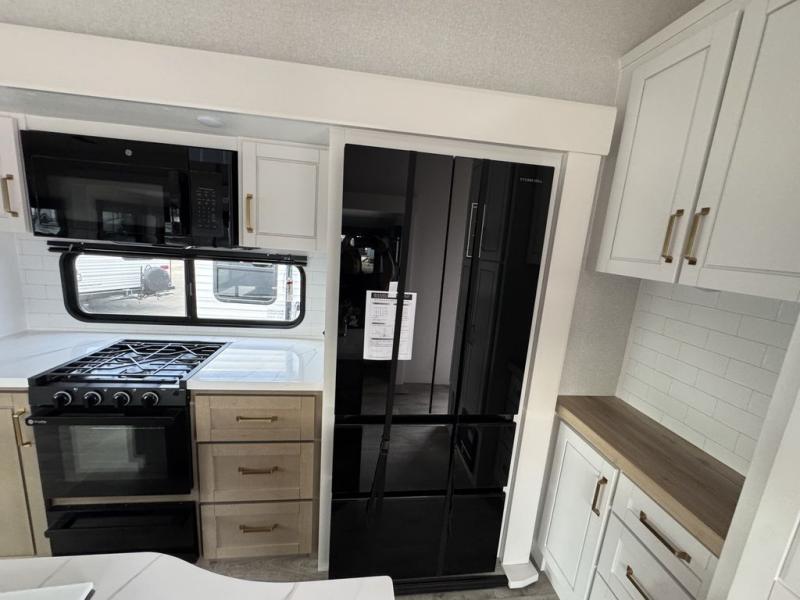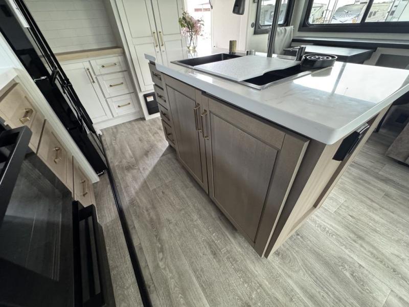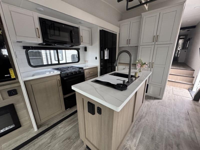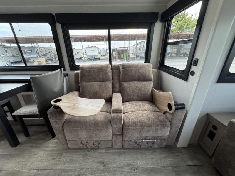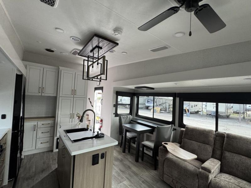 This fifth wheel with four slides is one your whole crew will love! There is a middle bedroom/den with a tri-fold sofa and a desk, allowing this room to become an office if you need it. The loft above this room will be a big hit with the little ones, and the full bath is centrally located so everyone can use it easily. You will have the front private bedroom all to yourselves with a king bed slide out, a chest with TV prep, plus washer and dryer prep in the walk-in closet. The main living area includes everything you need to relax in comfort, like the theater seats, tri-fold sofa, and entertainment center with a fireplace. The chef will enjoy the extra counter space provided by the kitchen island, and there is plenty of storage with the pantry, hutch, and 16 cu. ft. 12V refrigerator. This model even has an outside kitchen, two power awnings, and outside storage for all your gear!