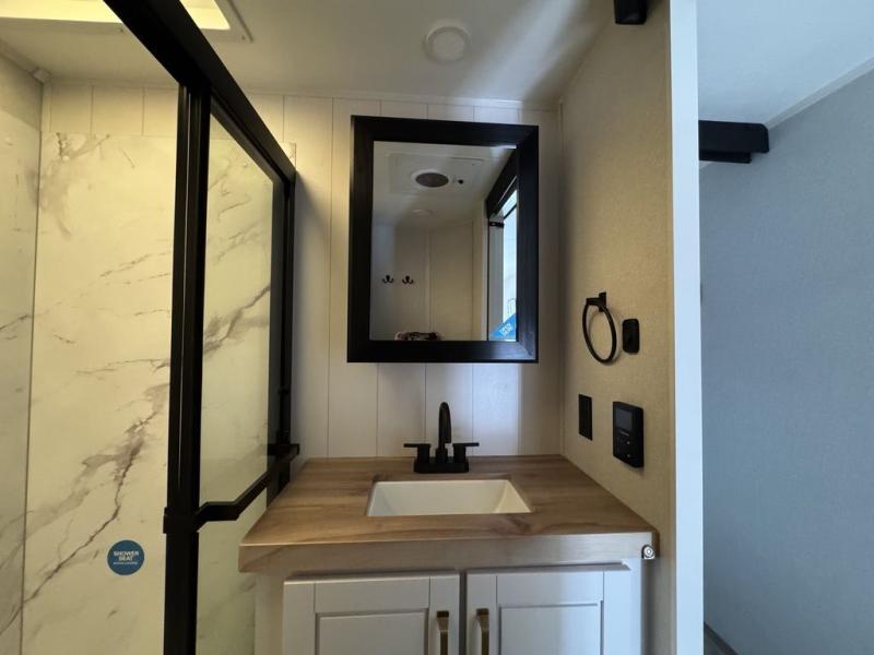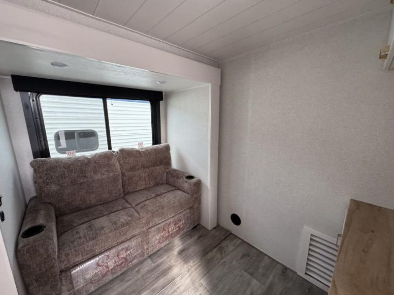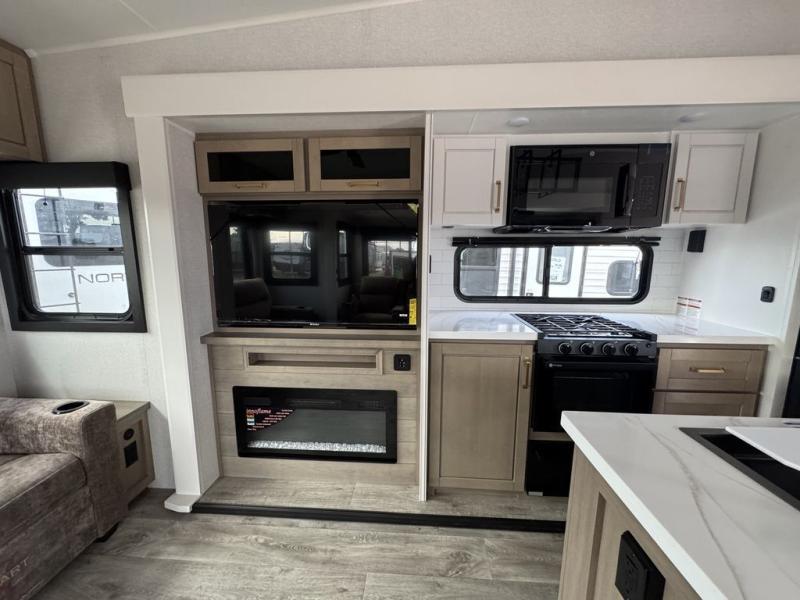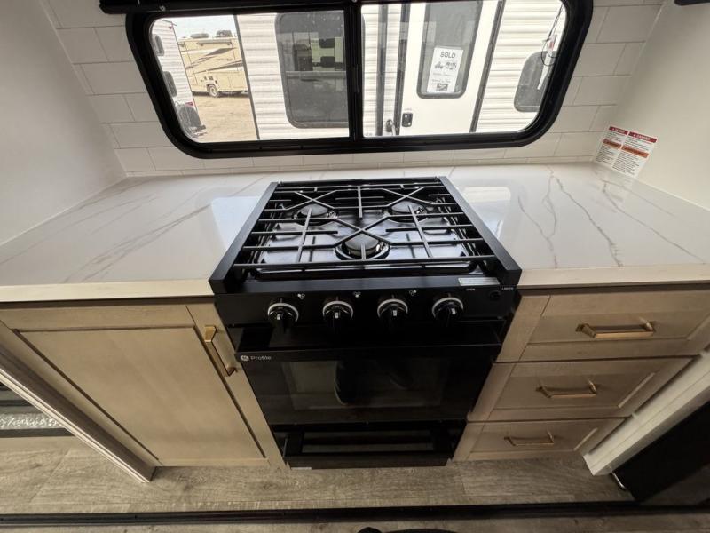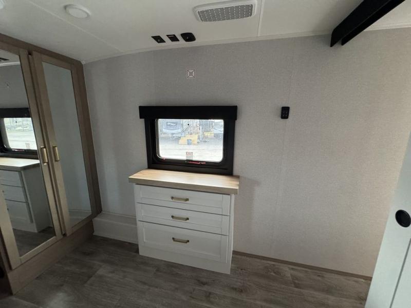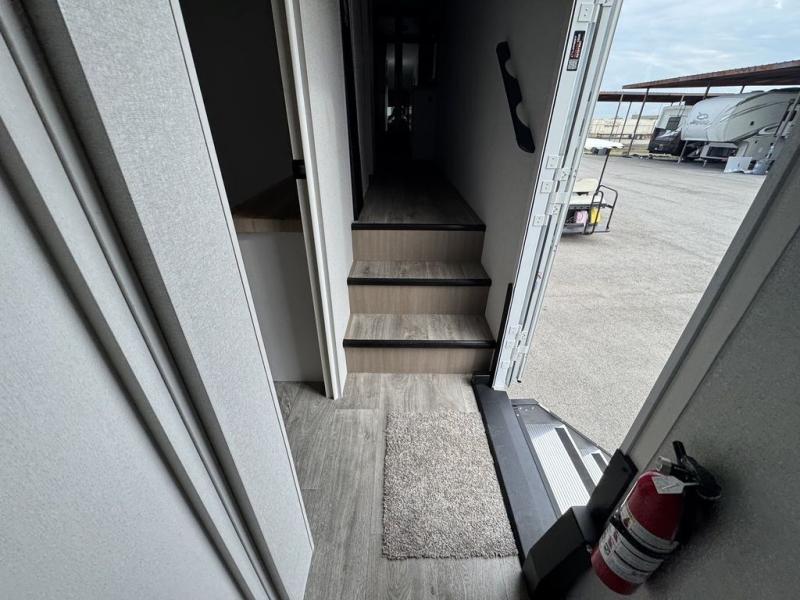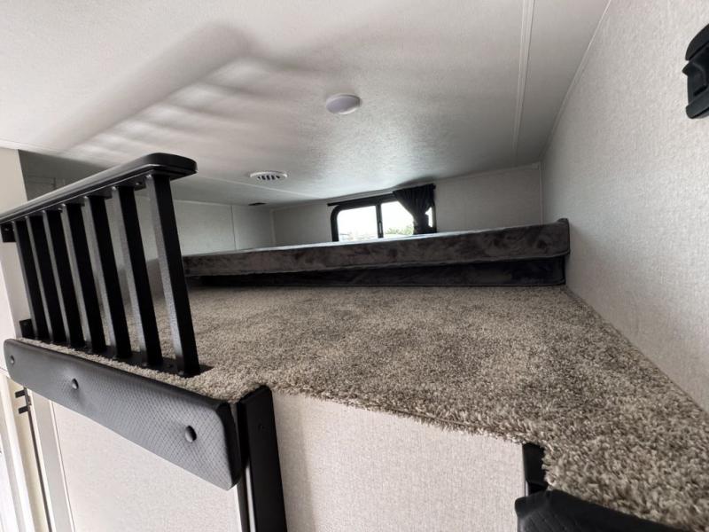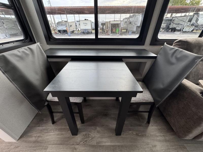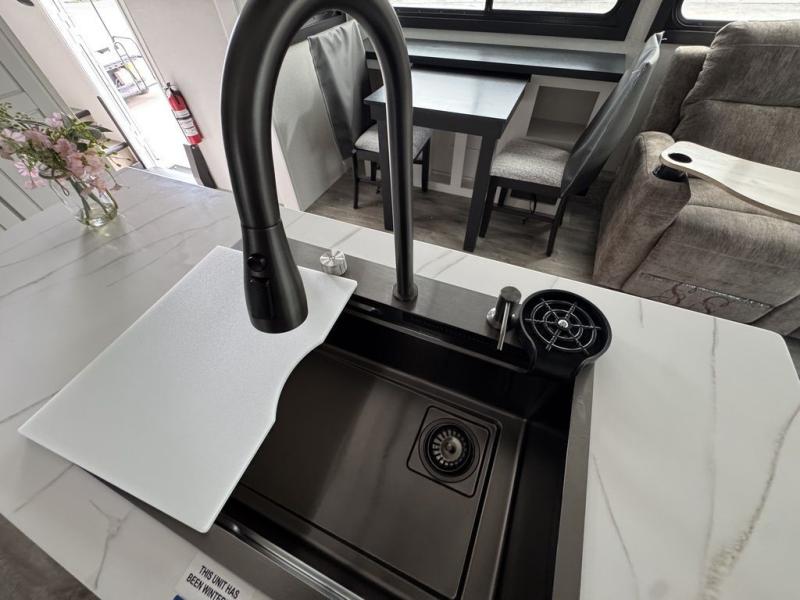 This fifth wheel with four slides is one your whole crew will love! There is a middle bedroom/den with a tri-fold sofa and a desk, allowing this room to become an office if you need it. The loft above this room will be a big hit with the little ones, and the full bath is centrally located so everyone can use it easily. You will have the front private bedroom all to yourselves with a king bed slide out, a chest with TV prep, plus washer and dryer prep in the walk-in closet. The main living area includes everything you need to relax in comfort, like the theater seats, tri-fold sofa, and entertainment center with a fireplace. The chef will enjoy the extra counter space provided by the kitchen island, and there is plenty of storage with the pantry, hutch, and 16 cu. ft. 12V refrigerator. This model even has an outside kitchen, two power awnings, and outside storage for all your gear!