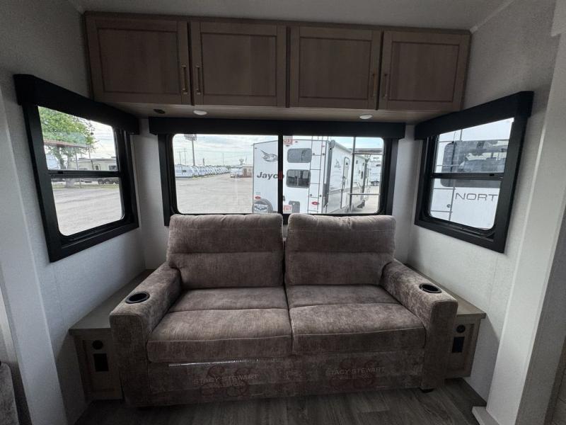 With any Eagle fifth wheel by Jayco you will appreciate durable construction materials, like the Magnum Truss Roof and the Stronghold VBL laminated walls. The JAYCOMMAND Smart RV system puts you in control of your RV's functions, and the 5 Star Handling Package will provide smooth towing from home to camp. Each model features Climate Shield zero-degree tested weather protection and the industry-exclusive HELIX cooling system that features two 15,000 BTU Whisper Quiet A/C's to keep you comfortable year around. Some of the exterior conveniences you are sure to love are the pass-through storage with Slam-Latch baggage doors and an automotive style front cap with max turn radius. The Eagle fifth wheels are designed to make you feel at home with solid hardwood slide fascia, residential vinyl flooring throughout, 100% no floor vents, and blackout roller shades with reflective side throughout for added privacy and insulation.