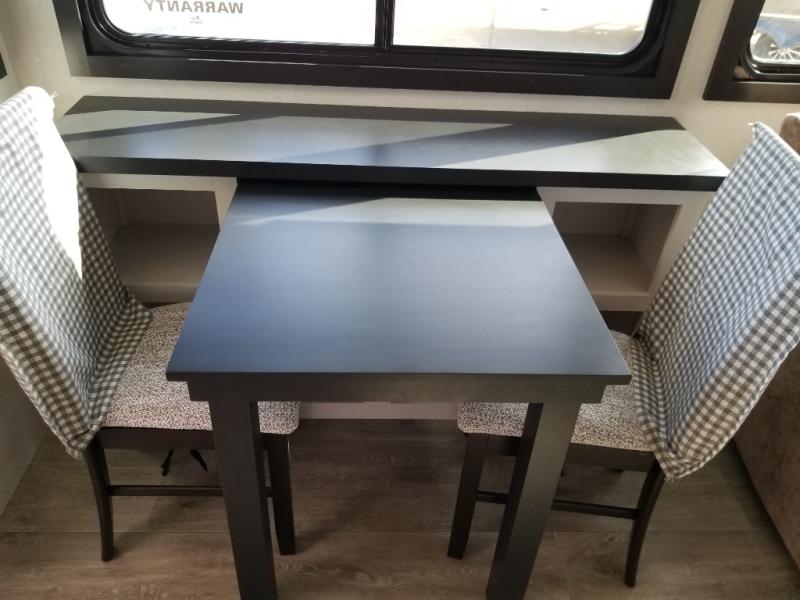 This fifth wheel with four slides is one your whole crew will love! There is a middle bedroom/den with a tri-fold sofa and a desk, allowing this room to become an office if you need it. The loft above this room will be a big hit with the little ones, and the full bath is centrally located so everyone can use it easily. You will have the front private bedroom all to yourselves with a king bed slide out, a chest with TV prep, plus washer and dryer prep in the walk-in closet. The main living area includes everything you need to relax in comfort, like the theater seats, tri-fold sofa, and entertainment center with a fireplace. The chef will enjoy the extra counter space provided by the kitchen island, and there is plenty of storage with the pantry, hutch, and 16 cu. ft. 12V refrigerator. This model even has an outside kitchen, two power awnings, and outside storage for all your gear!