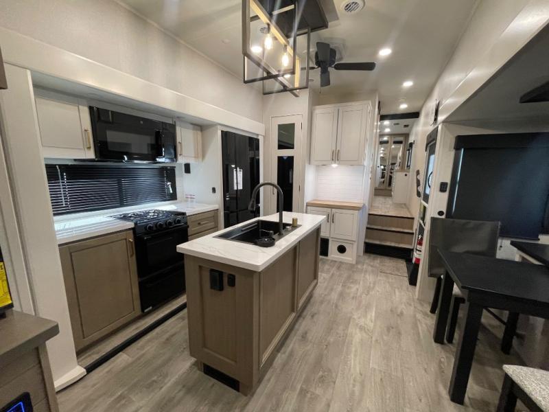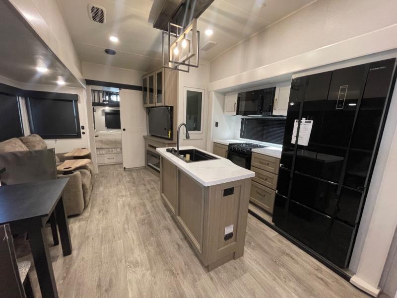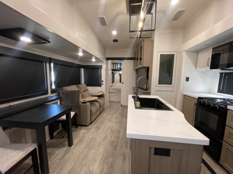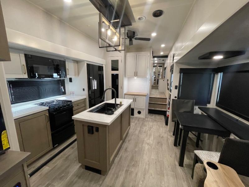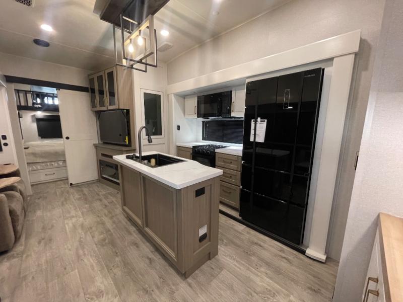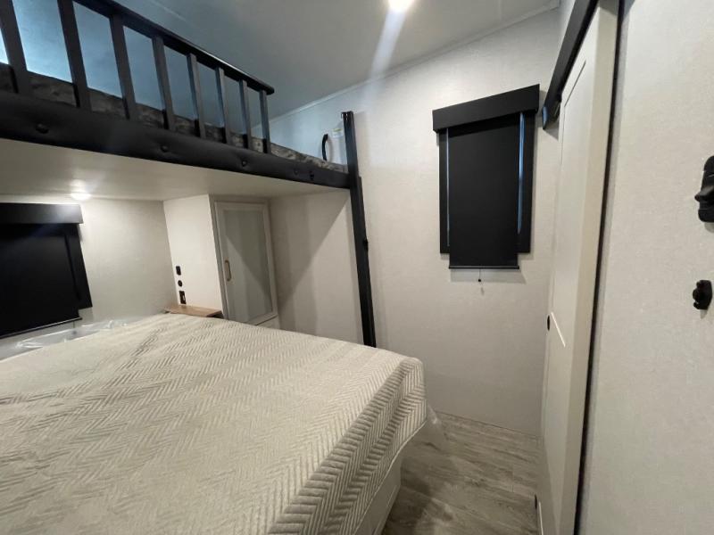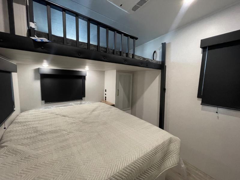 This fifth wheel is decked out in features you will love! The dual slides in the main living area create an open floorplan, and then there is a kitchen island that will make meal prepping easier. The theater seats plus roll tip dinette with chairs have a great view of the entertainment center and fireplace, and there is a ceiling fan here to keep the air moving. And did we mention there is an outside kitchen, complete with an outdoor refrigerator? This model also features a front private bedroom with a king bed slide out, a chest, and a front closet with convenient washer and dryer prep. There is also a rear private bunkhouse that has a 54" x 74" upper loft bed above a 66" x 80" Olympic bed with wardrobe storage drawers, as well as its very own half bathroom!