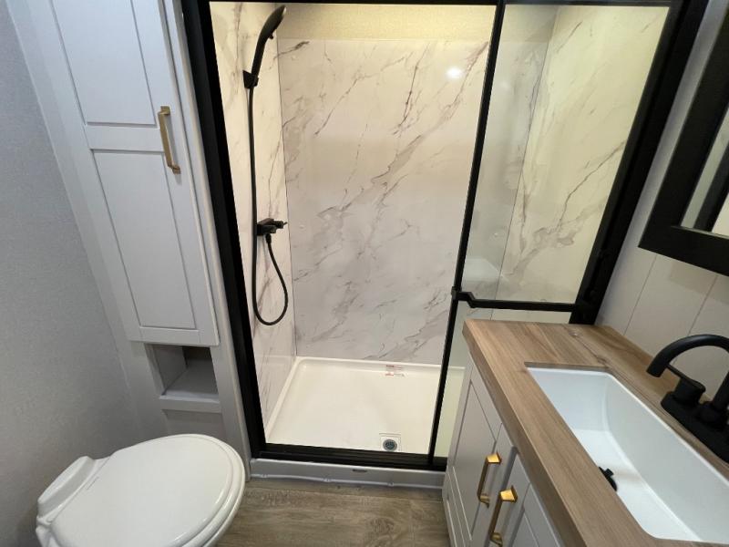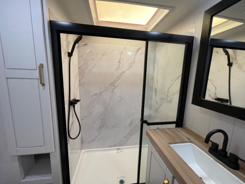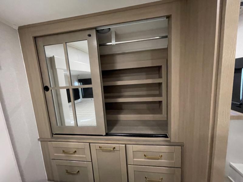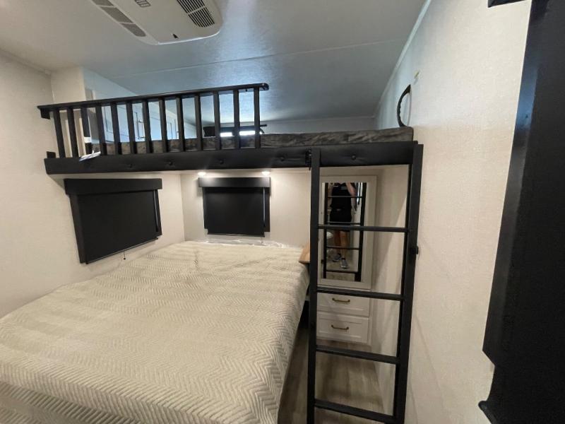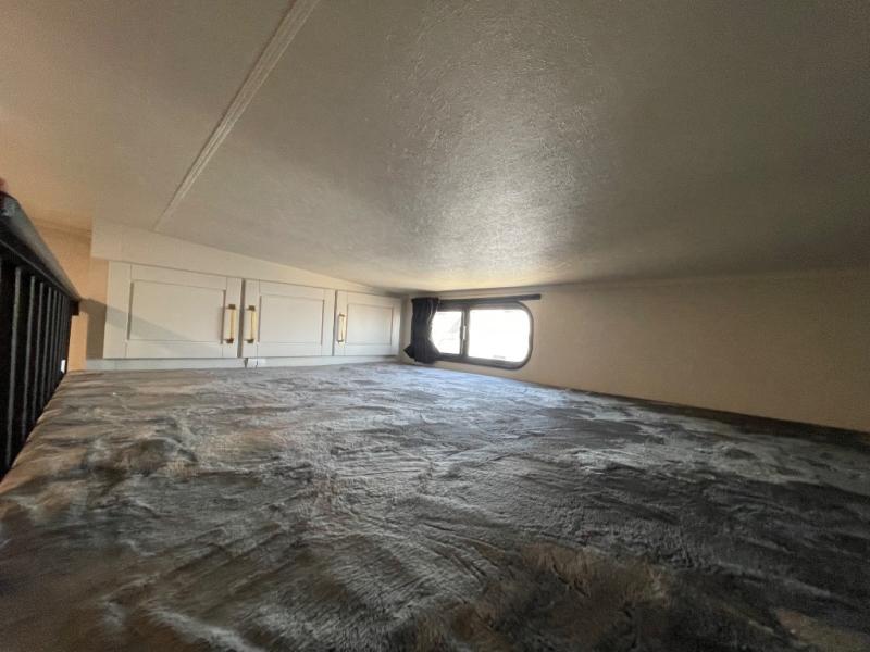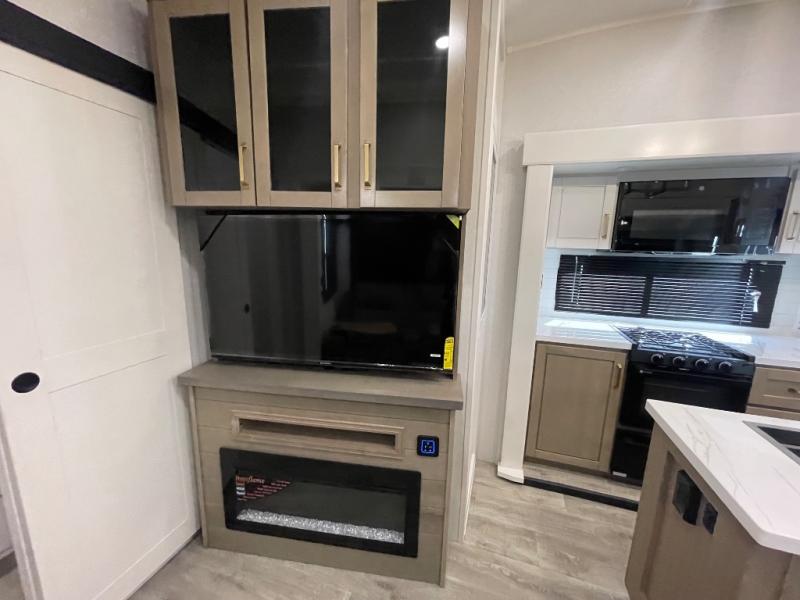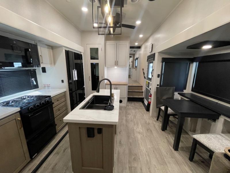 This fifth wheel is decked out in features you will love! The dual slides in the main living area create an open floorplan, and then there is a kitchen island that will make meal prepping easier. The theater seats plus roll tip dinette with chairs have a great view of the entertainment center and fireplace, and there is a ceiling fan here to keep the air moving. And did we mention there is an outside kitchen, complete with an outdoor refrigerator? This model also features a front private bedroom with a king bed slide out, a chest, and a front closet with convenient washer and dryer prep. There is also a rear private bunkhouse that has a 54" x 74" upper loft bed above a 66" x 80" Olympic bed with wardrobe storage drawers, as well as its very own half bathroom!