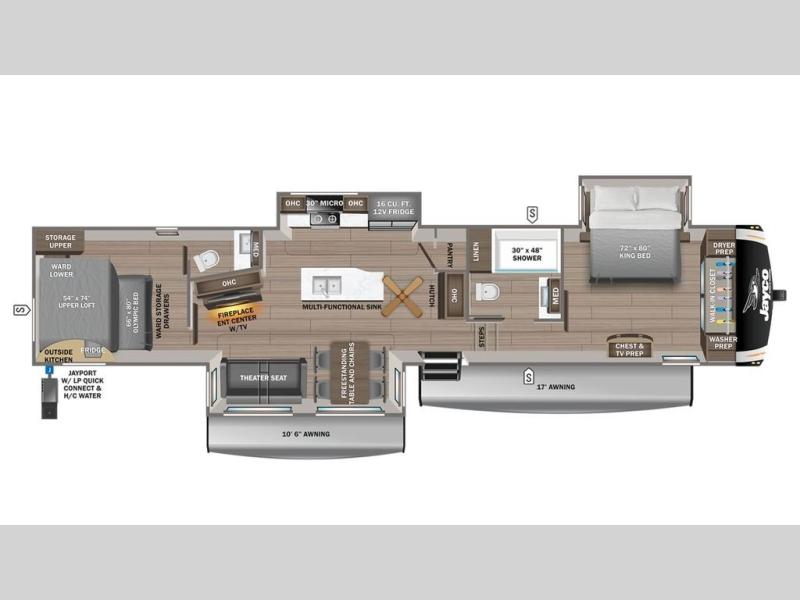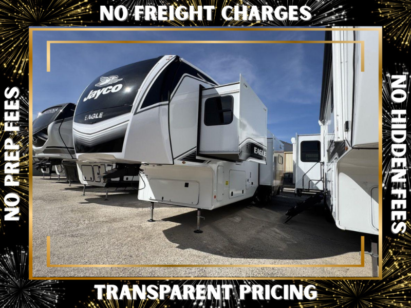 With any Eagle fifth wheel by Jayco you will appreciate durable construction materials, like the Magnum Truss Roof and the Stronghold VBL laminated walls. The JAYCOMMAND Smart RV system puts you in control of your RV's functions, and the 5 Star Handling Package will provide smooth towing from home to camp. Each model features Climate Shield zero-degree tested weather protection and the industry-exclusive HELIX cooling system that features two 15,000 BTU Whisper Quiet A/C's to keep you comfortable year around. Some of the exterior conveniences you are sure to love are the pass-through storage with Slam-Latch baggage doors and an automotive style front cap with max turn radius. The Eagle fifth wheels are designed to make you feel at home with solid hardwood slide fascia, residential vinyl flooring throughout, 100% no floor vents, and blackout roller shades with reflective side throughout for added privacy and insulation.