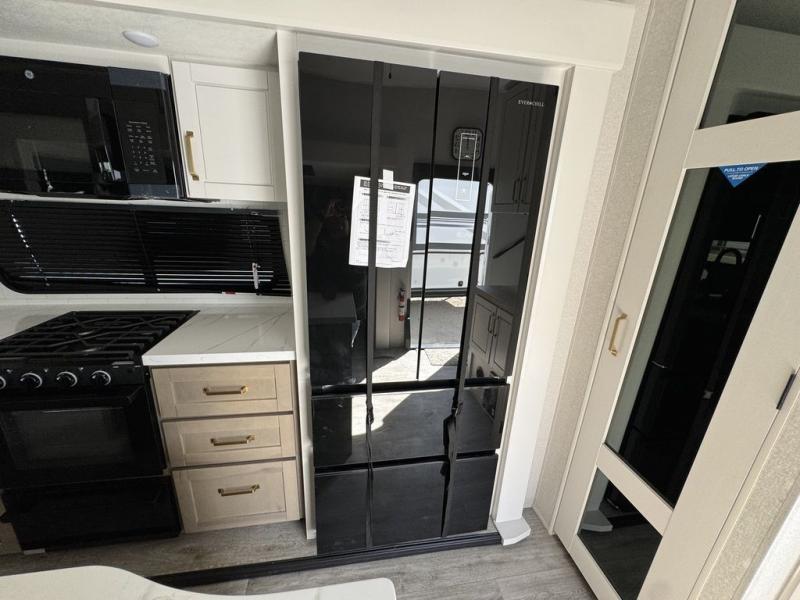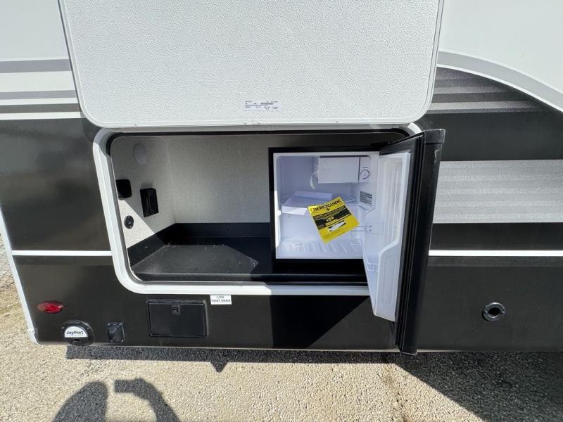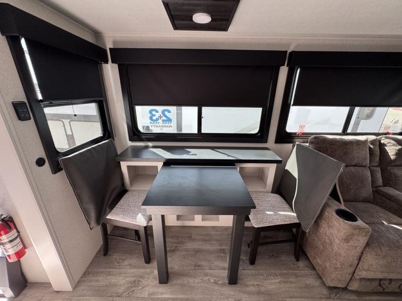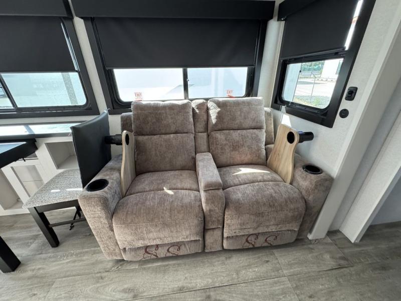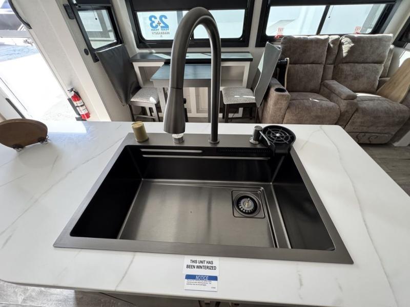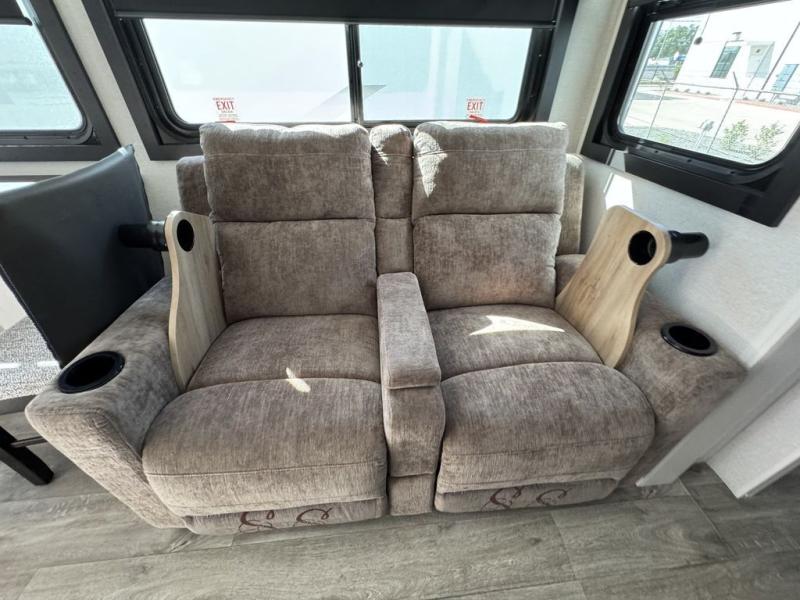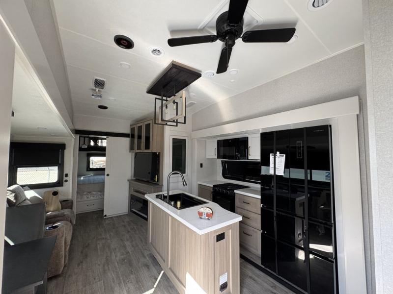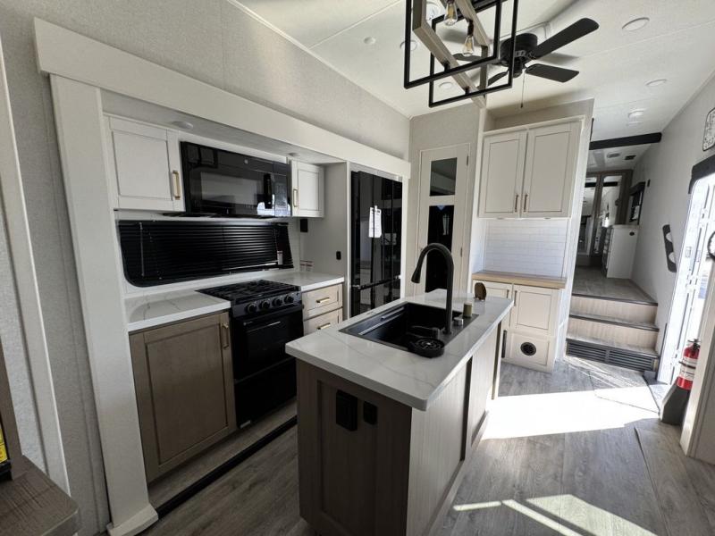 This fifth wheel is decked out in features you will love! The dual slides in the main living area create an open floorplan, and then there is a kitchen island that will make meal prepping easier. The theater seats plus table with chairs and a bench have a great view of the entertainment center and fireplace, and there is a ceiling fan here to keep the air moving. And did we mention there is an outside kitchen, complete with an outdoor refrigerator? This model also features a front private bedroom with a king bed slide out, a chest, and a front closet with convenient washer and dryer prep. There is also a rear private bunkhouse that has a 54" x 74" upper loft bed above a 66" x 80" Olympic bed with wardrobe storage drawers, as well as its very own half bathroom!