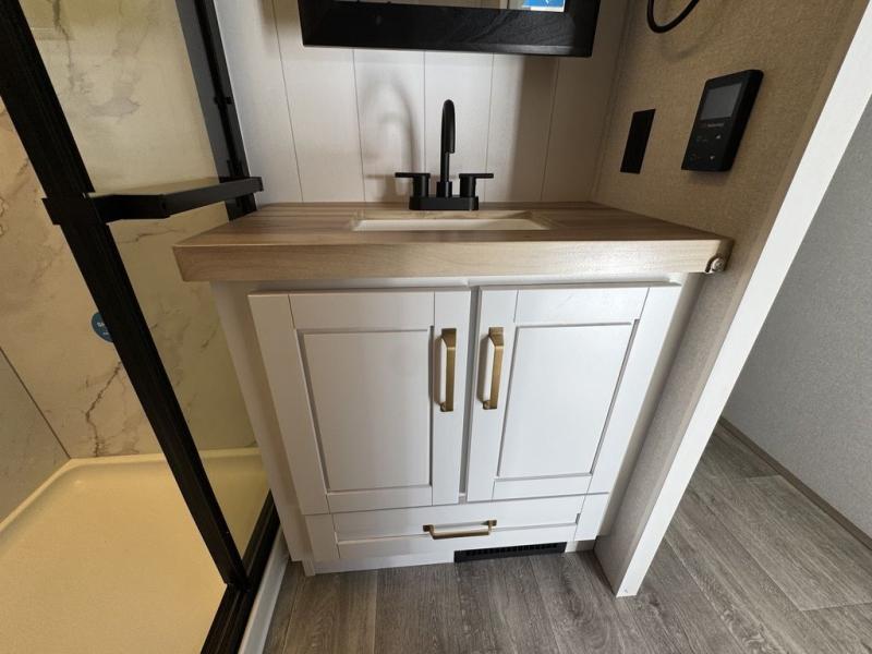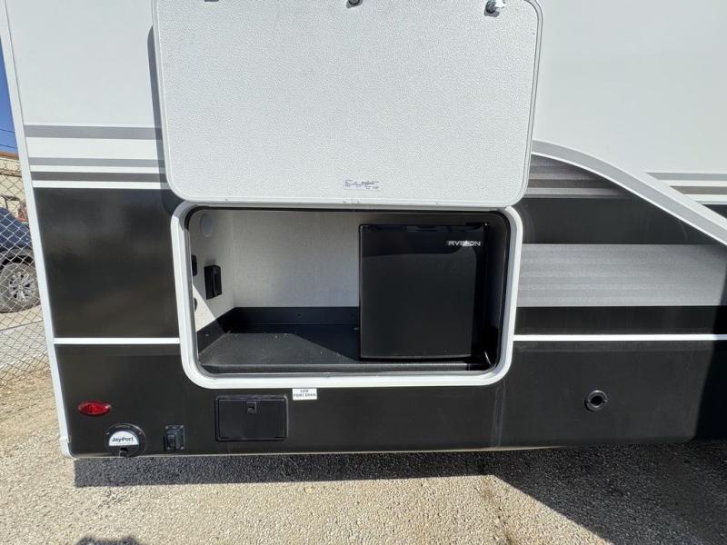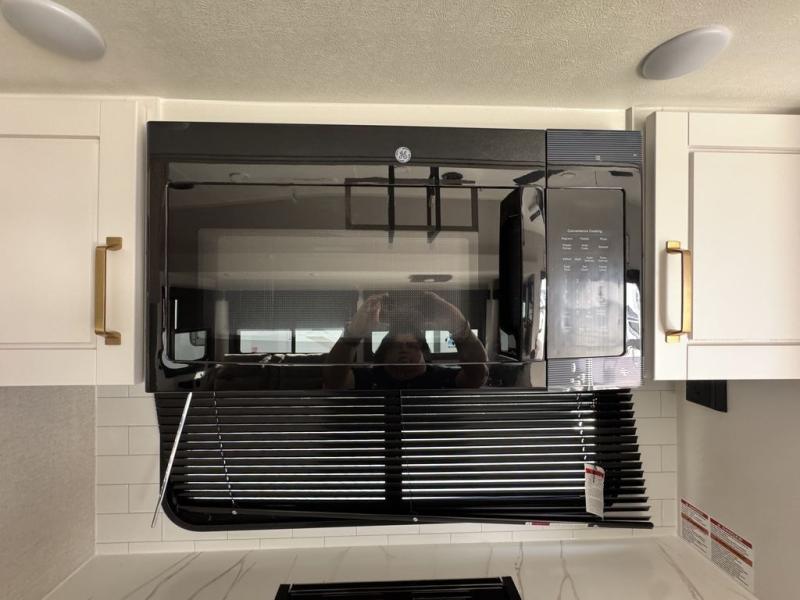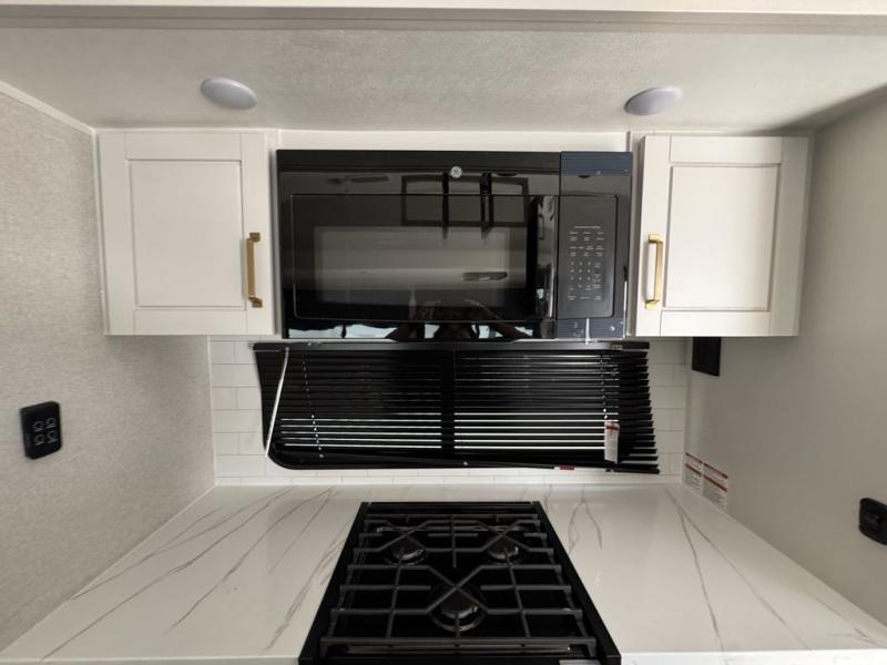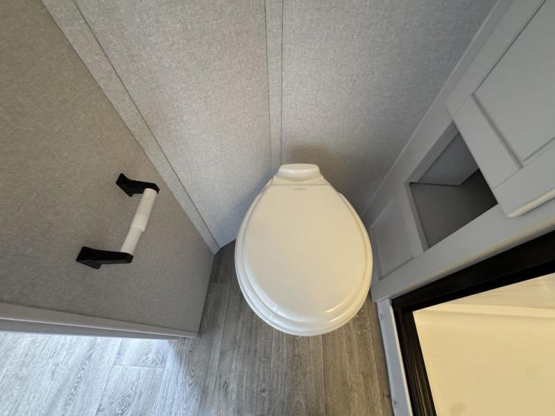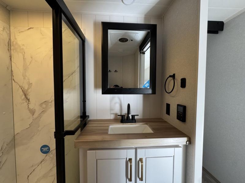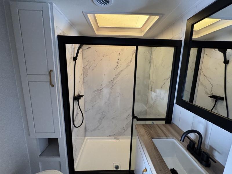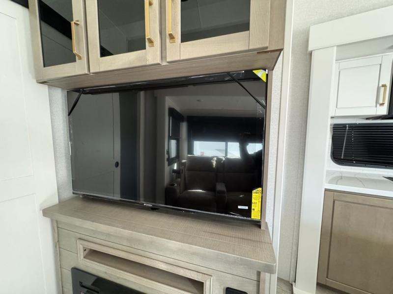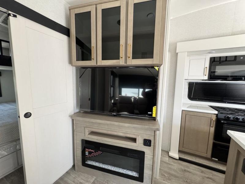 This fifth wheel is decked out in features you will love! The dual slides in the main living area create an open floorplan, and then there is a kitchen island that will make meal prepping easier. The theater seats plus table with chairs and a bench have a great view of the entertainment center and fireplace, and there is a ceiling fan here to keep the air moving. And did we mention there is an outside kitchen, complete with an outdoor refrigerator? This model also features a front private bedroom with a king bed slide out, a chest, and a front closet with convenient washer and dryer prep. There is also a rear private bunkhouse that has a 54" x 74" upper loft bed above a 66" x 80" Olympic bed with wardrobe storage drawers, as well as its very own half bathroom!