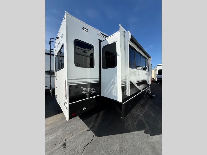 With any Eagle fifth wheel by Jayco you will appreciate durable construction materials, like the Magnum Truss Roof and the Stronghold VBL laminated walls. The JAYCOMMAND Smart RV system puts you in control of your RV's functions, and the 5 Star Handling Package will provide smooth towing from home to camp. Each model features Climate Shield zero-degree tested weather protection and the industry-exclusive HELIX cooling system that features two 15,000 BTU Whisper Quiet A/C's to keep you comfortable year around. Some of the exterior conveniences you are sure to love are the pass-through storage with Slam-Latch baggage doors and an automotive style front cap with max turn radius. The Eagle fifth wheels are designed to make you feel at home with solid hardwood slide fascia, residential vinyl flooring throughout, 100% no floor vents, and blackout roller shades with reflective side throughout for added privacy and insulation.