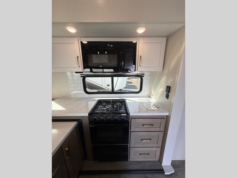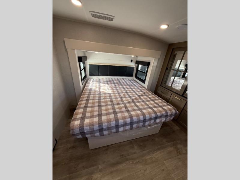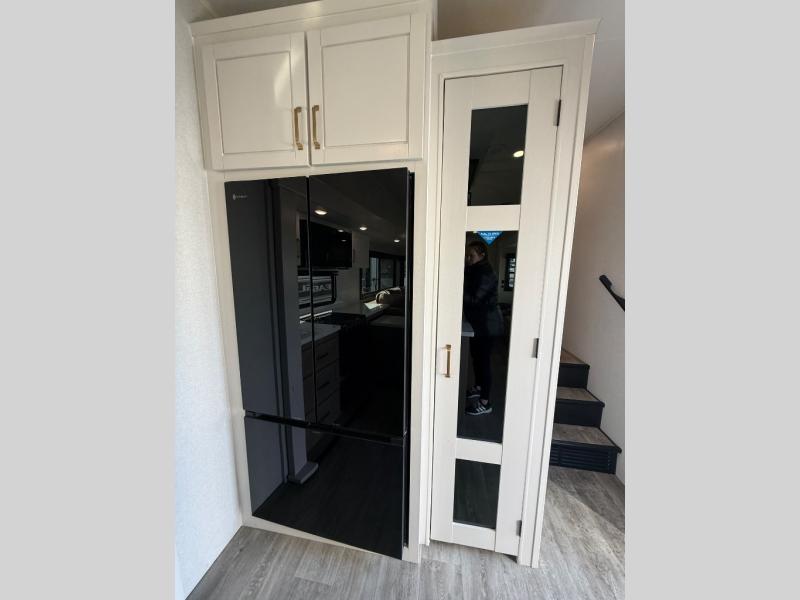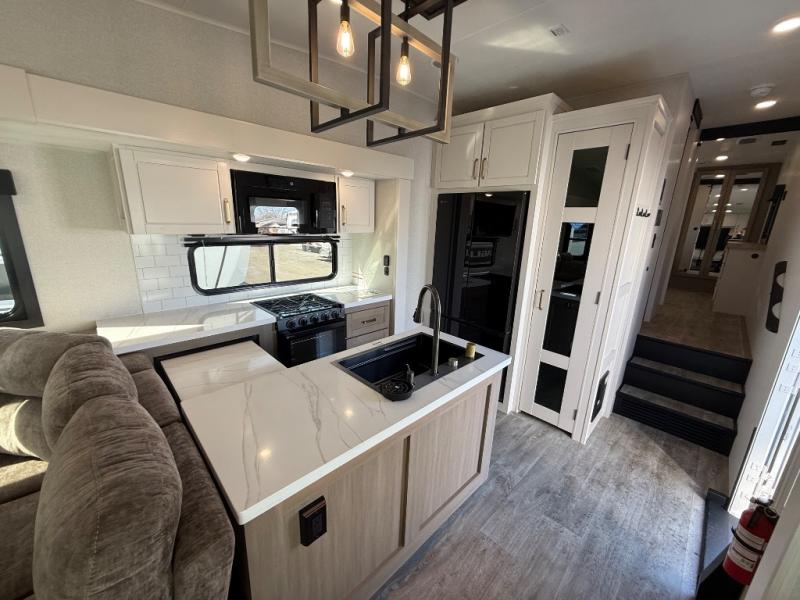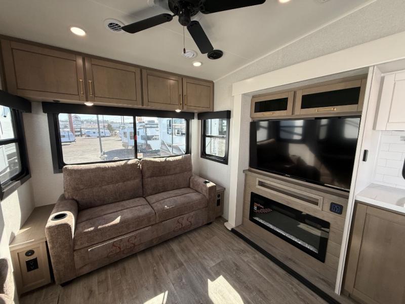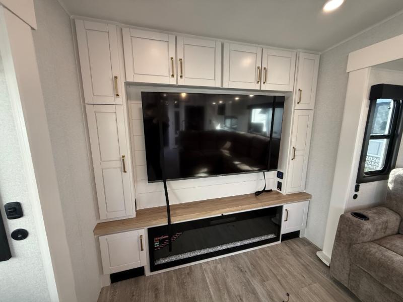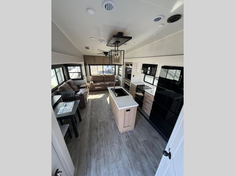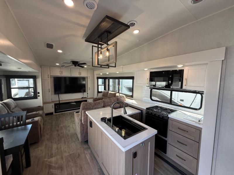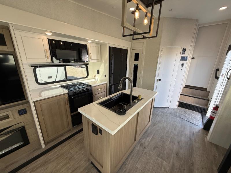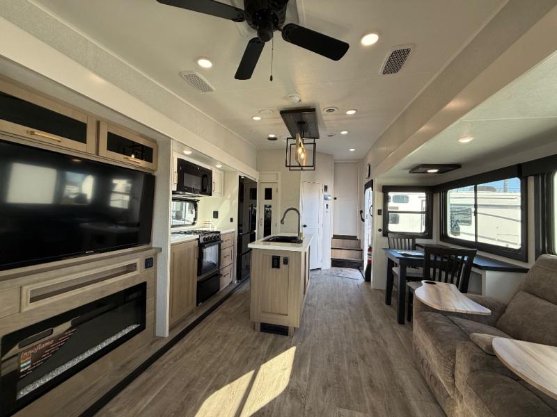 Enjoy a private bedroom suite in this fifth wheel! The king bed is positioned in a slide out for maximum room, and a sliding door leads to the front bath which is full of luxurious features. Enjoy a 30" x 60" shower. There's also a walk-in front closet which has washer and dryer prep if you want to add those appliances. You'll love the living area with its theater seats, tri-fold sofa, ceiling fan, and entertainment center with fireplace. The kitchen has a three burner cooktop, center island with a multi-functional sink, 30" microwave oven over the range, and a 16 cu. ft. 12 volt refrigerator - perfect for cooking up great meals. And the additional overhead storage over the half bath will be perfect for luggage!