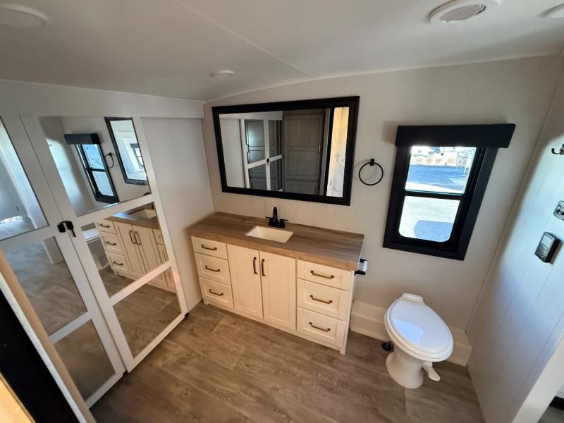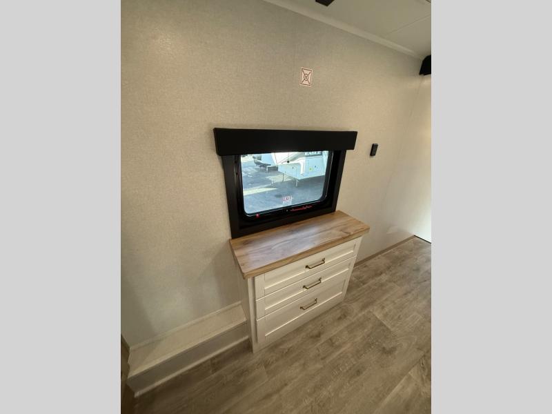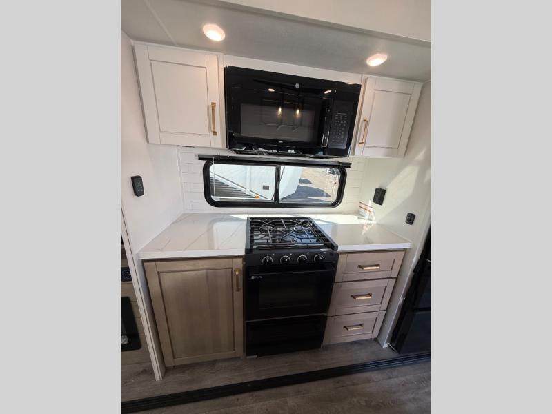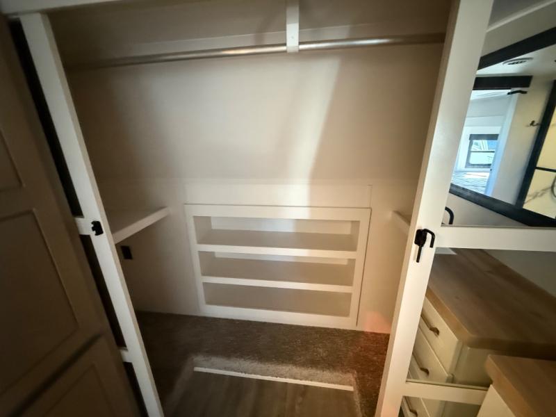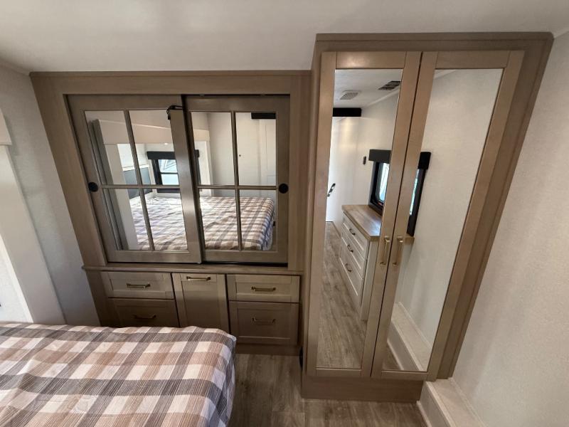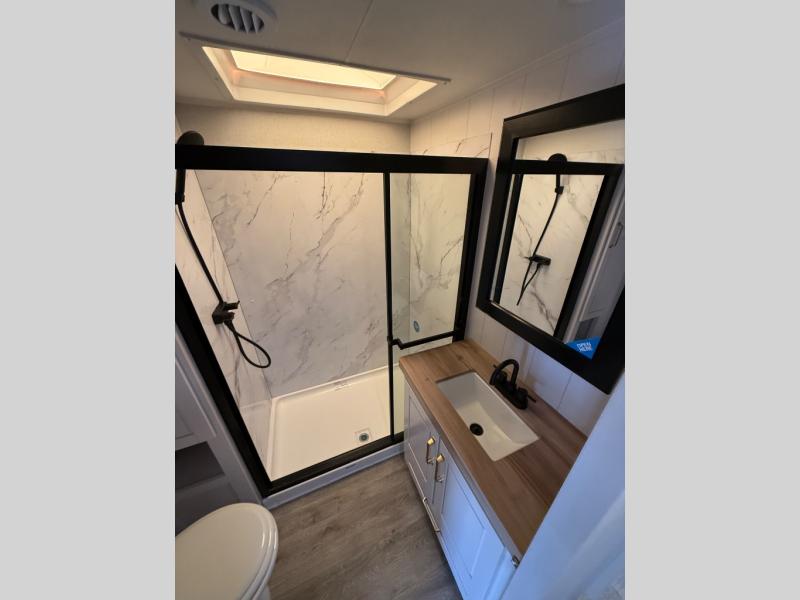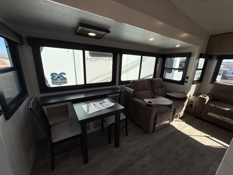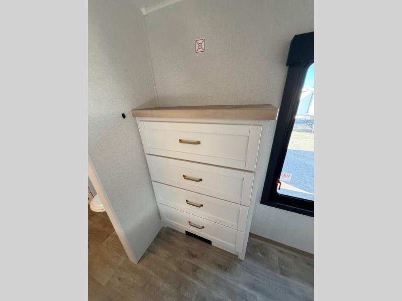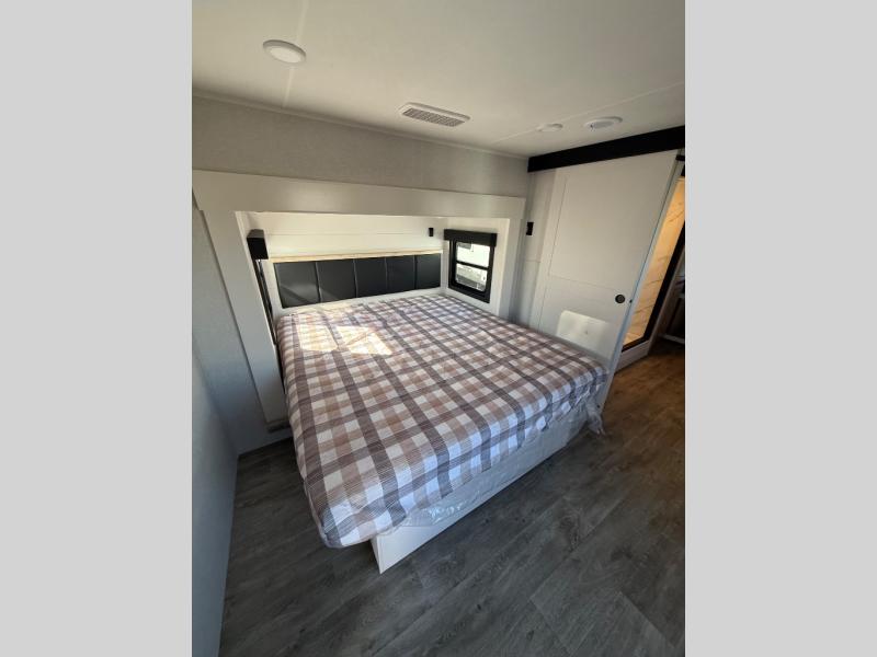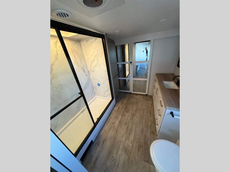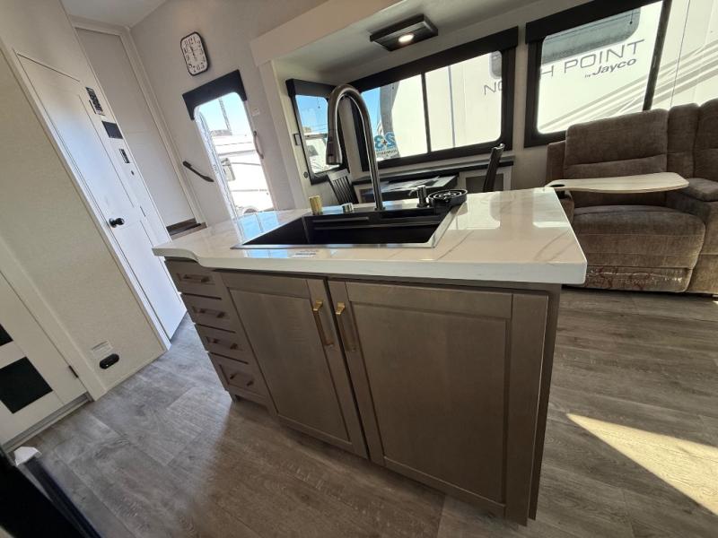 Enjoy a private bedroom suite in this fifth wheel! The king bed is positioned in a slide out for maximum room, and a sliding door leads to the front bath which is full of luxurious features. Enjoy a 30" x 60" shower. There's also a walk-in front closet which has washer and dryer prep if you want to add those appliances. You'll love the living area with its theater seats, tri-fold sofa, ceiling fan, and entertainment center with fireplace. The kitchen has a three burner cooktop, center island with a multi-functional sink, 30" microwave oven over the range, and a 16 cu. ft. 12 volt refrigerator - perfect for cooking up great meals. And the additional overhead storage over the half bath will be perfect for luggage!