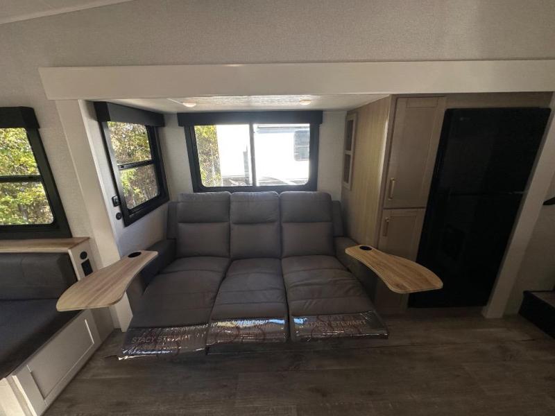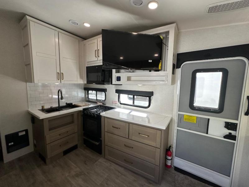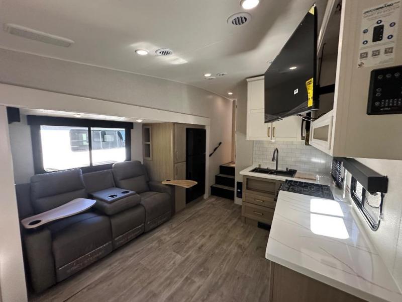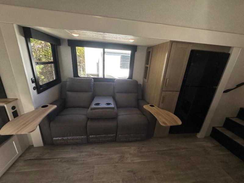 You'll have everything you need in this fifth wheel for enjoyable trips to the lake. Once you arrive at your destination, set up the 16' power awning, grab the fishing poles from the pass-through storage, and relax with a cold drink. And there is a Jayport with LP Quick Connect if you want to bring along your griddle. You and your group can head inside to play a game around the U-shaped dinette or relax on the theater seat across from the TV. The full kitchen includes a black and stainless 21" range, a GE microwave, plus a 12V refrigerator for perishables, and the full bath will let you clean up each day. When you're ready to call it a night, head to the front private bedroom for a great night's rest on the Olympic-size queen bed with dual wardrobes, while your guests sleep on the dinette!