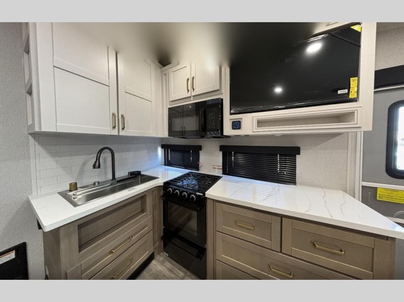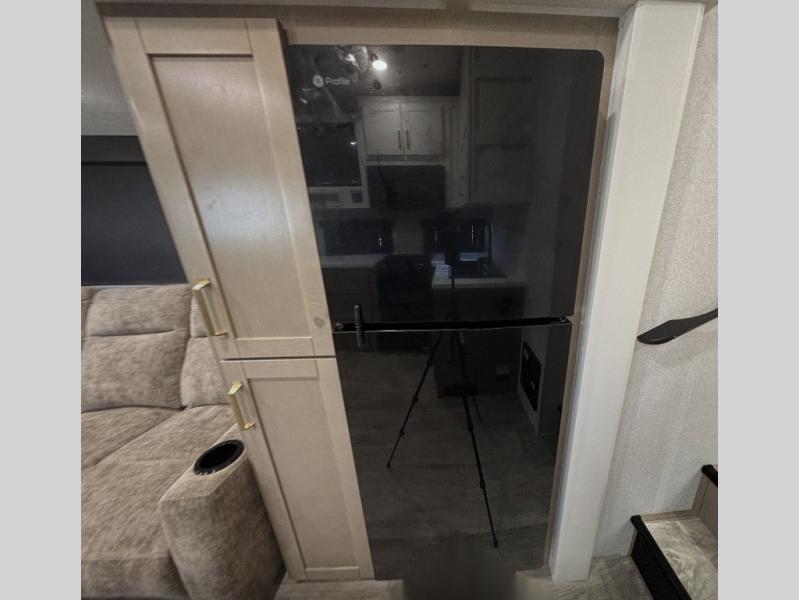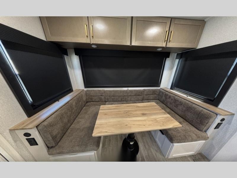 You'll have everything you need in this fifth wheel for enjoyable trips to the lake. Once you arrive at your destination, set up the 16' power awning, grab the fishing poles from the pass-through storage, and relax with a cold drink. And there is a Jayport with LP Quick Connect if you want to bring along your griddle. You and your group can head inside to play a game around the U-shaped dinette or relax on the theater seat across from the TV. The full kitchen includes a black and stainless 21" range, a GE microwave, plus a 12V refrigerator for perishables, and the full bath will let you clean up each day. When you're ready to call it a night, head to the front private bedroom for a great night's rest on the Olympic-size queen bed with dual wardrobes, while your guests sleep on the dinette!
