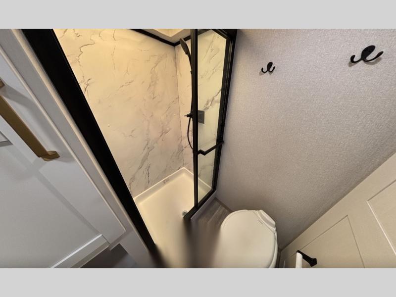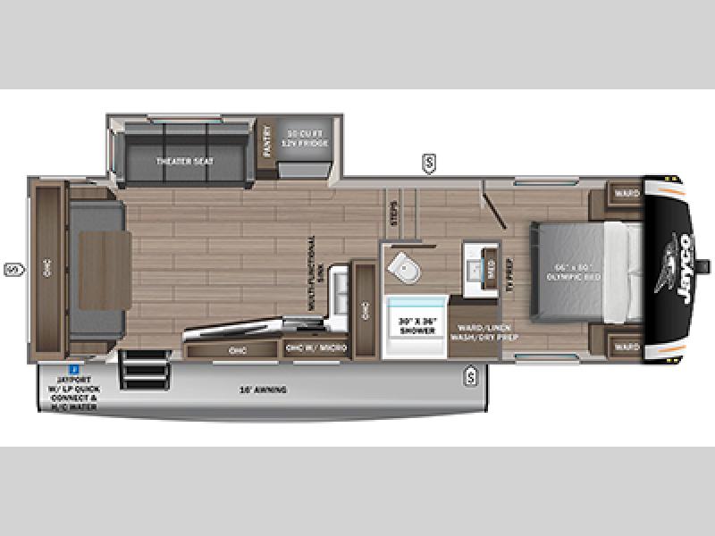 You'll have everything you need in this fifth wheel for enjoyable trips to the lake. Once you arrive at your destination, set up the 16' power awning, grab the fishing poles from the pass-through storage, and relax with a cold drink. And there is a Jayport with LP Quick Connect if you want to bring along your griddle. You and your group can head inside to play a game around the U-shaped dinette or relax on the theater seat across from the TV. The full kitchen includes a black and stainless 21" range, a GE microwave, plus a 12V refrigerator for perishables, and the full bath will let you clean up each day. When you're ready to call it a night, head to the front private bedroom for a great night's rest on the Olympic-size queen bed with dual wardrobes, while your guests sleep on the dinette!