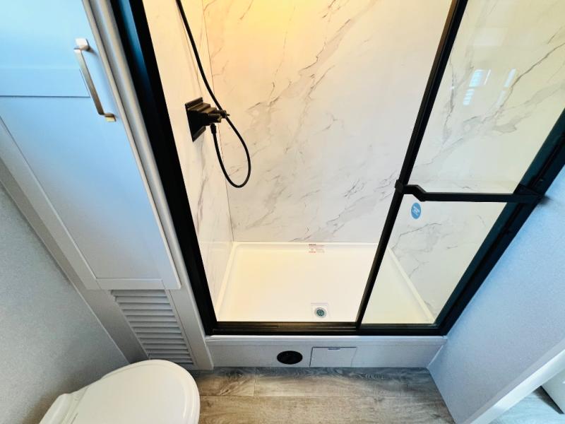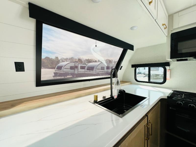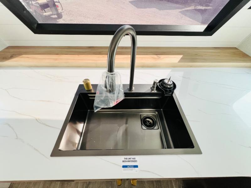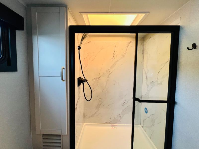This is the perfect travel trailer for the couple who loves comfort at the campground! The front kitchen features ample counter space, including a bartop with barstool chairs and all the appliances to make your best meals. If you'd rather be outside, there is an outdoor kitchen and a power awning where you can spend your evenings. The master bedroom includes an Olympic-size queen bed slide out, a dresser, plus a wardrobe with washer and dryer prep. And don't overlook the full rear bath, complete with a 30" x 48" shower, a linen closet, and dual bath sinks so you both can get ready at the same time!