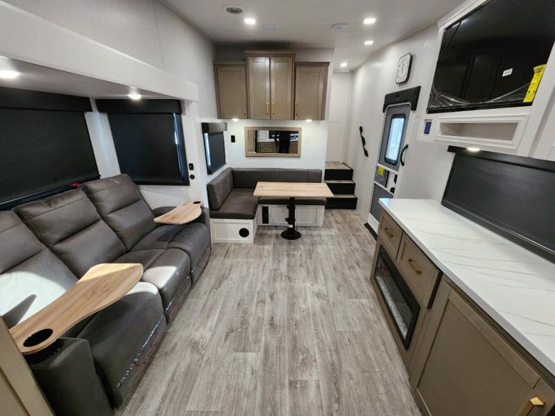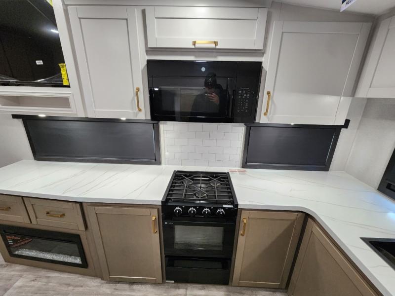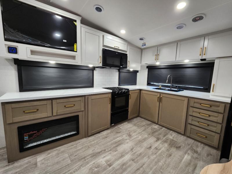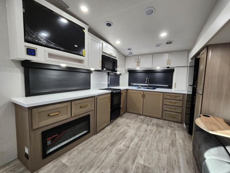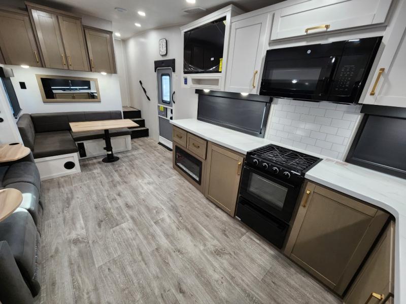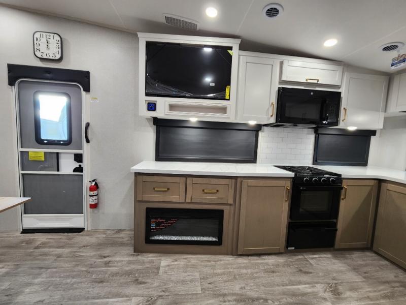 This fifth wheels is perfect for extended stays at the campground or weekend trips to the lake! Once you arrive at your destination, you can set up the 18' electric awning, then make lunch on the outside kitchen. The main living area will be a favorite place to join together since there is a theater seat across from the TV, an L-shaped dinette, and a fireplace to make this space even more cozy. Up front, a private bedroom includes an Olympic queen bed, dual wardrobes, plus washer and dryer prep if choose to add those appliances.