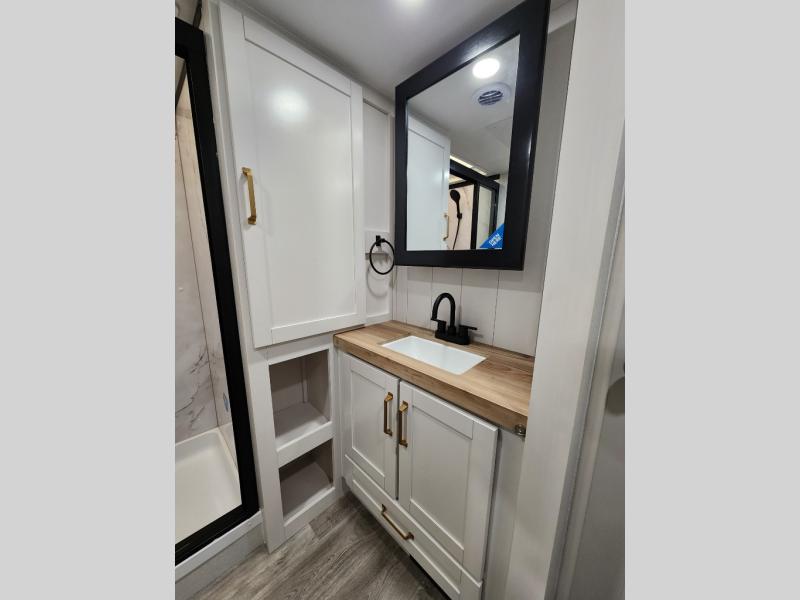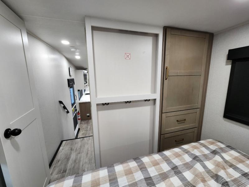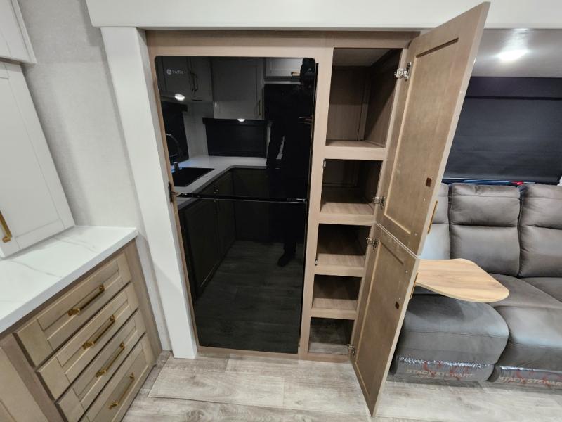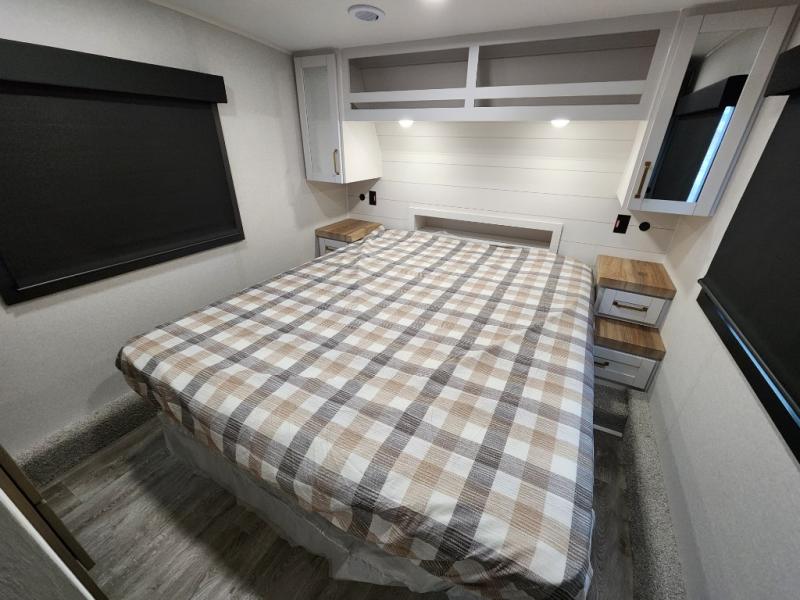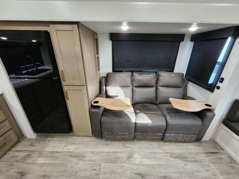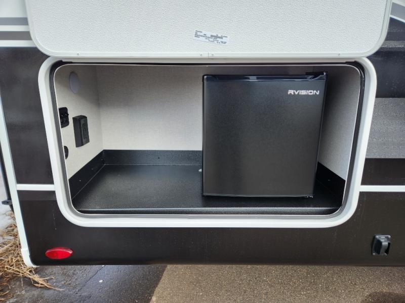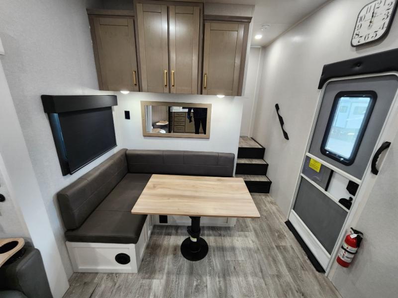 This fifth wheels is perfect for extended stays at the campground or weekend trips to the lake! Once you arrive at your destination, you can set up the 18' electric awning, then make lunch on the outside kitchen. The main living area will be a favorite place to join together since there is a theater seat across from the TV, an L-shaped dinette, and a fireplace to make this space even more cozy. Up front, a private bedroom includes an Olympic queen bed, dual wardrobes, plus washer and dryer prep if choose to add those appliances.