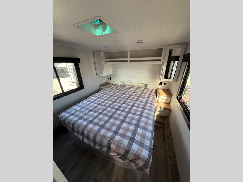 With any Eagle HT fifth wheel or travel trailer by Jayco you will enjoy a smooth drive thanks to the 4 Star Handling Package and MORryde CRE-3000 rubberized suspension. The Customer Value Package includes amenities that are sure to make camping easier than ever, like the 60K on-demand water heater, Keyed-Alike lock system, 15,000 BTU "Whisper Quiet" A/C, and more. Handcrafted door/drawer fronts will make your space feel more like home, along with residential vinyl flooring throughout, GE appliances, and blackout roller shades with reflective side throughout to keep the sun out when you want to sleep in. Each model also includes a NuVo H2O water treatment system with filters included, interior and exterior "Blue Sync" audio connect with MB Quart Sound for your TV and phone, and 100% no floor vents for added comfort and convenience!