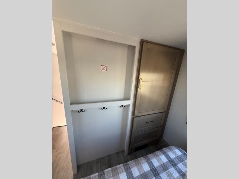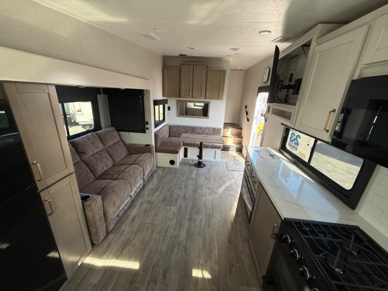 This fifth wheels is perfect for extended stays at the campground or weekend trips to the lake! Once you arrive at your destination, you can set up the 18' electric awning, then make lunch on the outside kitchen. The main living area will be a favorite place to join together since there is a theater seat across from the TV, an L-shaped dinette, and a fireplace to make this space even more cozy. Up front, a private bedroom includes an Olympic queen bed, dual wardrobes, plus washer and dryer prep if choose to add those appliances.