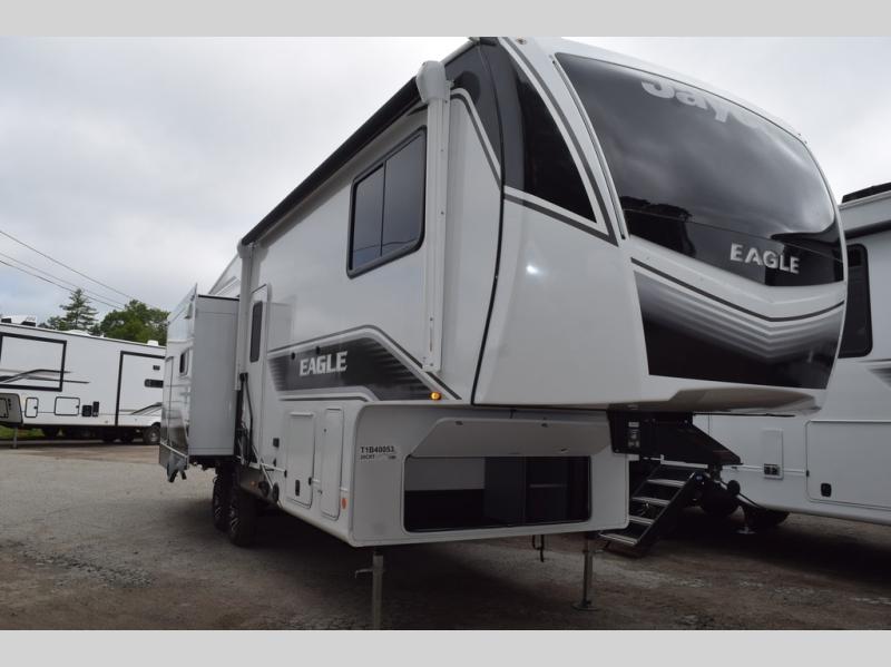 With any Eagle HT fifth wheel or travel trailer by Jayco you will enjoy a smooth drive thanks to the 4 Star Handling Package and MORryde CRE-3000 rubberized suspension. The Customer Value Package includes amenities that are sure to make camping easier than ever, like the 60K on-demand water heater, Keyed-Alike lock system, 15,000 BTU "Whisper Quiet" A/C, and more. Handcrafted door/drawer fronts will make your space feel more like home, along with residential vinyl flooring throughout, GE appliances, and blackout roller shades with reflective side throughout to keep the sun out when you want to sleep in. Each model also includes a NuVo H2O water treatment system with filters included, interior and exterior "Blue Sync" audio connect with MB Quart Sound for your TV and phone, and 100% no floor vents for added comfort and convenience!