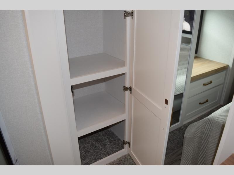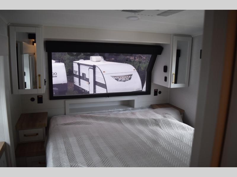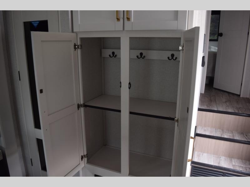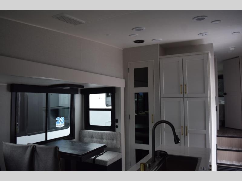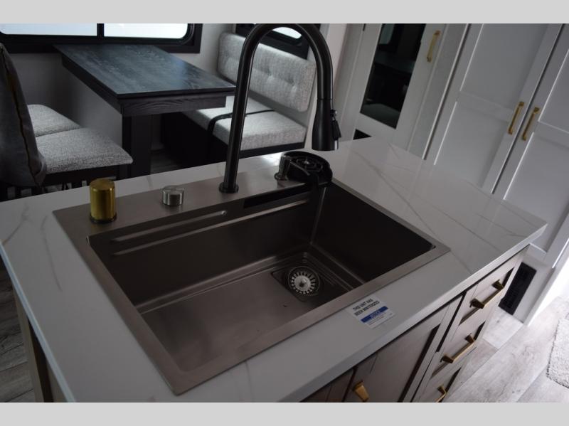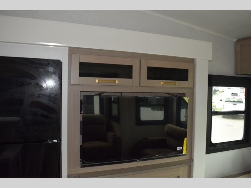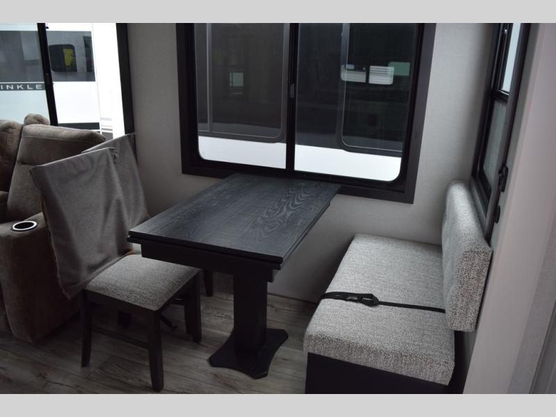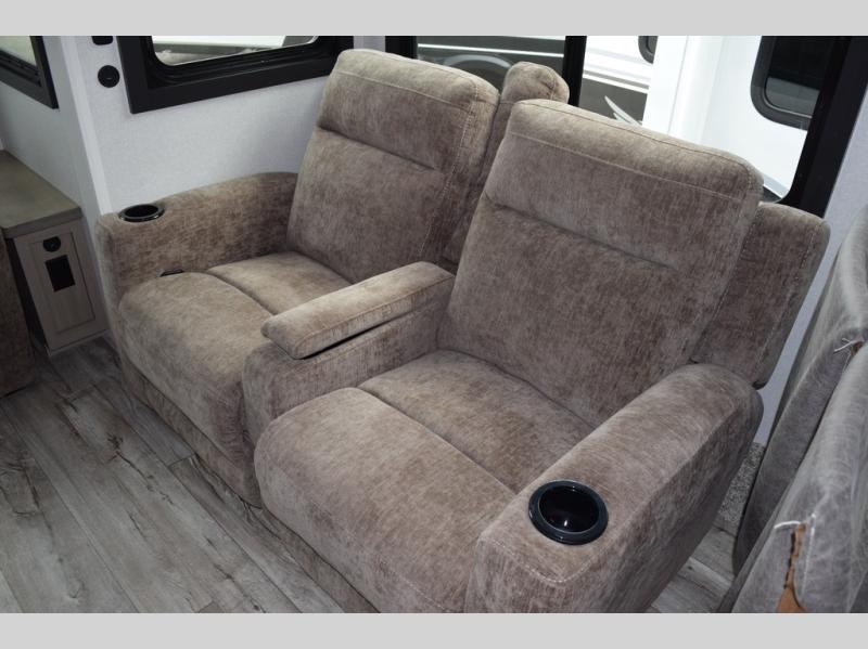 Pack your bags and head off on adventure in this spacious fifth wheel for four! The dual opposing slides in the kitchen and main living area will give your crew more space to relax. Speaking of relaxing, there is a theater seat across from the fireplace and TV plus a tri-fold sofa to make it a movie night. The free-standing table includes two chairs on one side and a bench on the other, and the kitchen island is sure to be appreciated by the chef of your group. There is also a spacious kitchen pantry and an outside kitchen if they'd rather cook outdoors. The front master bedroom includes an Olympic queen bed, dual wardrobes plus a third wardrobe within the bedroom slide out, and TV prep if you want the option to watch a show in bed!