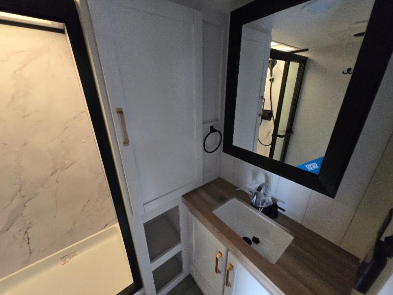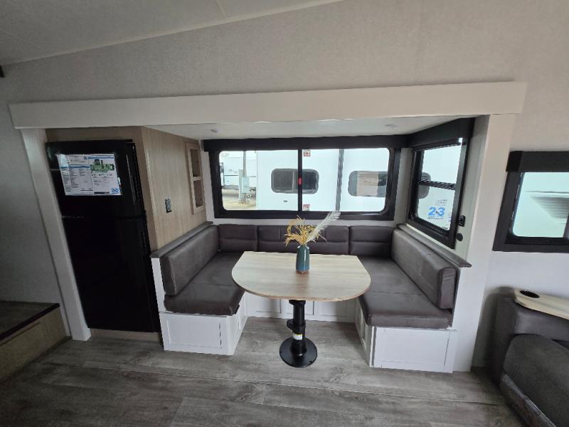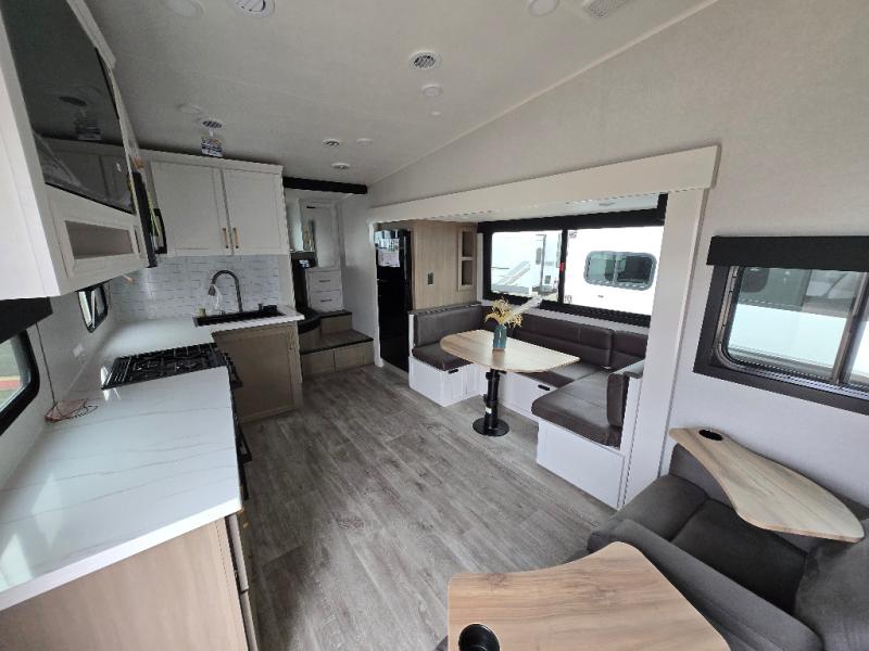If you're needing a fifth wheel with more sleeping space, this unit will be perfect for you! There are double-size bunks in the back with a wardrobe for your guests' things and TV prep if you want to add a TV here. The front private bedroom up front will have you feeling right at home with its Olympic queen bed and dual wardrobes, and any additional guests you have can sleep on the U-shaped dinette within the slide out. There is also a theater seat here where you can relax with a good book in the evenings.