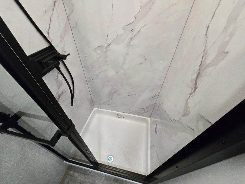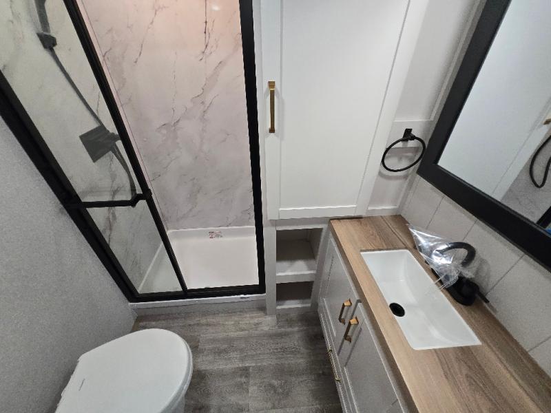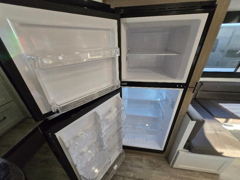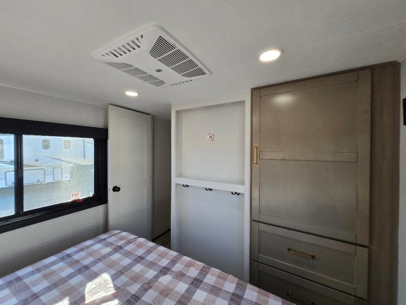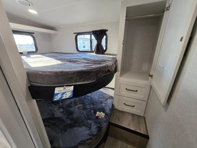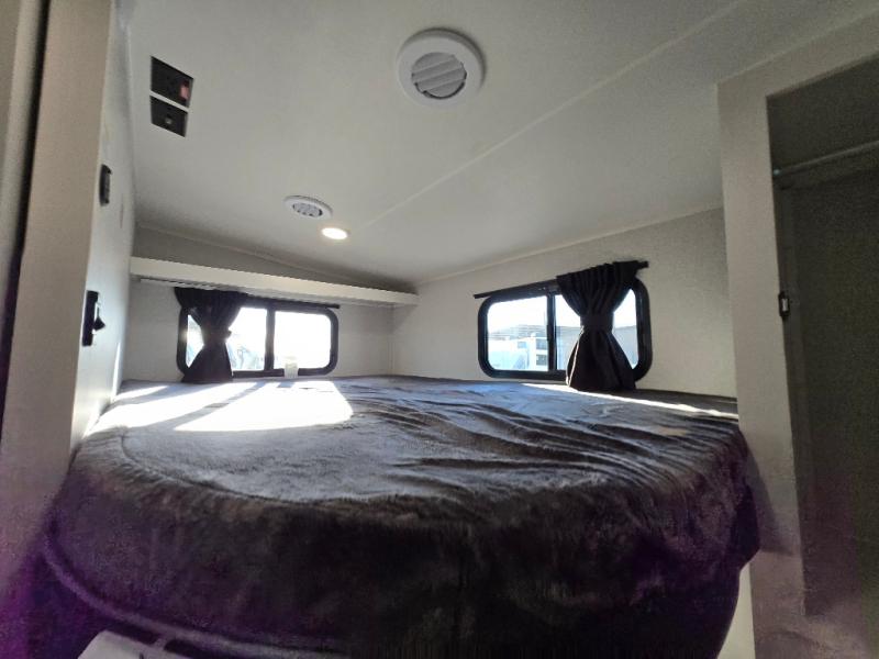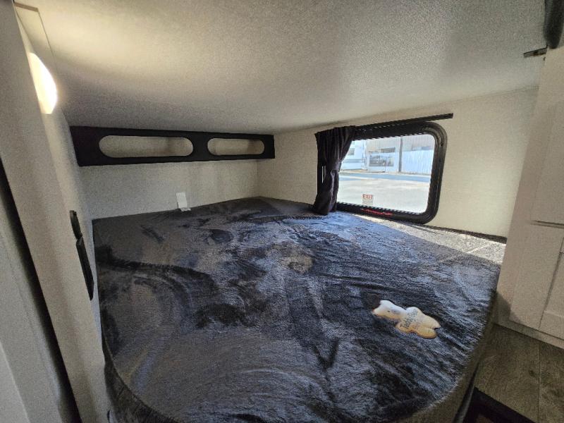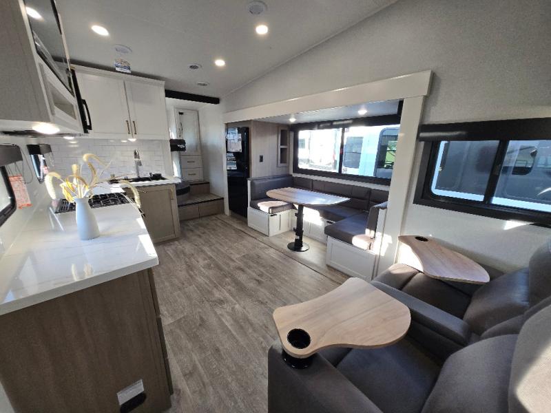 If you're needing a fifth wheel with more sleeping space, this unit will be perfect for you! There are double-size bunks in the back with a wardrobe for your guests' things and TV prep if you want to add a TV here. The front private bedroom up front will have you feeling right at home with its Olympic queen bed and dual wardrobes, and any additional guests you have can sleep on the U-shaped dinette within the slide out. There is also a theater seat here where you can relax with a good book in the evenings.