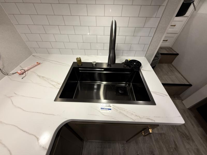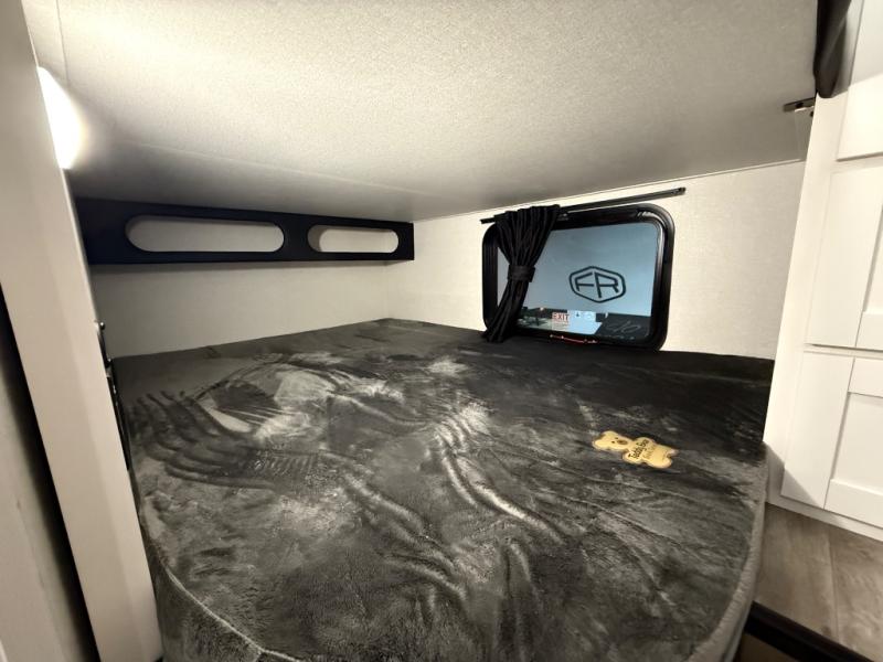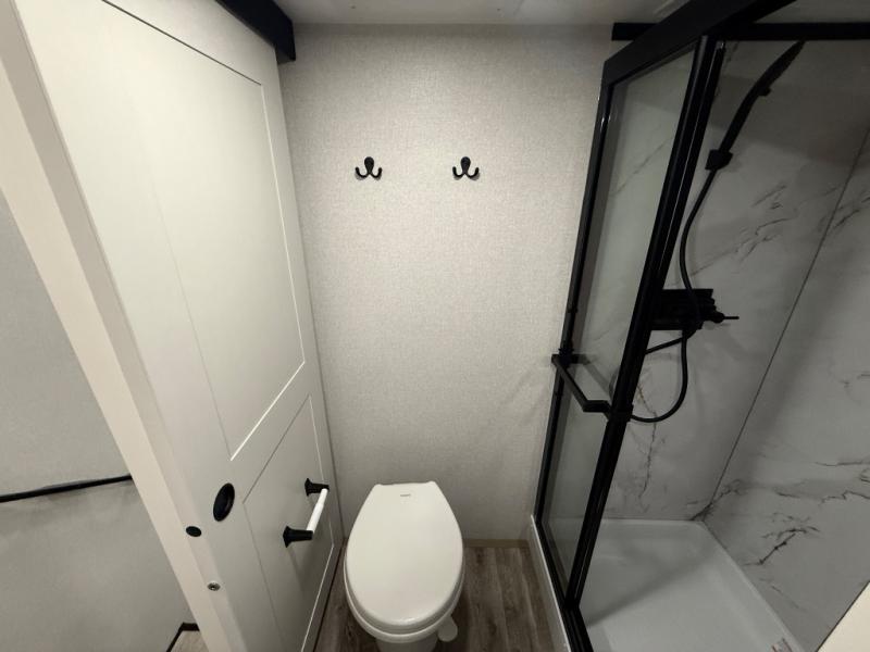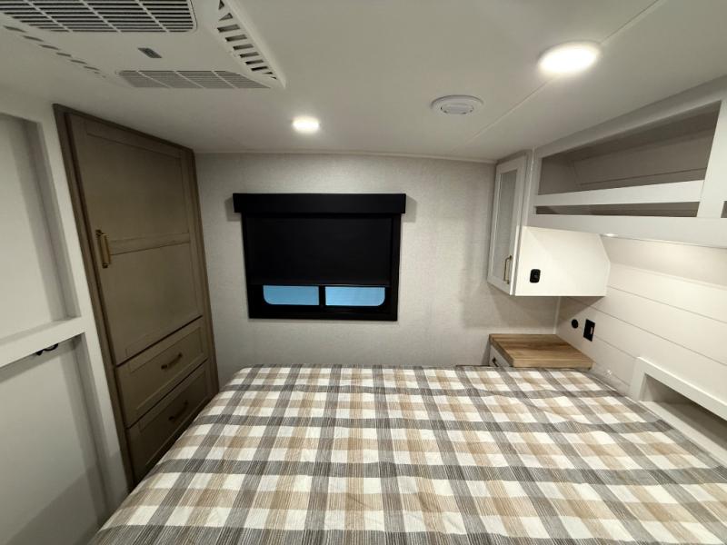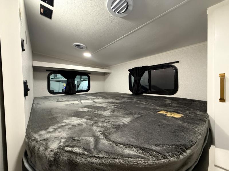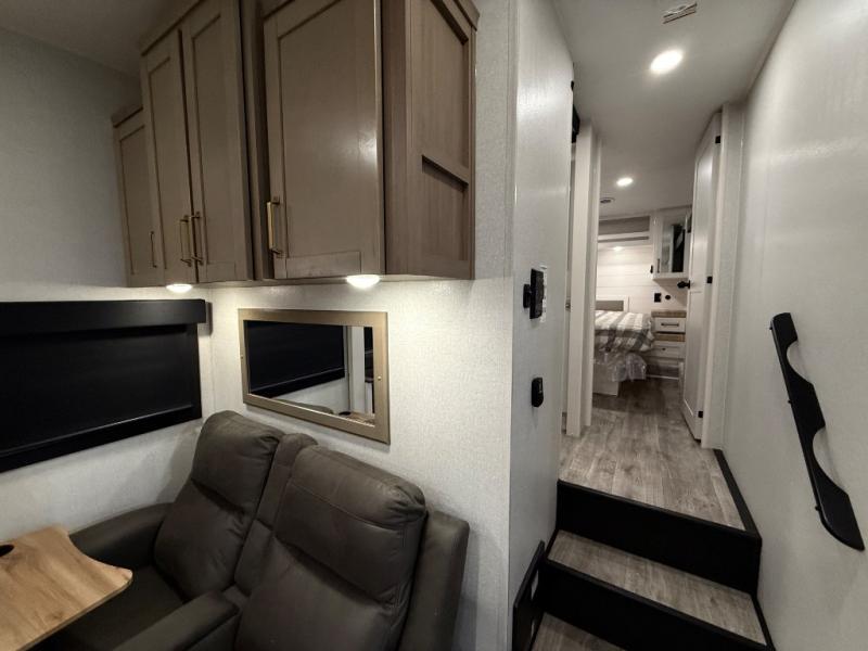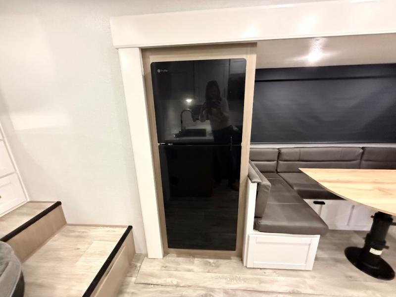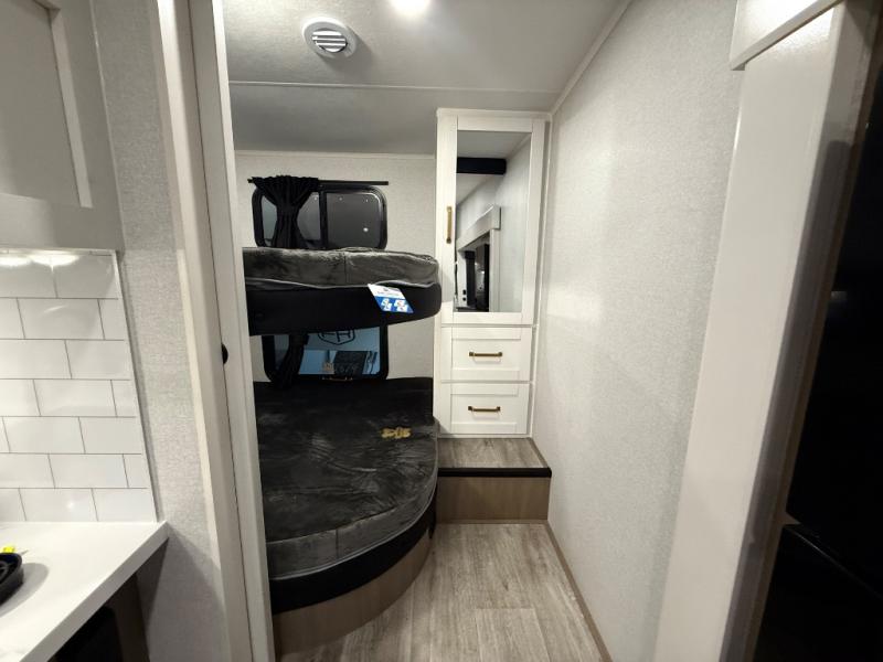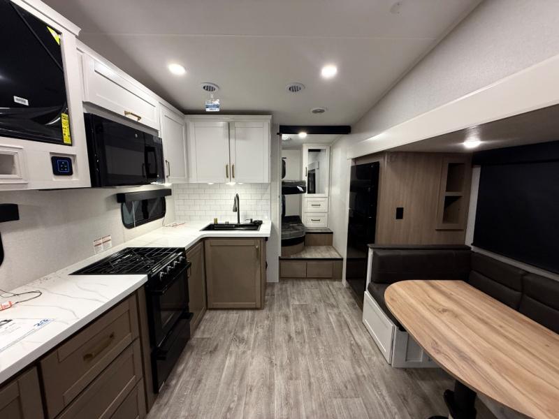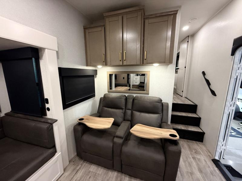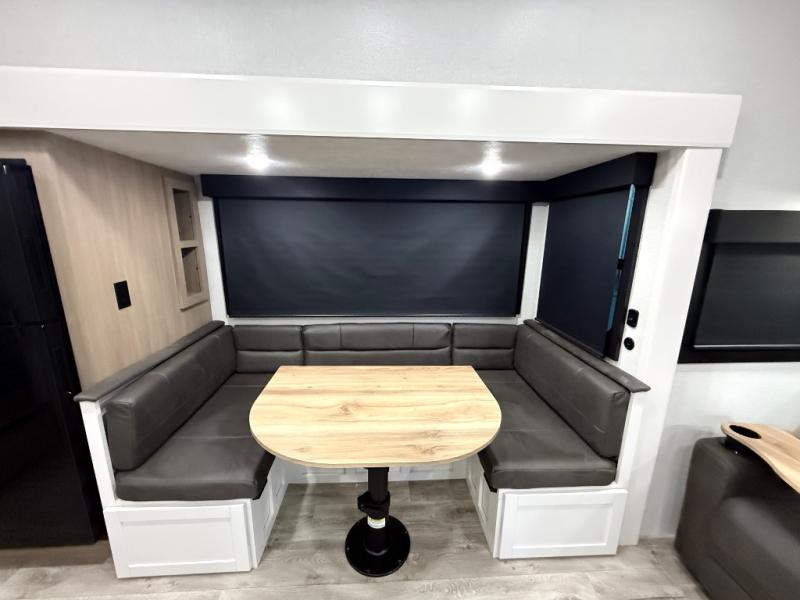 If you're needing a fifth wheel with more sleeping space, this unit will be perfect for you! There are double-size bunks in the back with a wardrobe for your guests' things and TV prep if you want to add a TV here. The front private bedroom up front will have you feeling right at home with its Olympic queen bed and dual wardrobes, and any additional guests you have can sleep on the U-shaped dinette within the slide out. There is also a theater seat here where you can relax with a good book in the evenings.