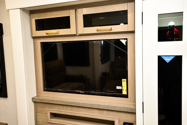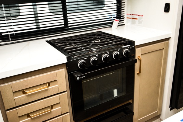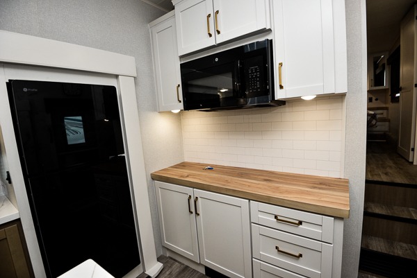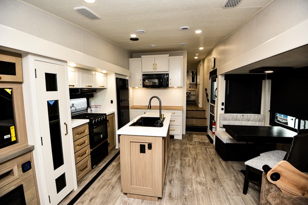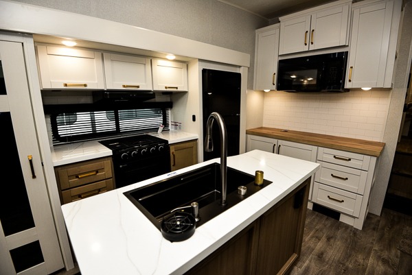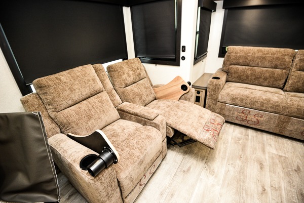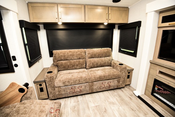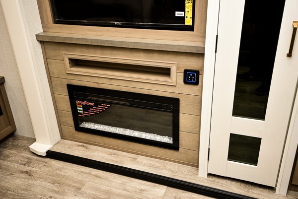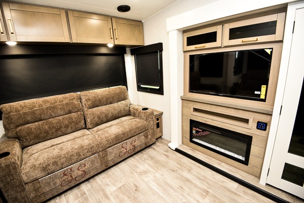 You will love how much interior space you have in this fifth wheel thanks to the dual opposing slides in the combined kitchen and living area! While your crew is relaxing on the theater seat or tri-fold sofa, you can prepare dinner on the GE black and stainless 21" range. There is also an entertainment center and fireplace across from the theater seat for easy viewing, and the table and chairs with a bench will be the perfect place to play a board game at. Head to the front to enjoy the private bedroom with an Olympic queen bed, and the full bath is close by for easy nighttime use!