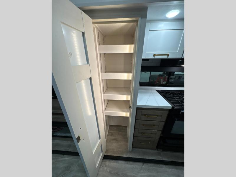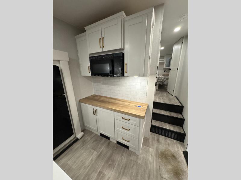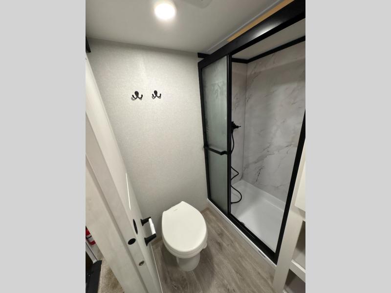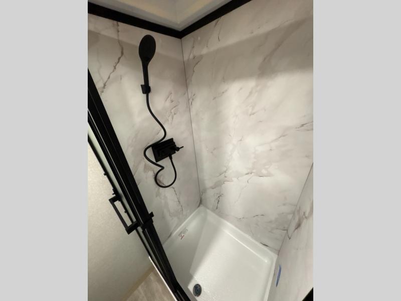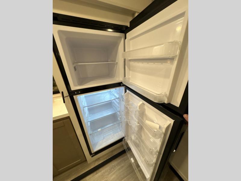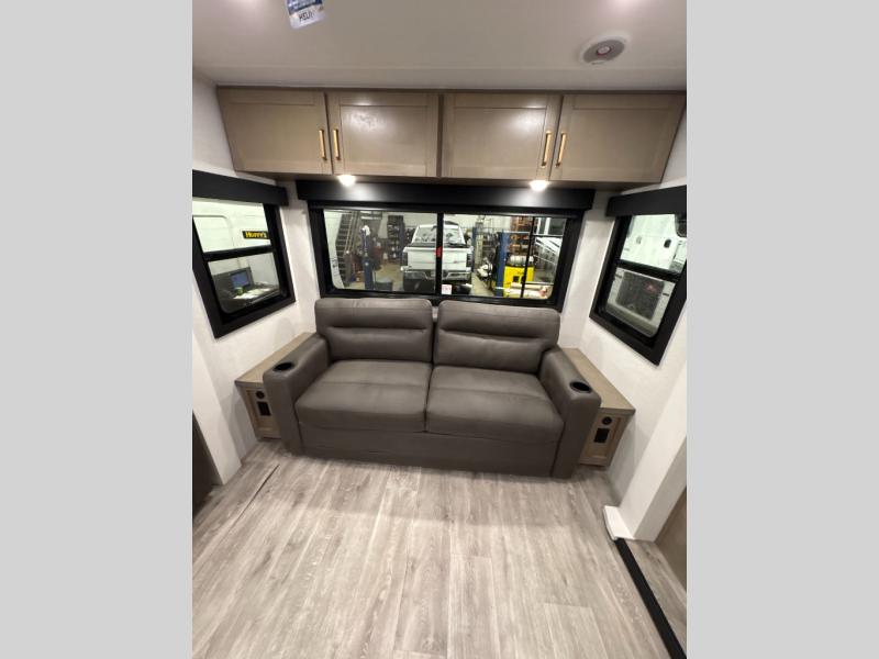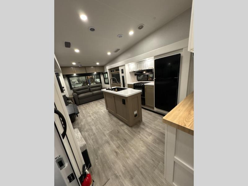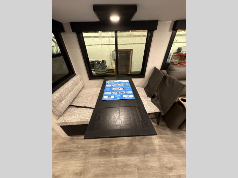 You will love how much interior space you have in this fifth wheel thanks to the dual opposing slides in the combined kitchen and living area! While your crew is relaxing on the theater seat or tri-fold sofa, you can prepare dinner on the GE black and stainless 21" range. There is also an entertainment center and fireplace across from the theater seat for easy viewing, and the table and chairs with a bench will be the perfect place to play a board game at. Head to the front to enjoy the private bedroom with an Olympic queen bed, and the full bath is close by for easy nighttime use!