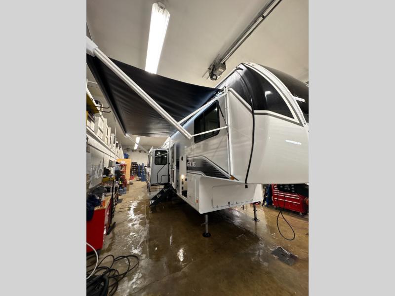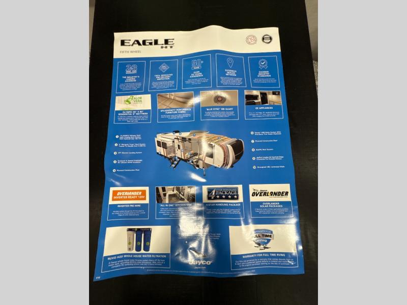 With any Eagle HT fifth wheel or travel trailer by Jayco you will enjoy a smooth drive thanks to the 4 Star Handling Package and MORryde CRE-3000 rubberized suspension. The Customer Value Package includes amenities that are sure to make camping easier than ever, like the 60K on-demand water heater, Keyed-Alike lock system, 15,000 BTU "Whisper Quiet" A/C, and more. Handcrafted door/drawer fronts will make your space feel more like home, along with residential vinyl flooring throughout, GE appliances, and blackout roller shades with reflective side throughout to keep the sun out when you want to sleep in. Each model also includes a NuVo H2O water treatment system with filters included, interior and exterior "Blue Sync" audio connect with MB Quart Sound for your TV and phone, and 100% no floor vents for added comfort and convenience!