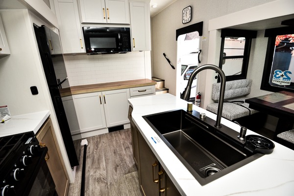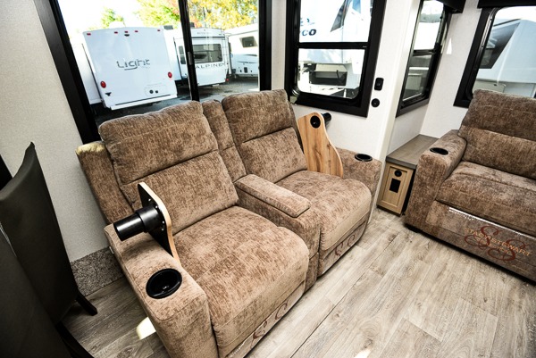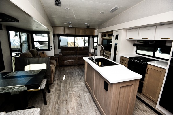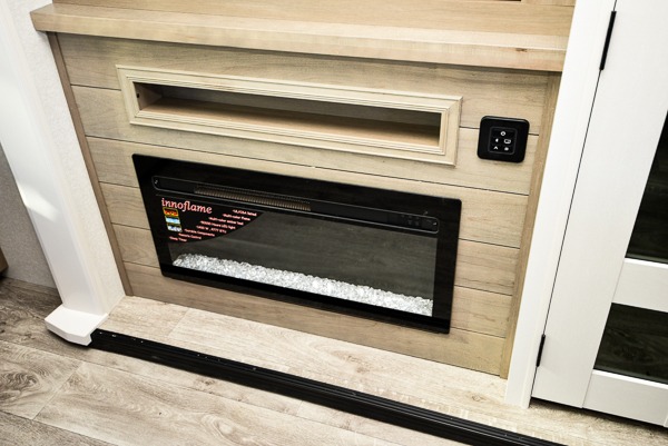 Pack your bags and head off on adventure in this spacious fifth wheel for four! The dual opposing slides in the kitchen and main living area will give your crew more space to relax. Speaking of relaxing, there is a theater seat across from the fireplace and TV plus a tri-fold sofa to make it a movie night. This unit includes a kitchen island with an All-In-One sink for easy cleaning, a hutch with added storage, plus a GE 10 cu. ft. 12V refrigerator. The front master bedroom includes an Olympic queen bed, dual wardrobes plus a third wardrobe within the bedroom slide out, and TV prep if you want the option to watch a show in bed!