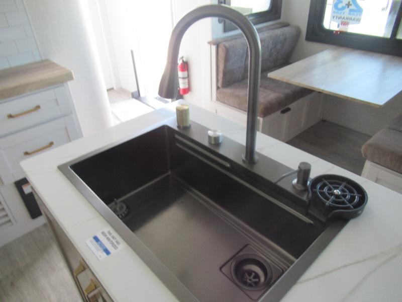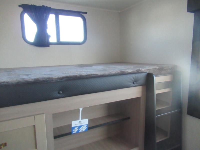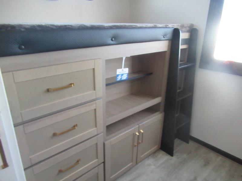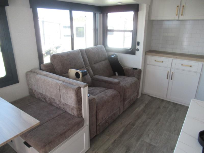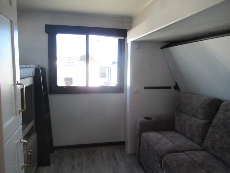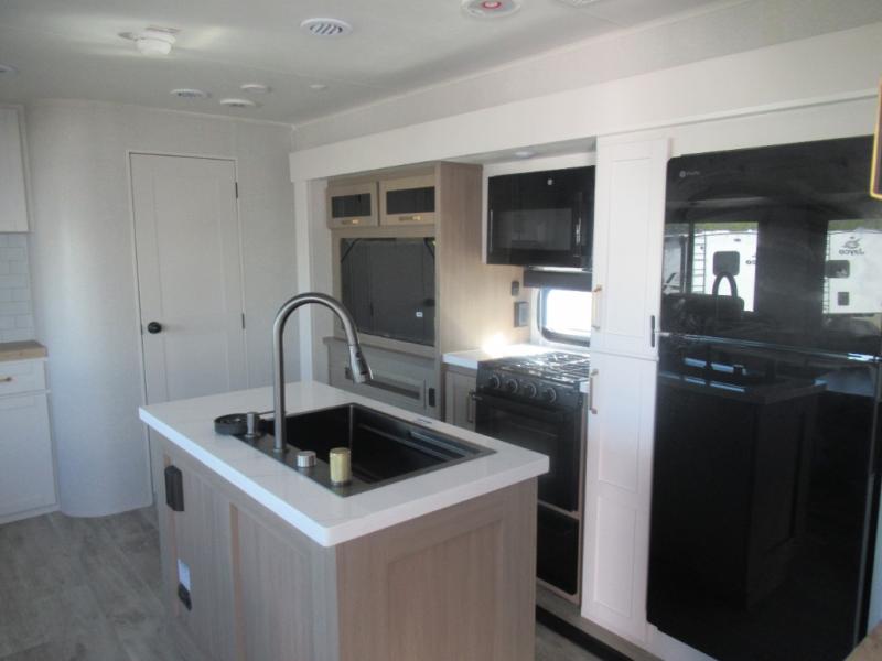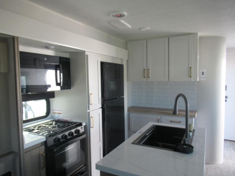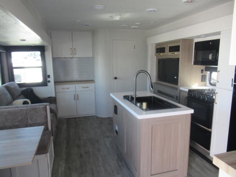 This travel trailer is perfect for your larger group or family! There is a rear private bunkhouse with two bunks, a tri-fold sofa, plus a slide out for more space. You will have the front private bedroom all to yourselves with a queen bed, and any other guests can sleep on the tri-fold sofa and booth dinette! There is also a wardrobe/linen closet with washer and dryer prep if you plan to add a washer and dyer for convenience. The chef can prepare their best meals with the kitchen island and will enjoy having two hutches to store the essentials. They could even cook at the outside kitchen to breathe in some fresh air and enjoy the beautiful scenery!