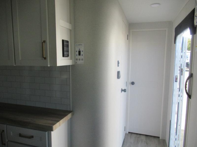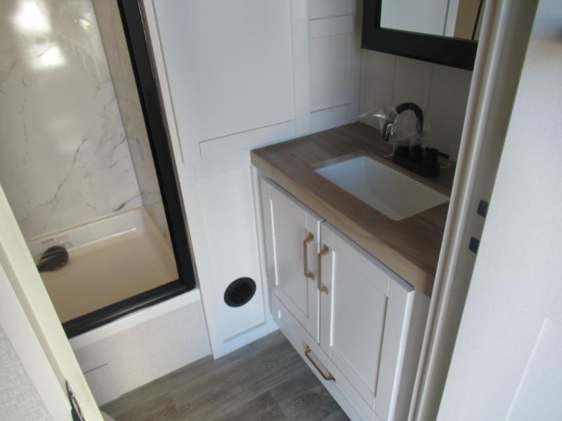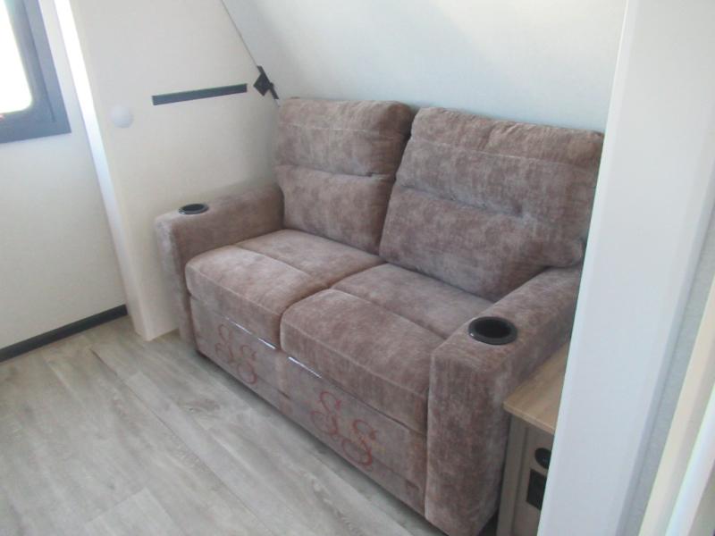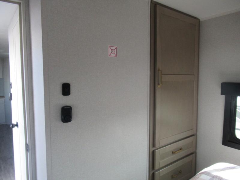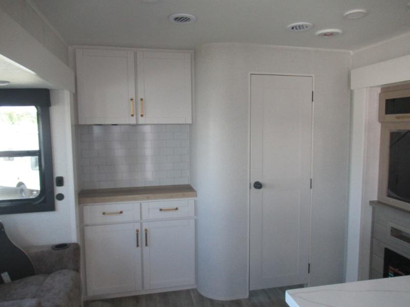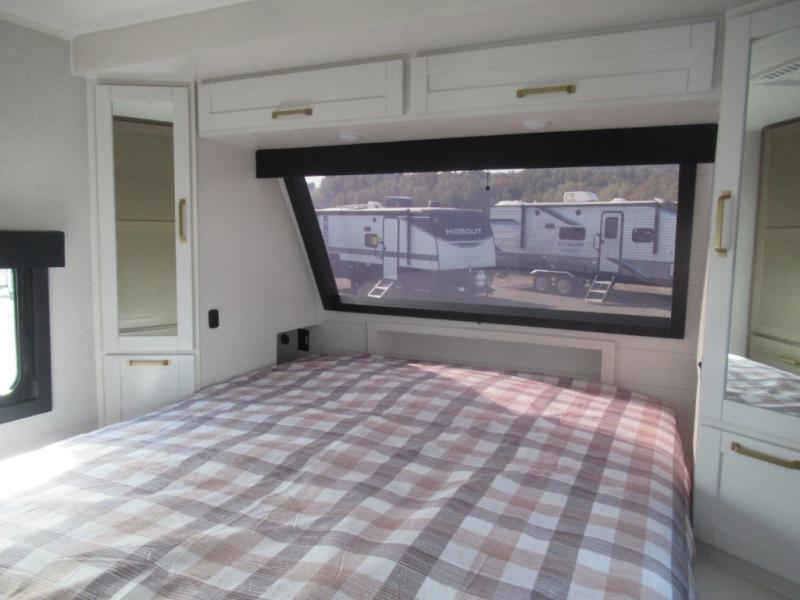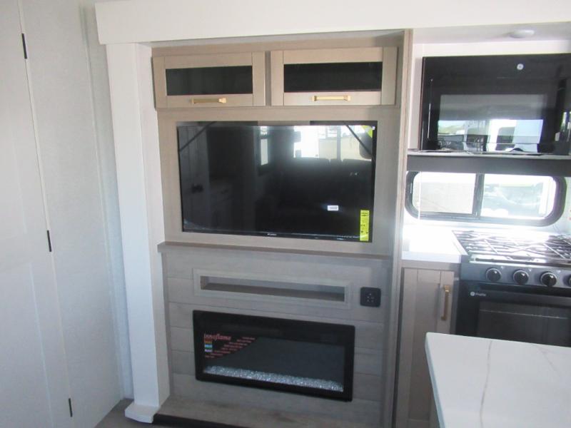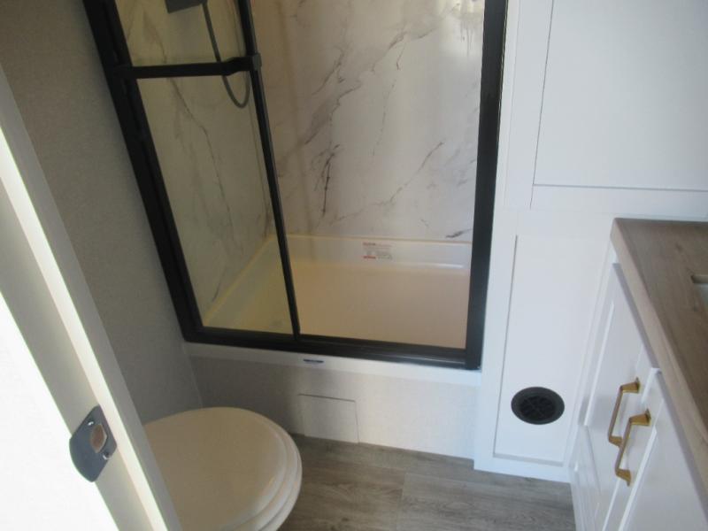 This travel trailer is perfect for your larger group or family! There is a rear private bunkhouse with two bunks, a tri-fold sofa, plus a slide out for more space. You will have the front private bedroom all to yourselves with a queen bed, and any other guests can sleep on the tri-fold sofa and booth dinette! There is also a wardrobe/linen closet with washer and dryer prep if you plan to add a washer and dyer for convenience. The chef can prepare their best meals with the kitchen island and will enjoy having two hutches to store the essentials. They could even cook at the outside kitchen to breathe in some fresh air and enjoy the beautiful scenery!