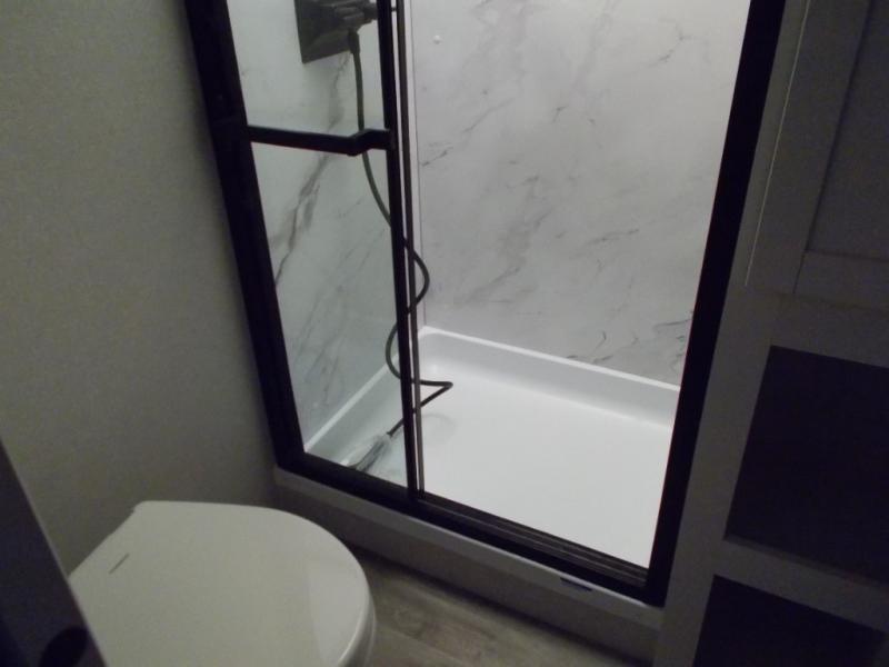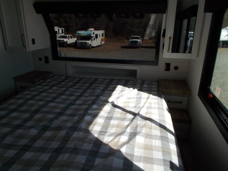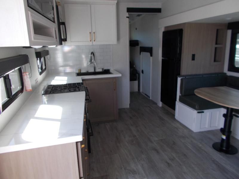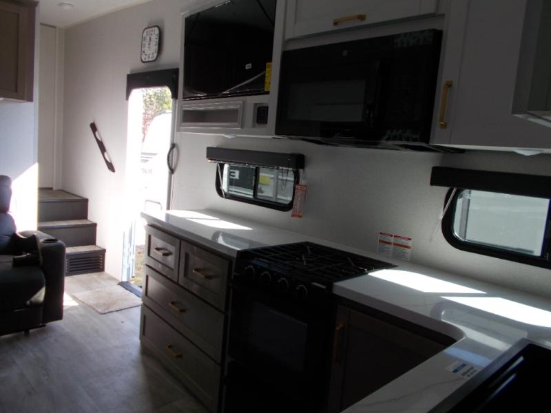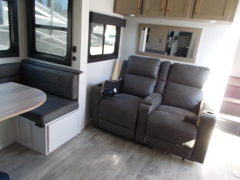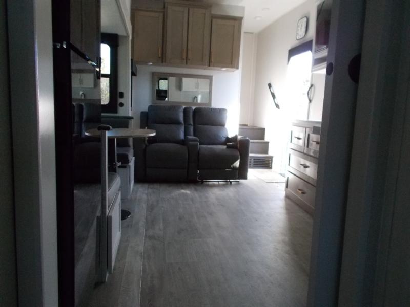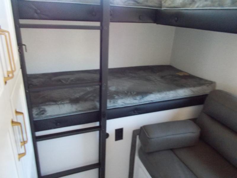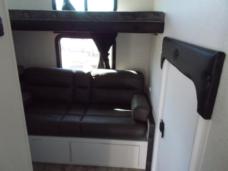 This fifth wheel is not only packed with amenities, but it can sleep up to eight people each night for fun camping trips! The rear private bunkhouse includes bunk beds plus a third bunk above a jack-knife sofa, and there is a bike storage door here so you can easily pack in gear. You can claim the front private bedroom all to yourselves with an Olympic bed, a wardrobe slide plus a second wardrobe with washer and dryer prep. Everyone can come together in the combined kitchen and living room that features a U-shaped dinette across from the TV and a theater seat for added comfort!