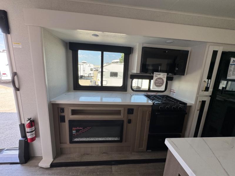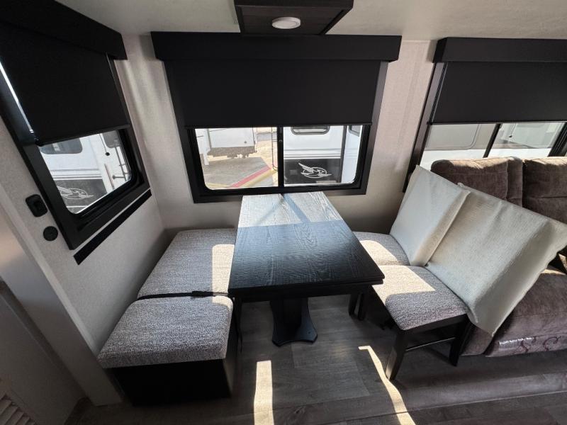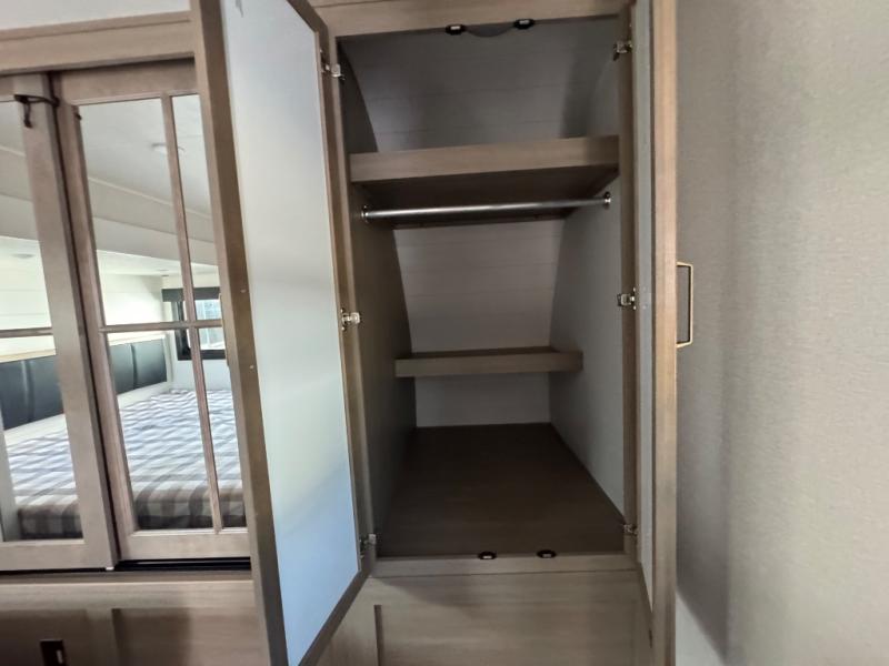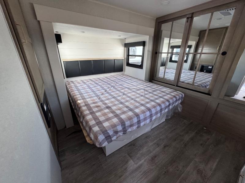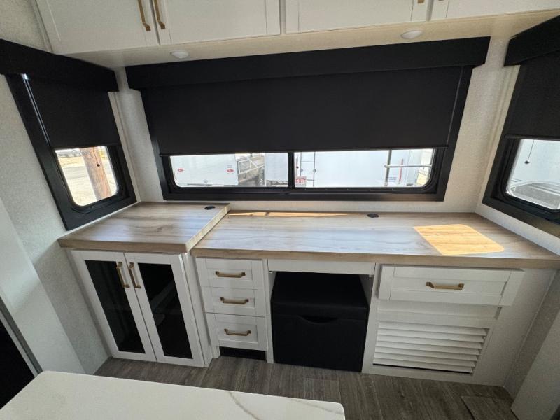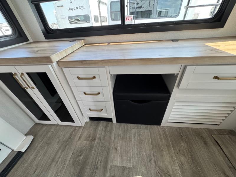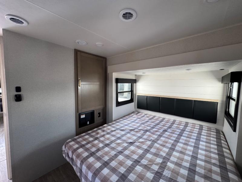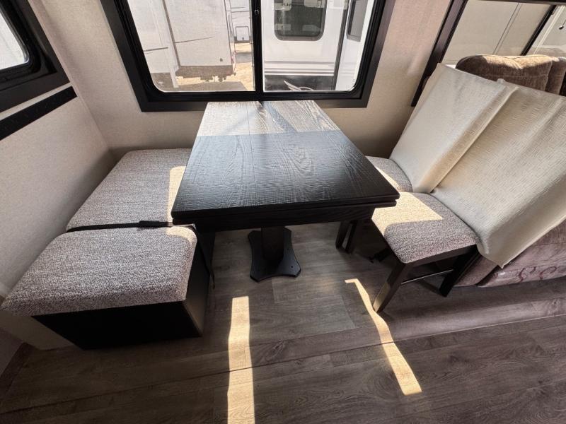 You will feel right at home camping in this travel trailer! It features a front private bedroom with an Olympic queen bed slide for more interior space, a dresser, a front wardrobe to hang your clothes, and a wardrobe with washer and dryer prep. Start each morning getting squeaky clean in the full bathroom with the shower, then head to the kitchen to fry up some eggs on the stainless steel range. The kitchen island provides more counter space to prep meals, and there are two pantries for dry goods and snacks. There is also a table and chairs with a bench seat plus a tri-fold sofa within the large slide out. And a desk with a bench seat lets you get some work done!