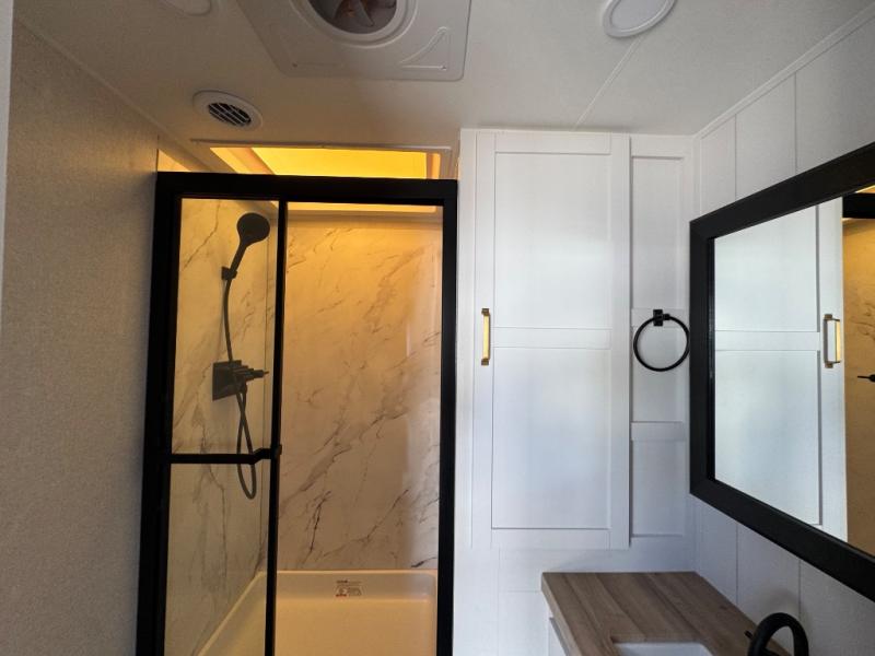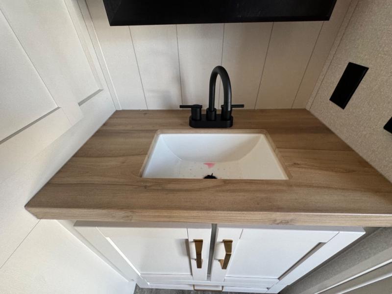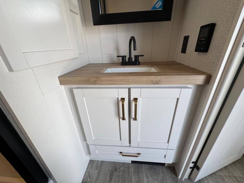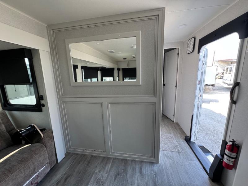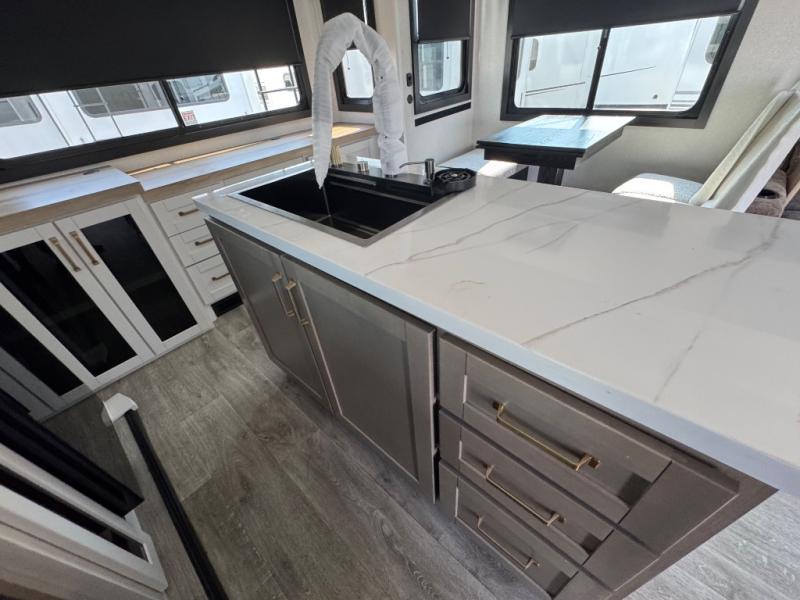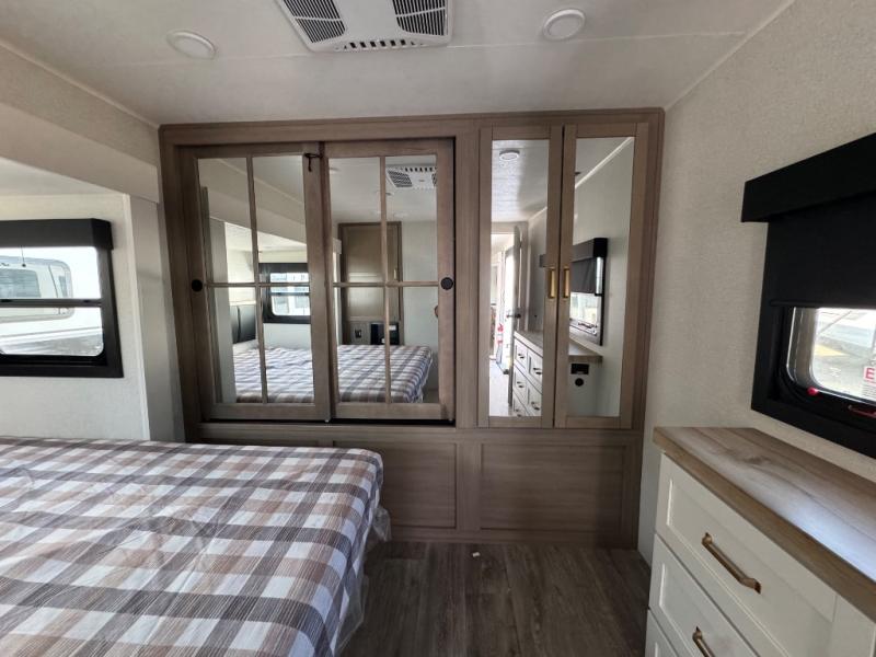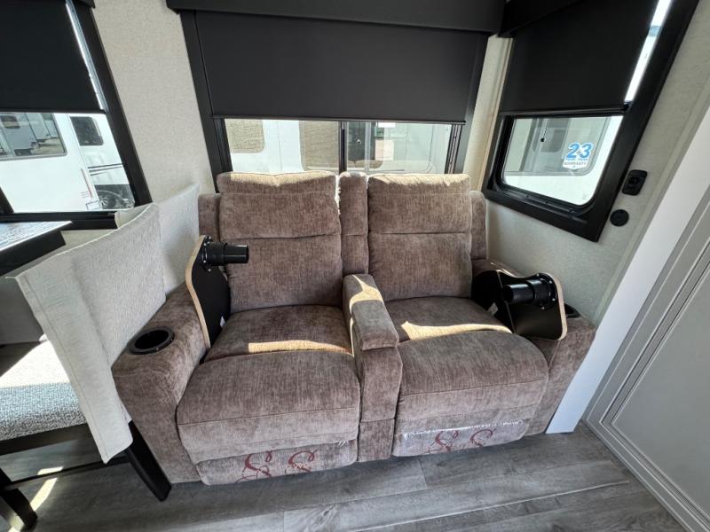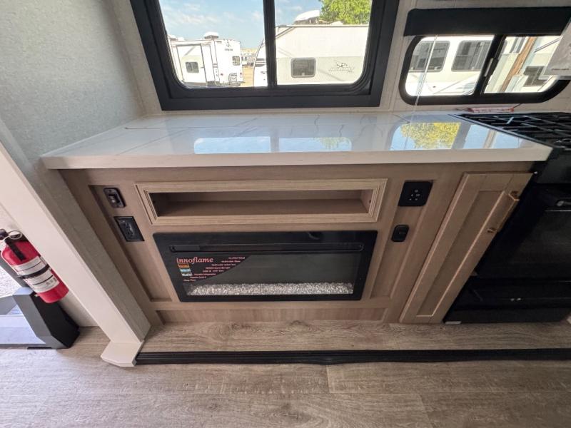 You will feel right at home camping in this travel trailer! It features a front private bedroom with an Olympic queen bed slide for more interior space, a dresser, a front wardrobe to hang your clothes, and a wardrobe with washer and dryer prep. Start each morning getting squeaky clean in the full bathroom with the shower, then head to the kitchen to fry up some eggs on the stainless steel range. The kitchen island provides more counter space to prep meals, and there are two pantries for dry goods and snacks. There is also a table and chairs with a bench seat plus a tri-fold sofa within the large slide out. And a desk with a bench seat lets you get some work done!