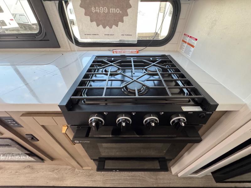 With any Eagle HT fifth wheel or travel trailer by Jayco you will enjoy a smooth drive thanks to the 4 Star Handling Package and MORryde CRE-3000 rubberized suspension. The Customer Value Package includes amenities that are sure to make camping easier than ever, like the 60K on-demand water heater, Keyed-Alike lock system, 15,000 BTU "Whisper Quiet" A/C, and more. Handcrafted door/drawer fronts will make your space feel more like home, along with residential vinyl flooring throughout, GE appliances, and blackout roller shades with reflective side throughout to keep the sun out when you want to sleep in. Each model also includes a NuVo H2O water treatment system with filters included, interior and exterior "Blue Sync" audio connect with MB Quart Sound for your TV and phone, and 100% no floor vents for added comfort and convenience!